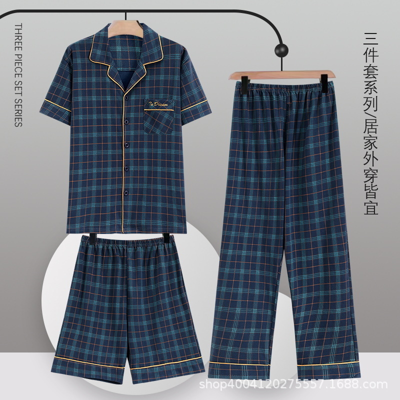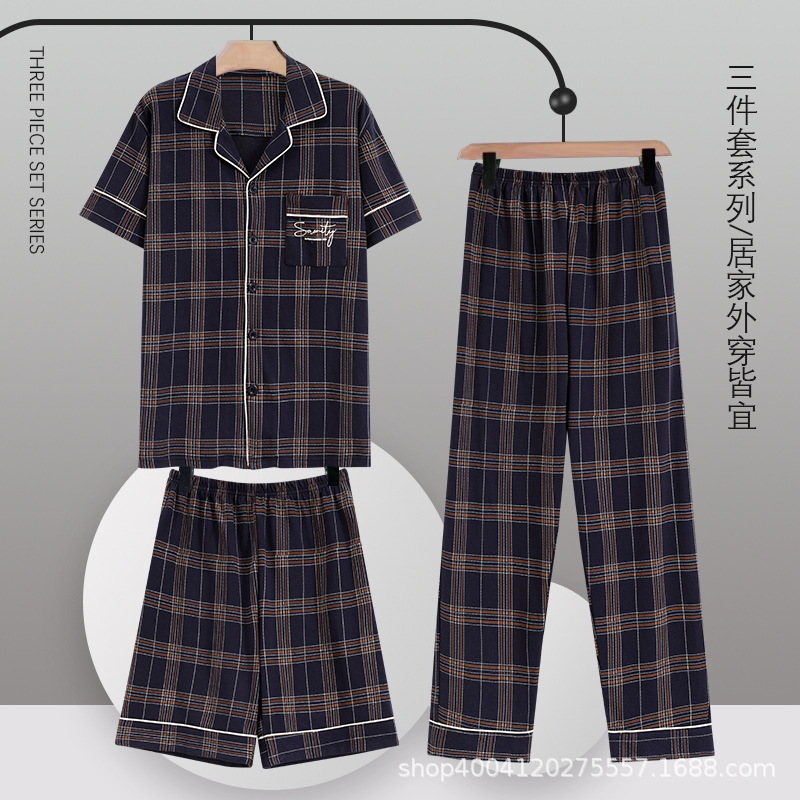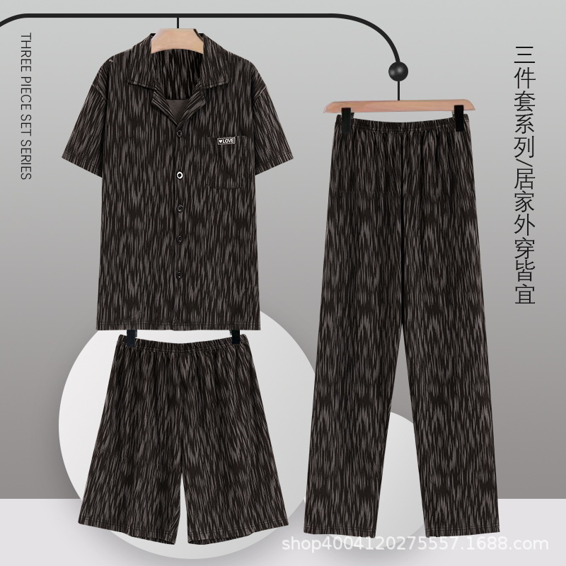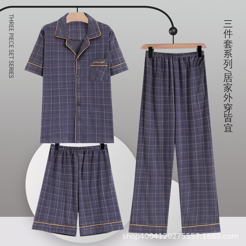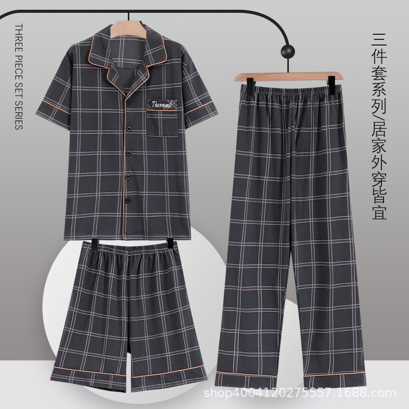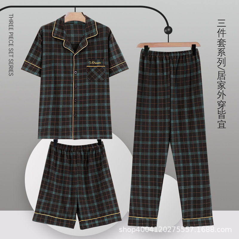면 남성 잠옷 3 조각 반팔 바지 바지 캐주얼 카디건 플러스 사이즈 외부 옷 세트 입고스토어 가기
