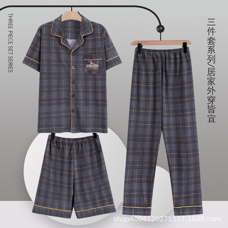 면 남성 잠옷 3 조각 반팔 바지 바지 캐주얼 카디건 플러스 사이즈 외부 옷 세트 입고