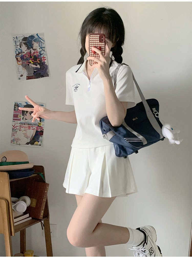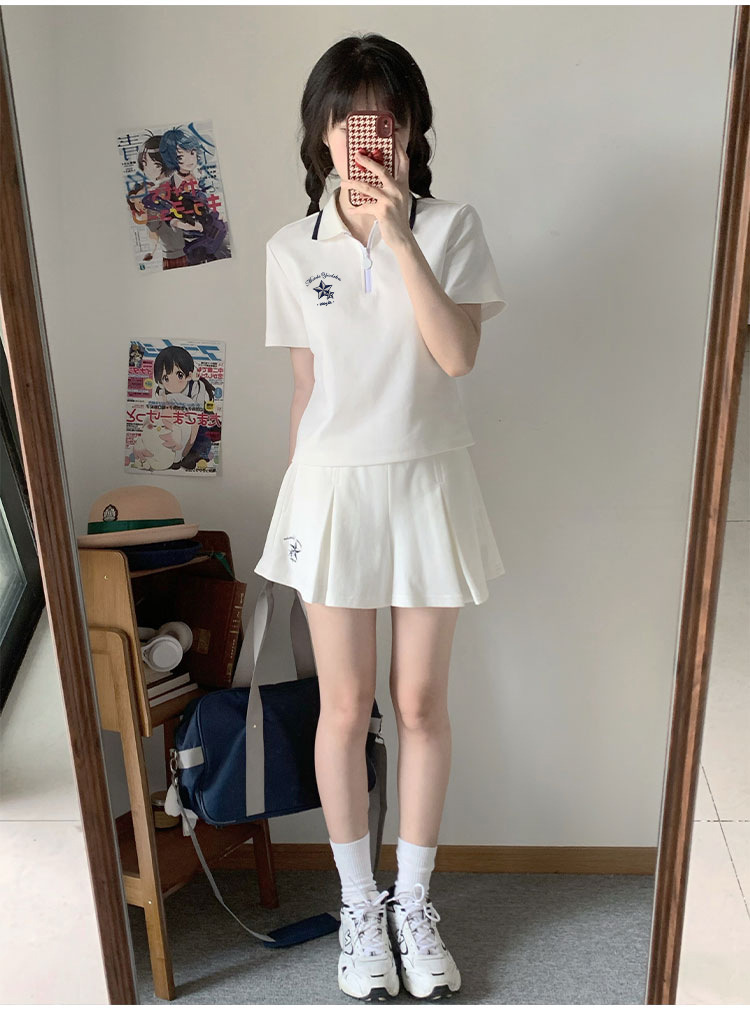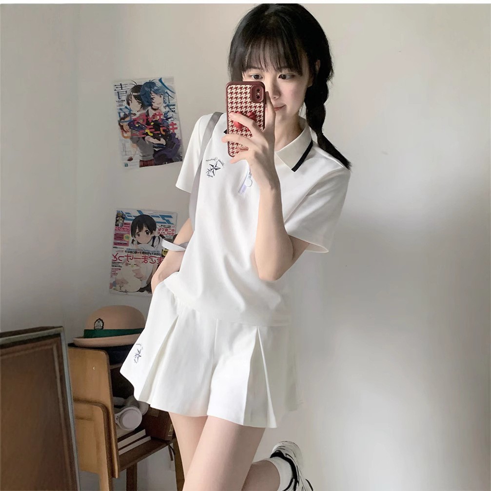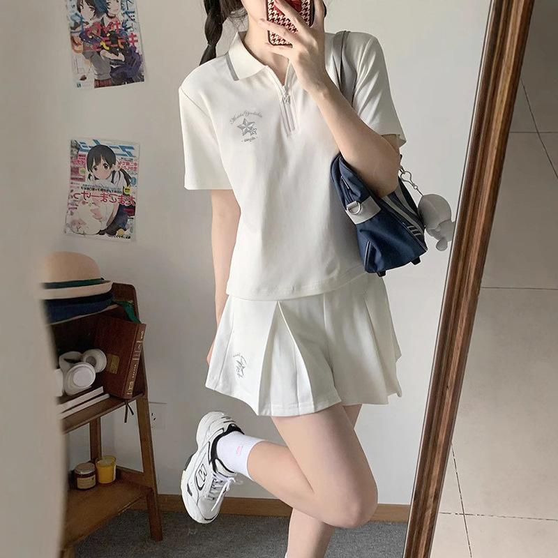스포츠웨어 주름 짧은 치마 세트 소녀의 여름 2025 새로운 중학교 고등학교 고등학생 폴로 칼라 원피스스토어 가기