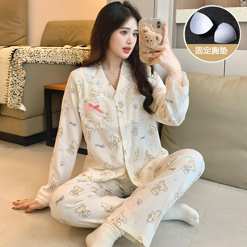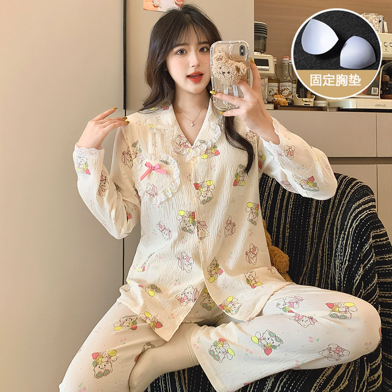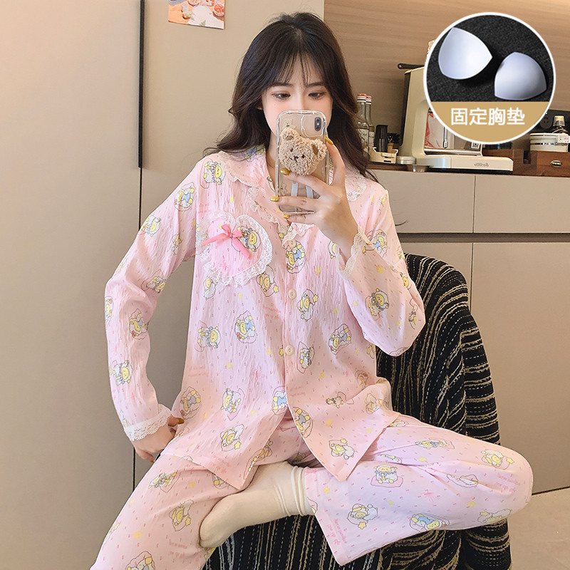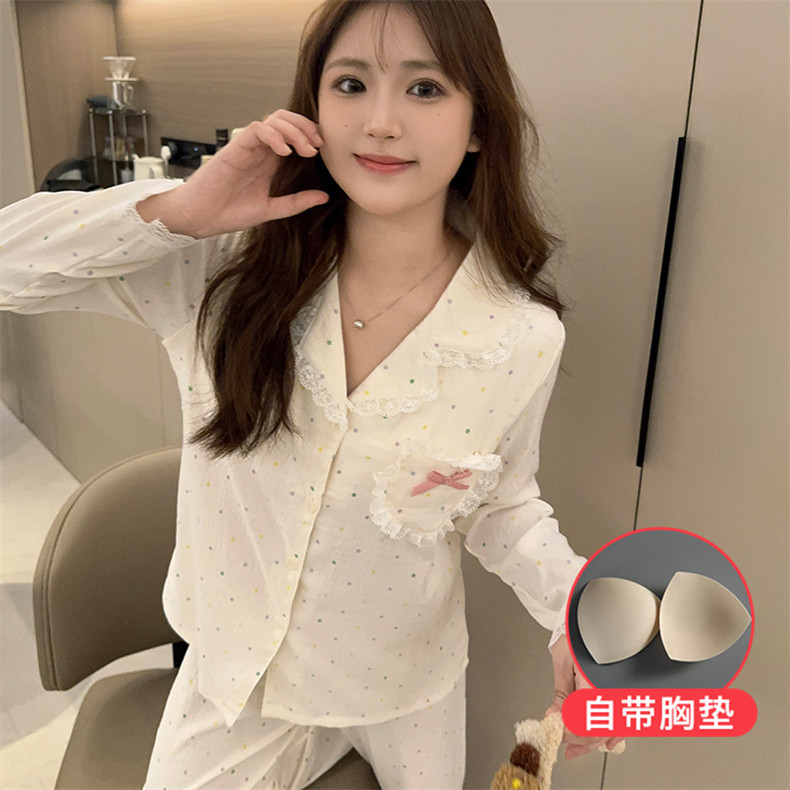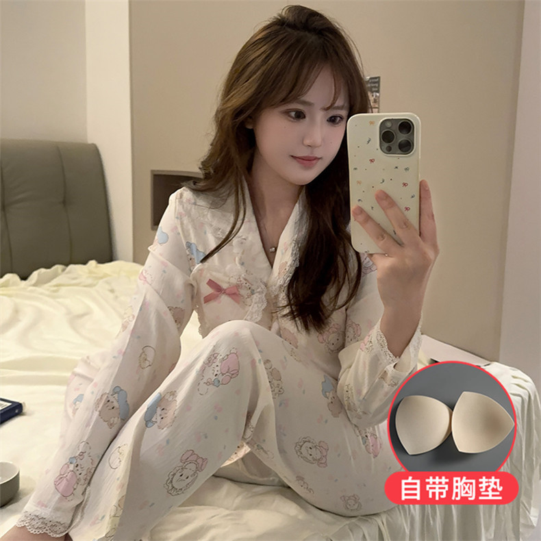 잠옷 여성의 봄 새로운 구름 코튼 레이스 카디건 고정 가슴 패드 달콤한 귀여운 한국 스타일 소녀의 홈 옷스토어 가기