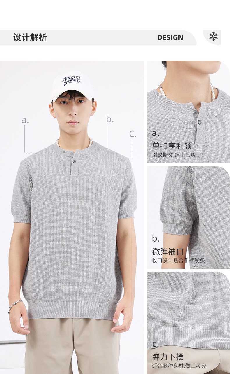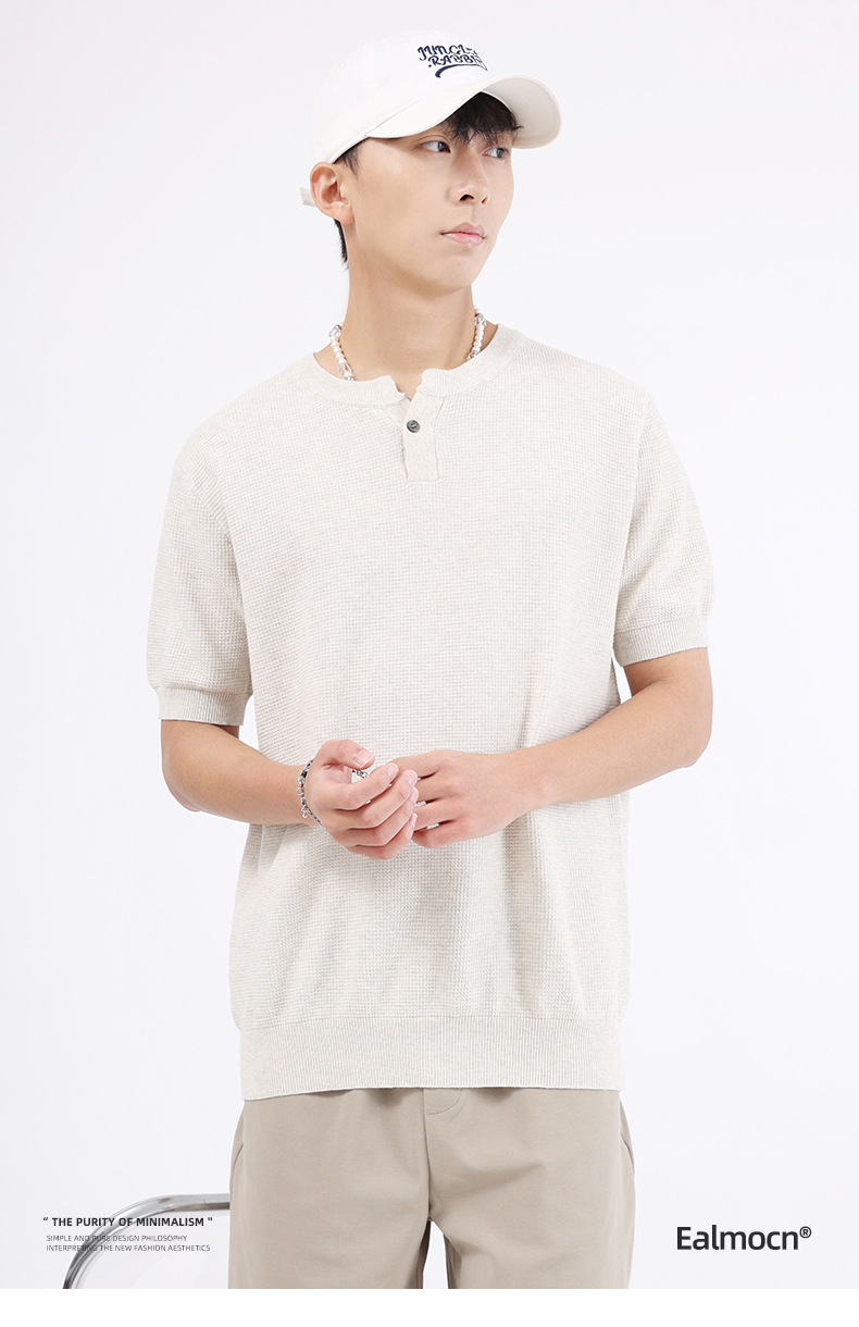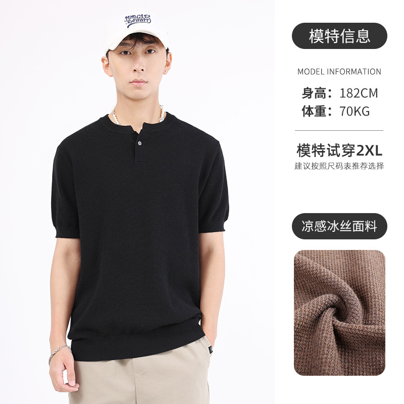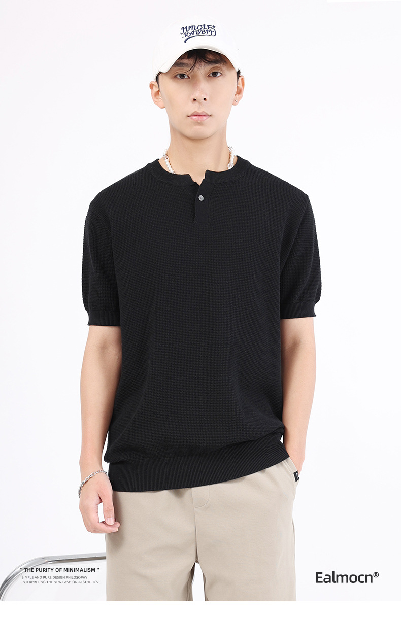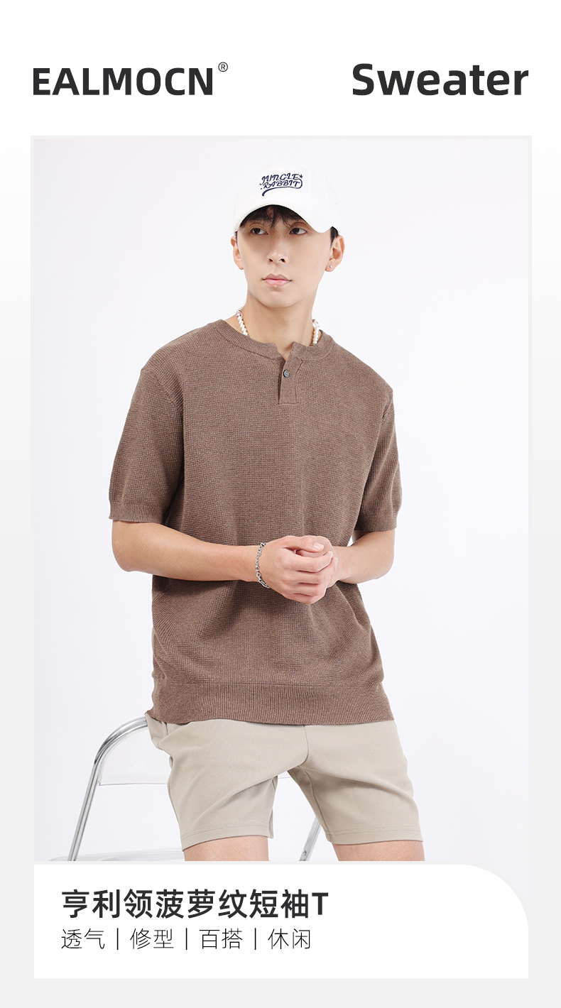 남성용 파인애플 패턴 헨리넥 니트 반팔 티셔츠 남성 여름용 고급스럽고 고급스러운 캐주얼 남성용 상의