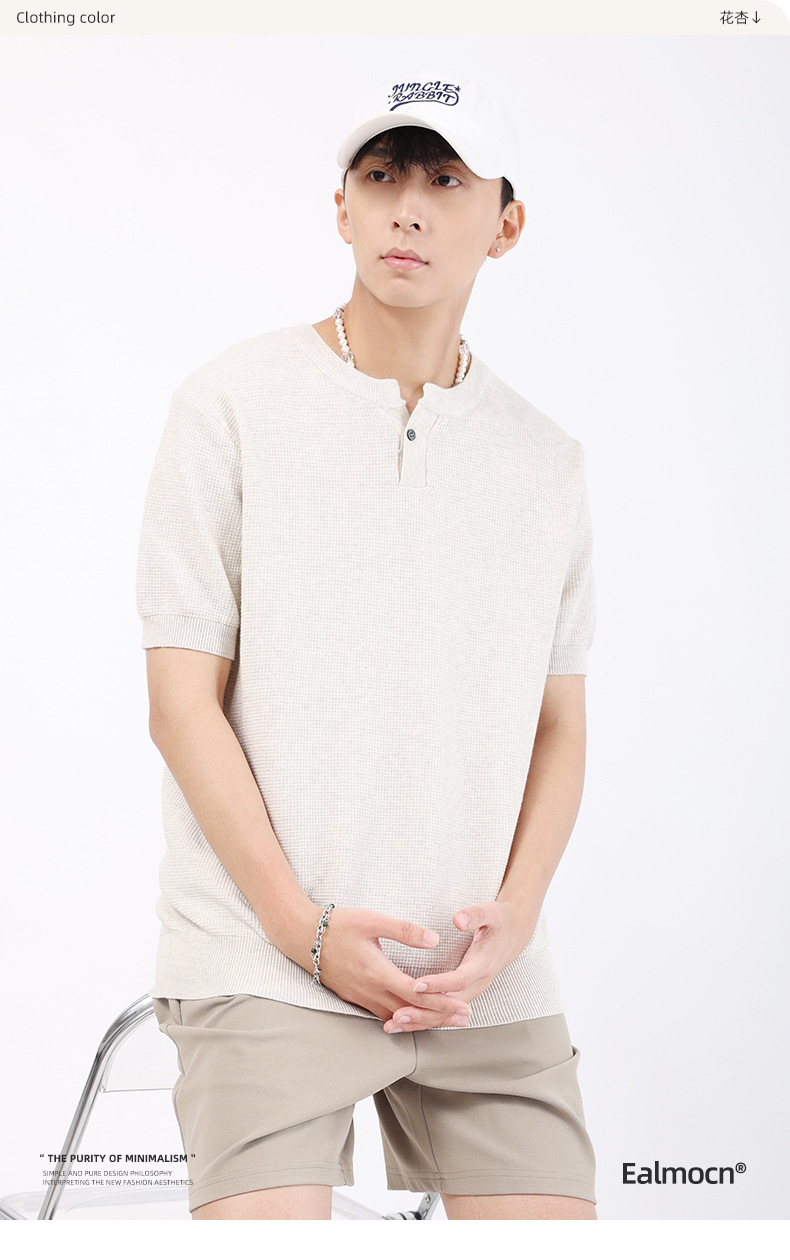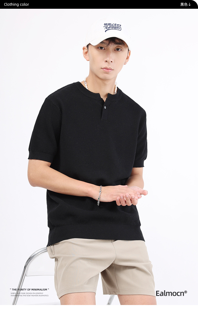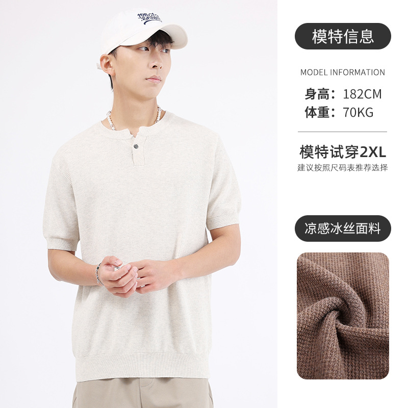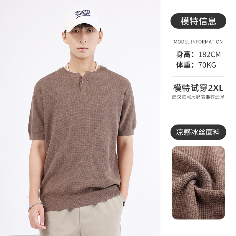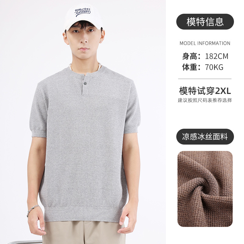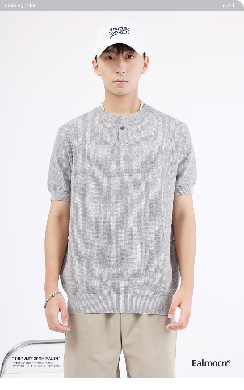 남성용 파인애플 패턴 헨리넥 니트 반팔 티셔츠 남성 여름용 고급스럽고 고급스러운 캐주얼 남성용 상의