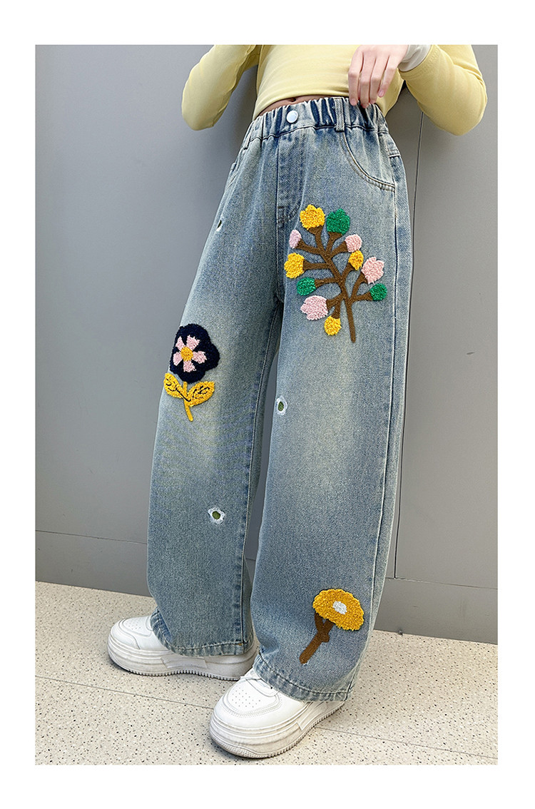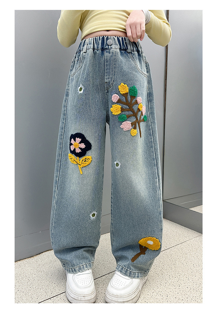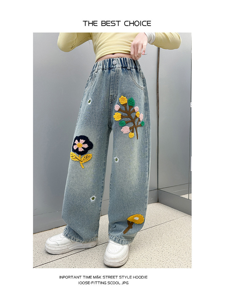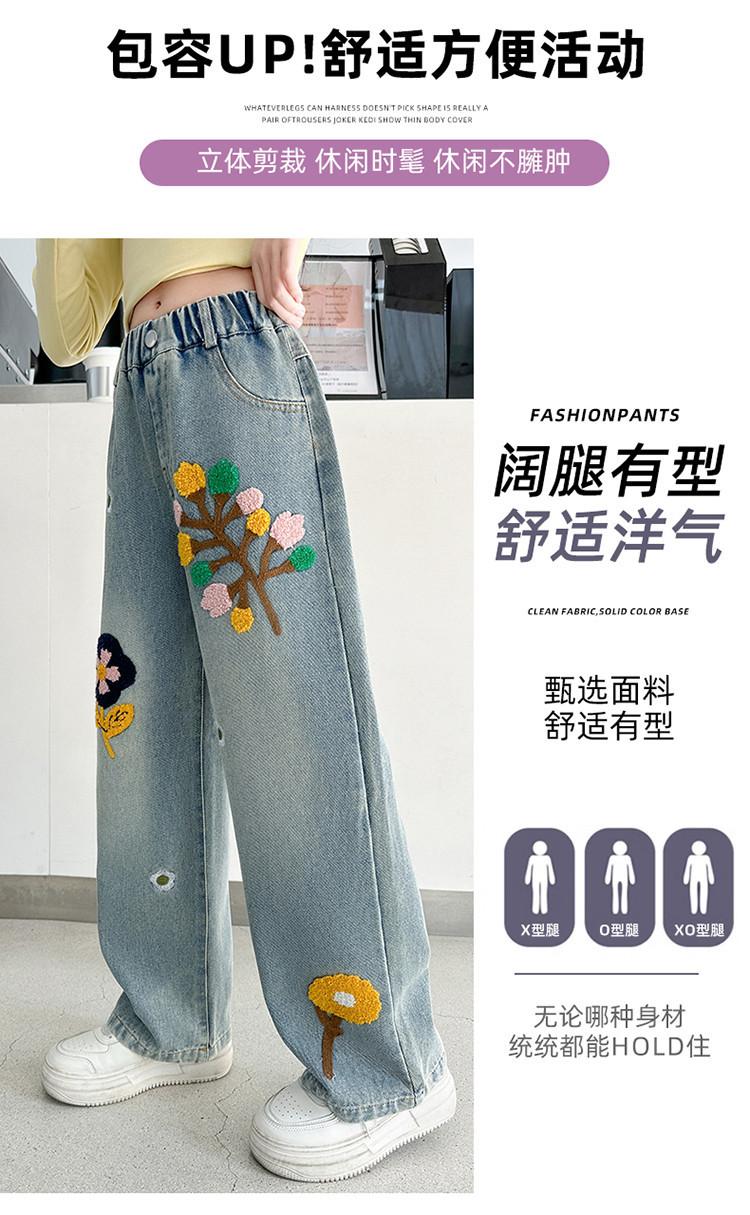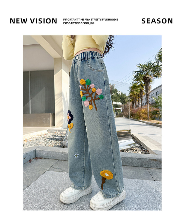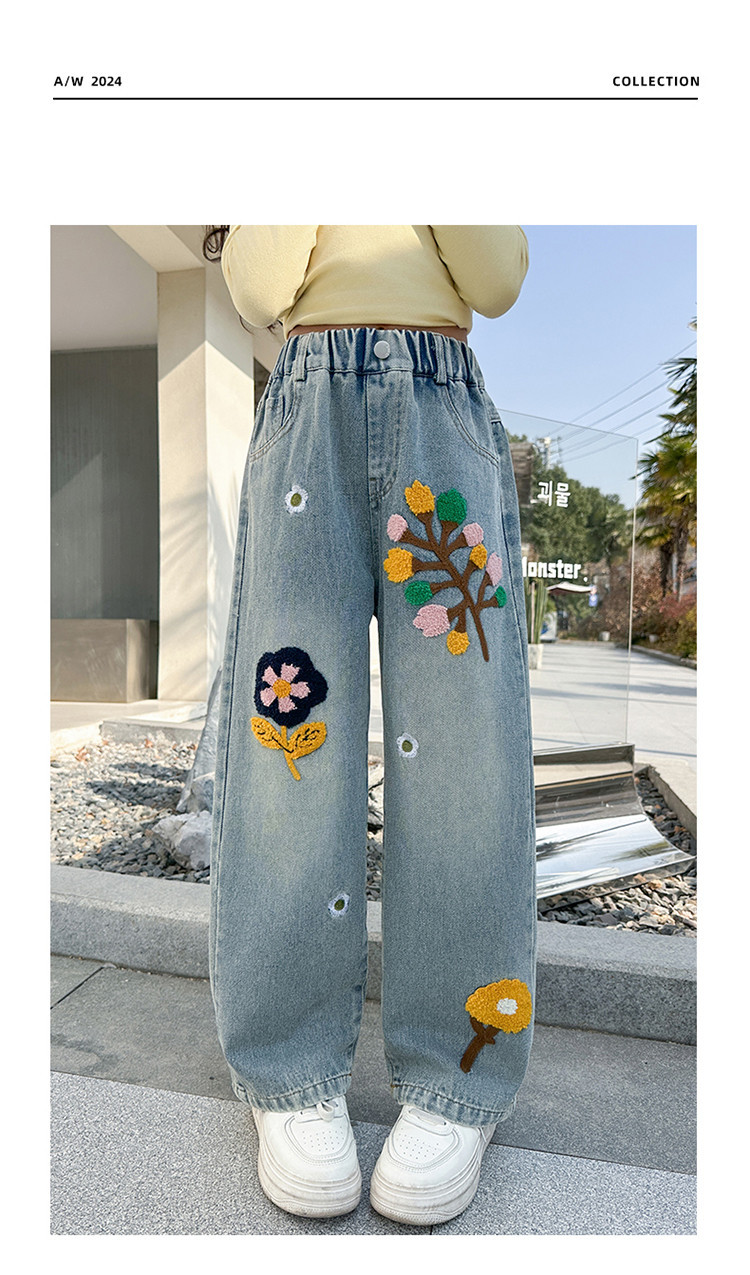 소녀 바지 봄과 가을 2025 새로운 어린이 봄 청바지 큰 소년과 소녀 봄 넓은 다리 바지스토어 가기
