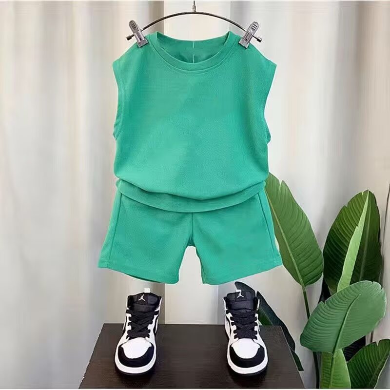 단색 소년의 민소매 캐주얼 스포츠 세트 2025 새로운 유행 의상 조끼 및 반바지 세트 트렌디