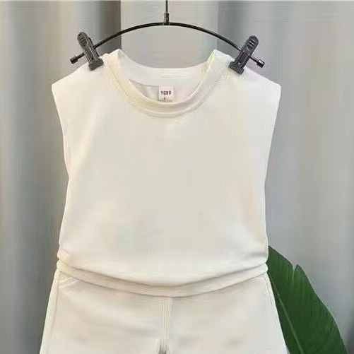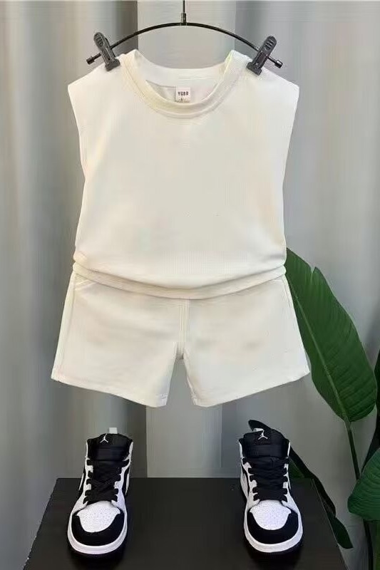 단색 소년의 민소매 캐주얼 스포츠 세트 2025 새로운 유행 의상 조끼 및 반바지 세트 트렌디스토어 가기