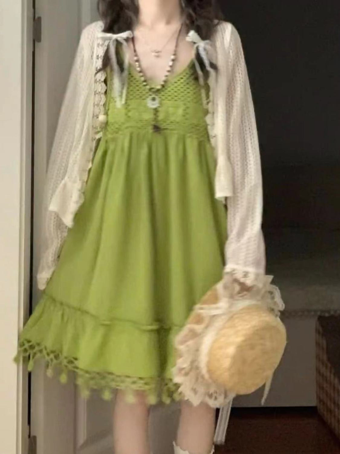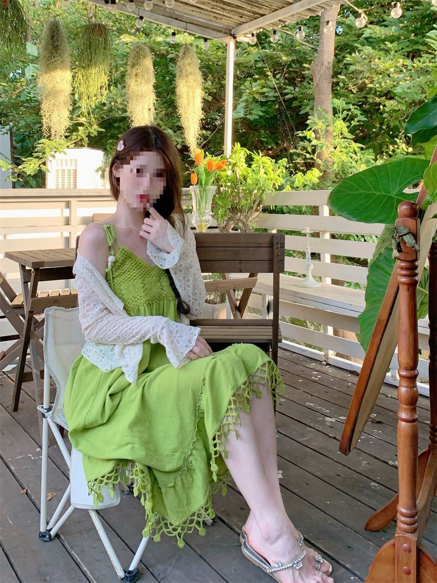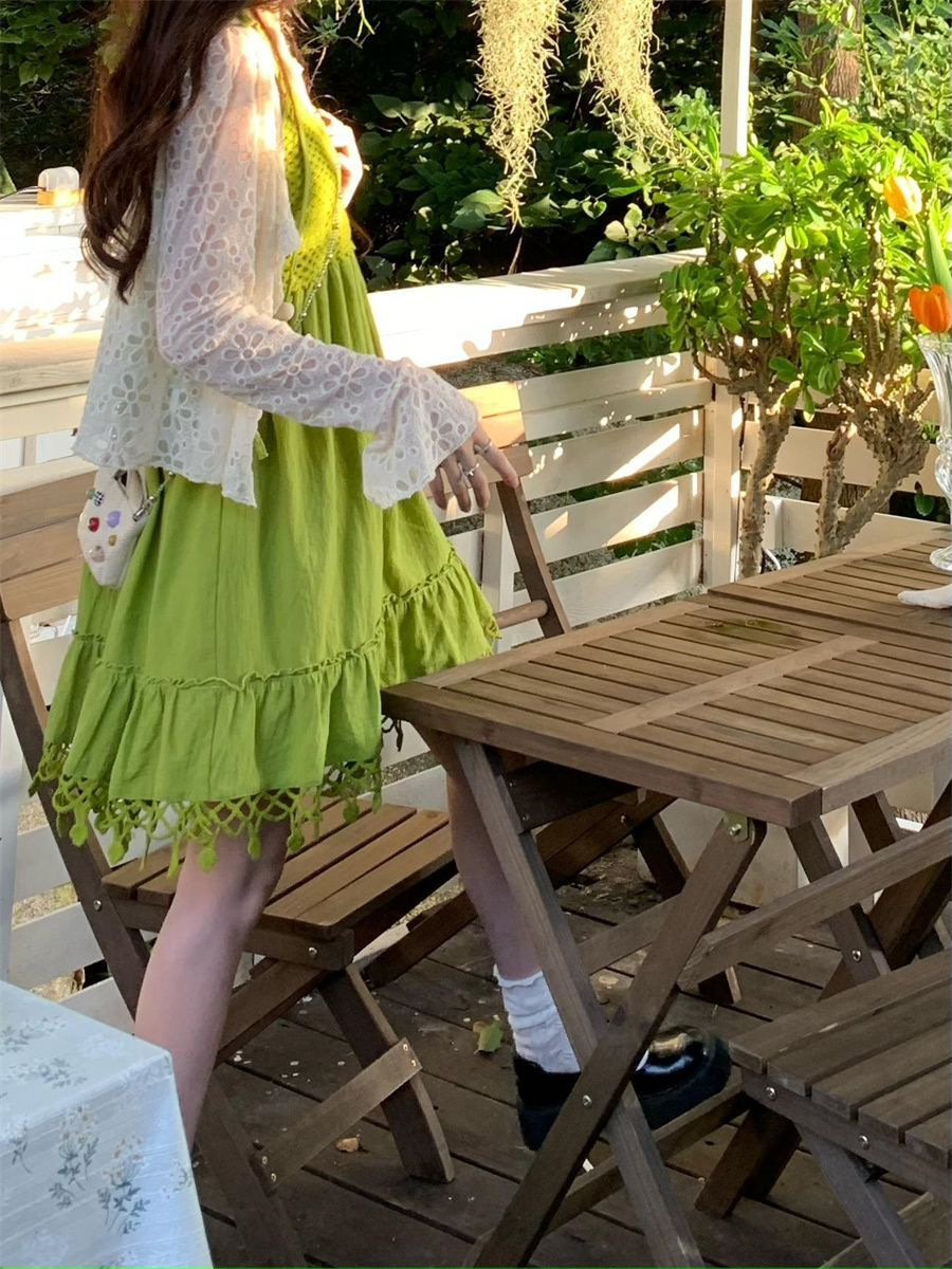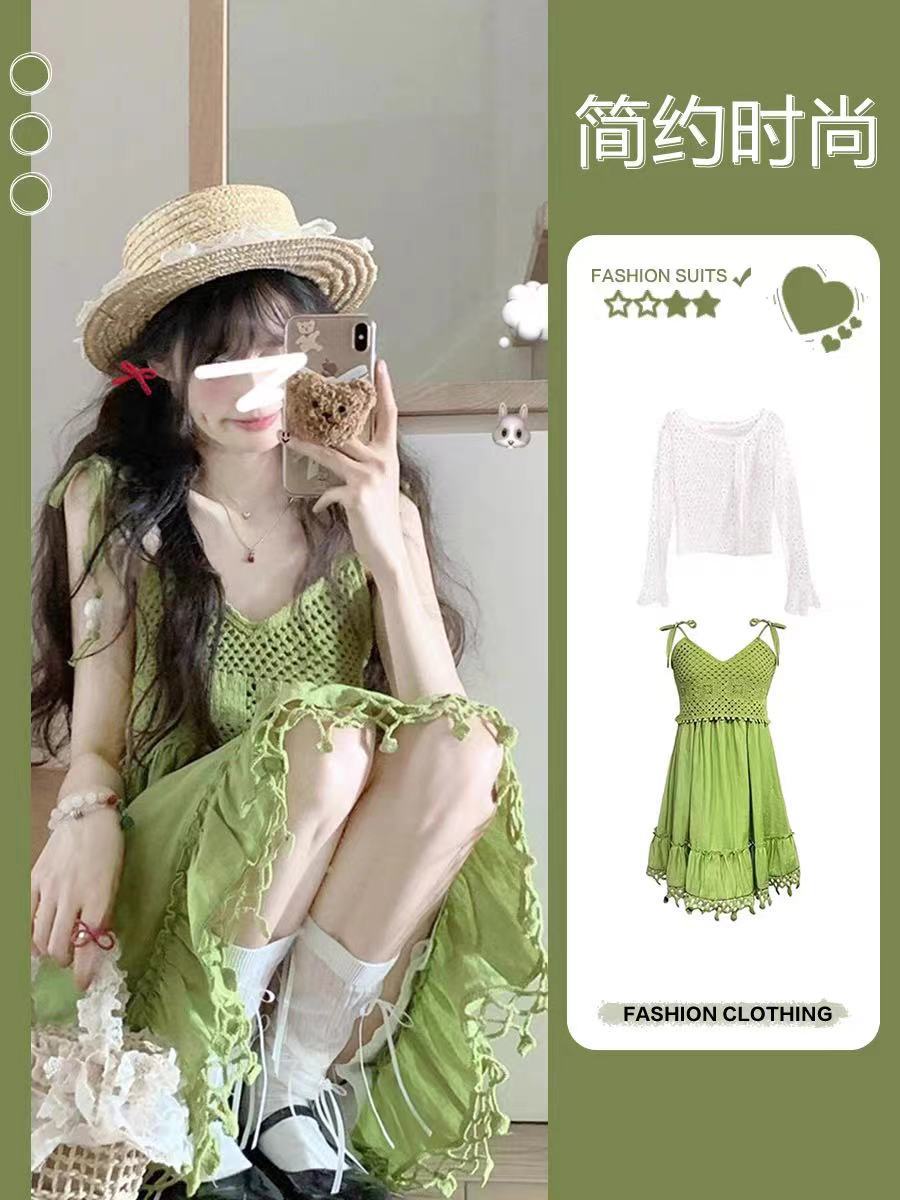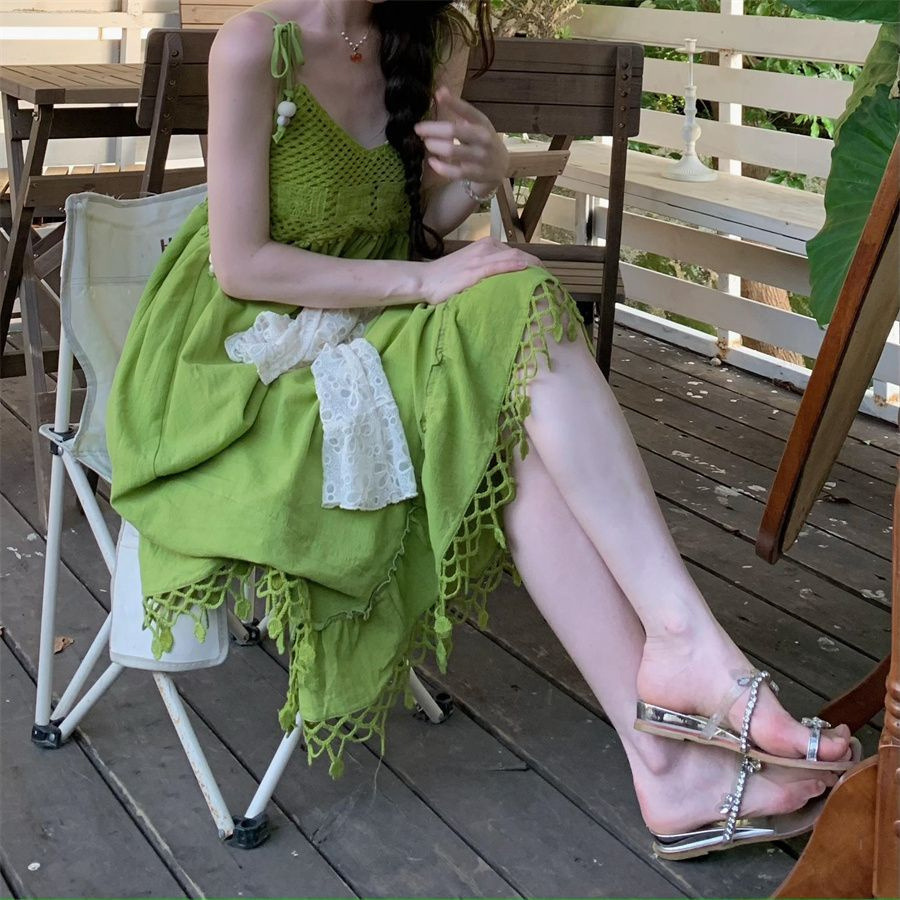 보헤미안 스타일 아큐라 그린 술 민소매 스트랩 원피스 여성 여름 인형 스커트 도파민 스커트스토어 가기