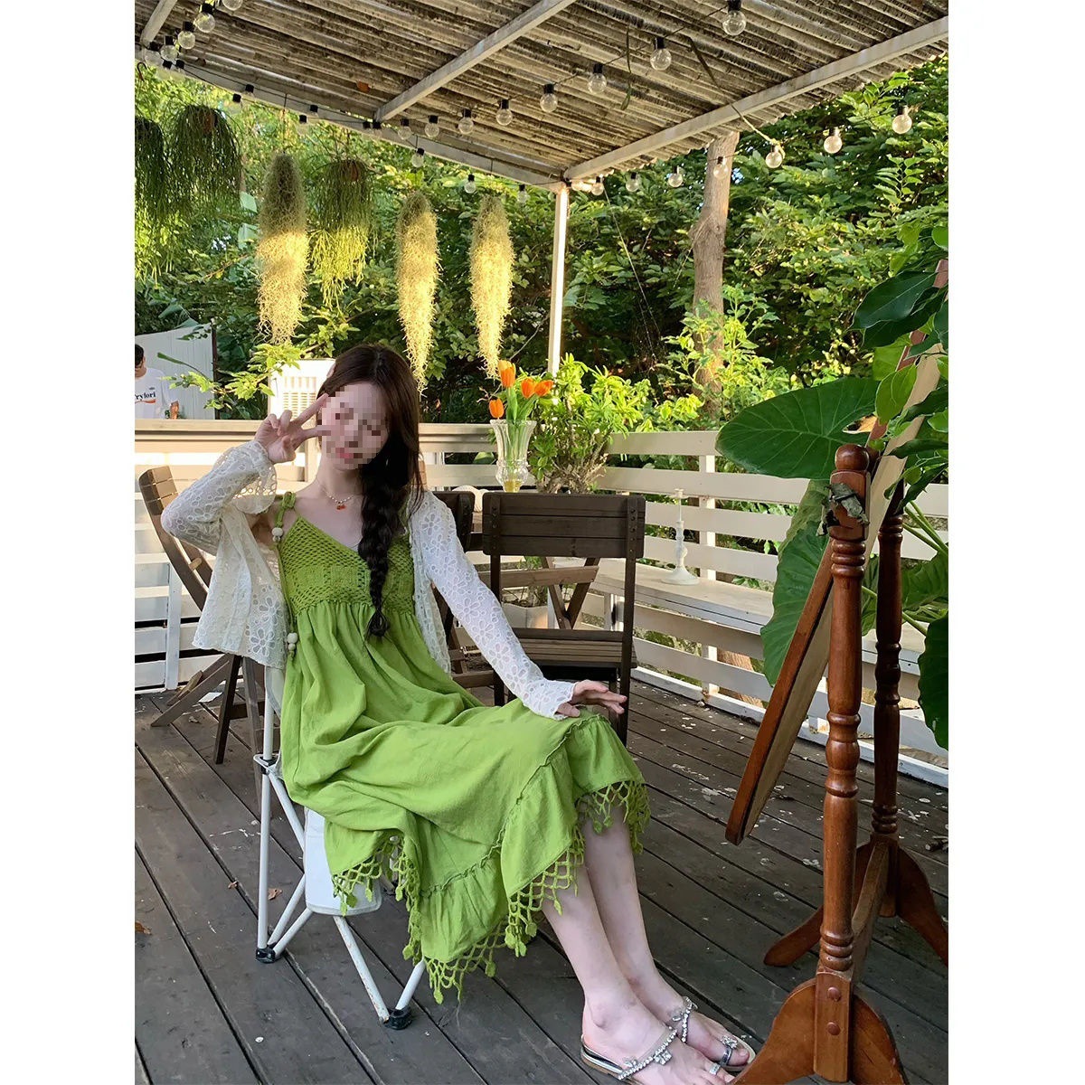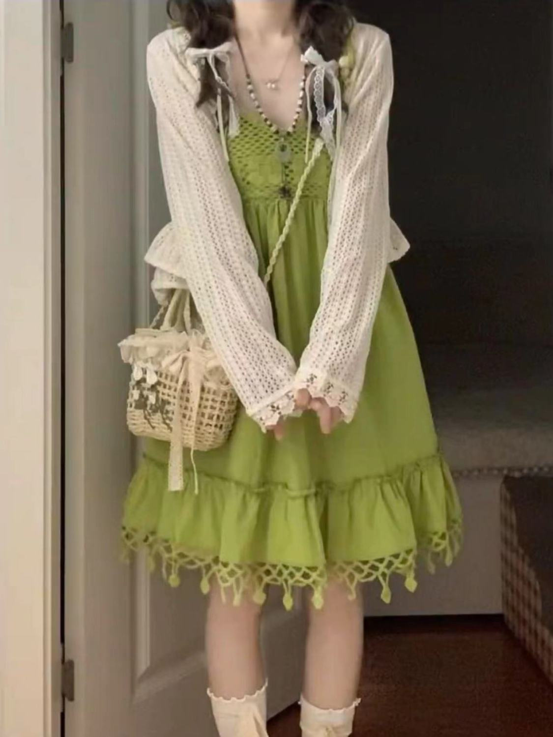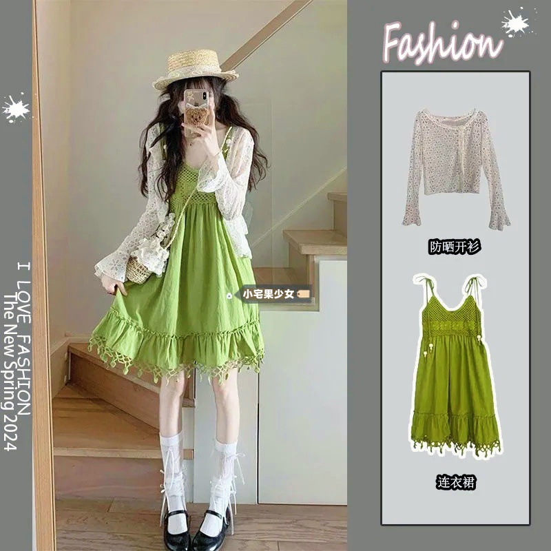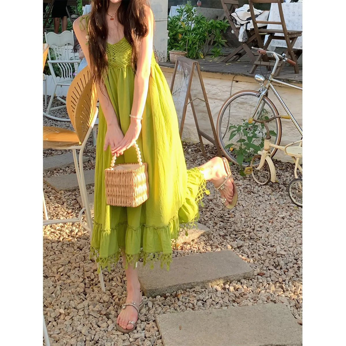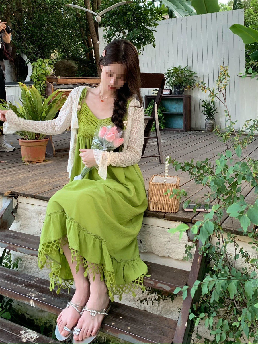보헤미안 스타일 아큐라 그린 술 민소매 스트랩 원피스 여성 여름 인형 스커트 도파민 스커트스토어 가기