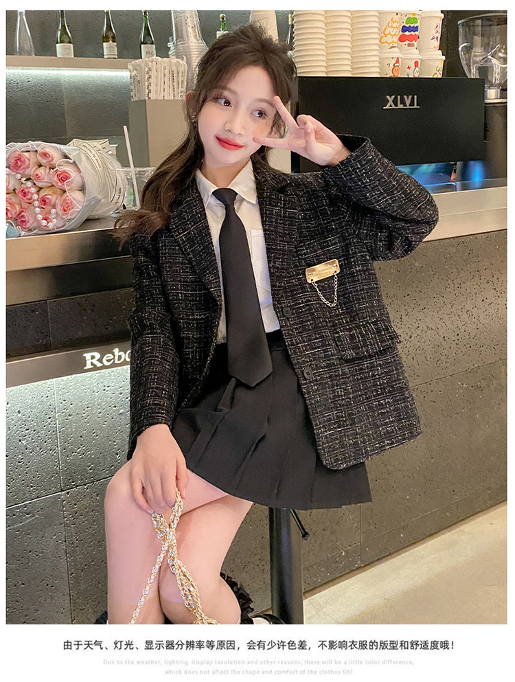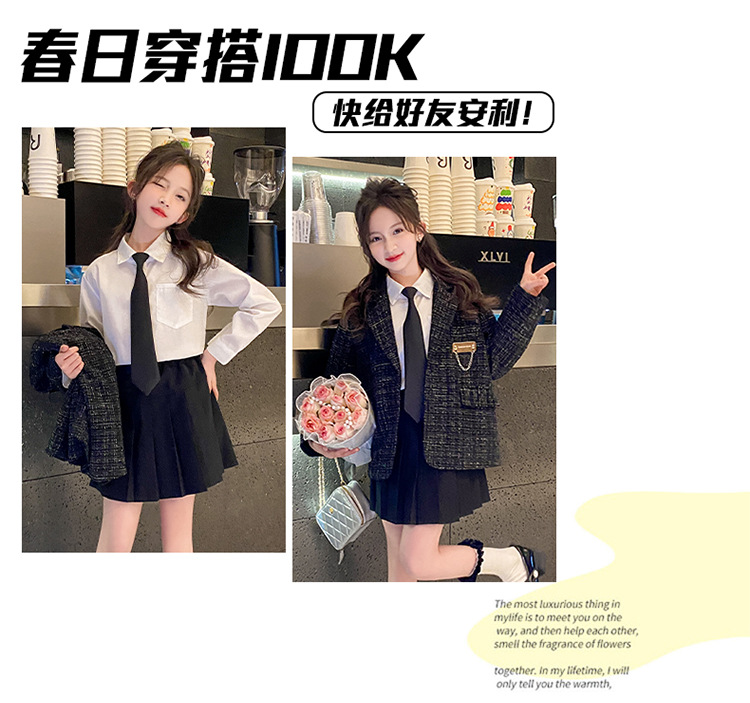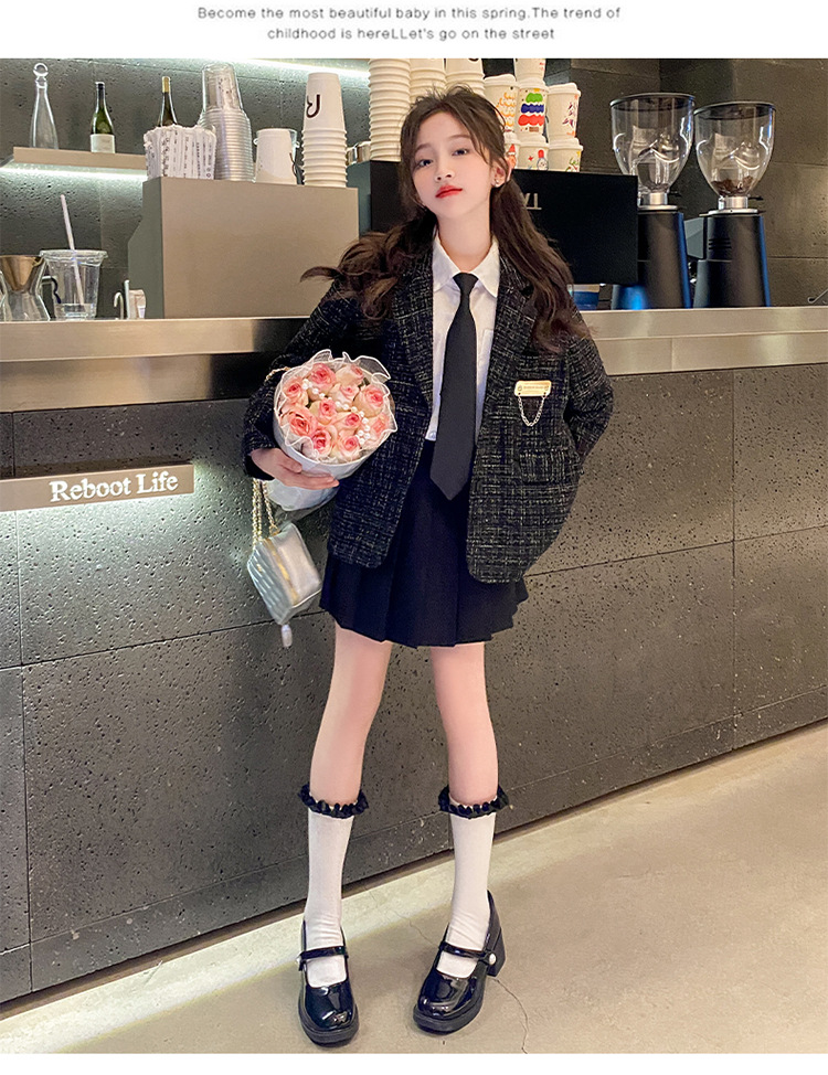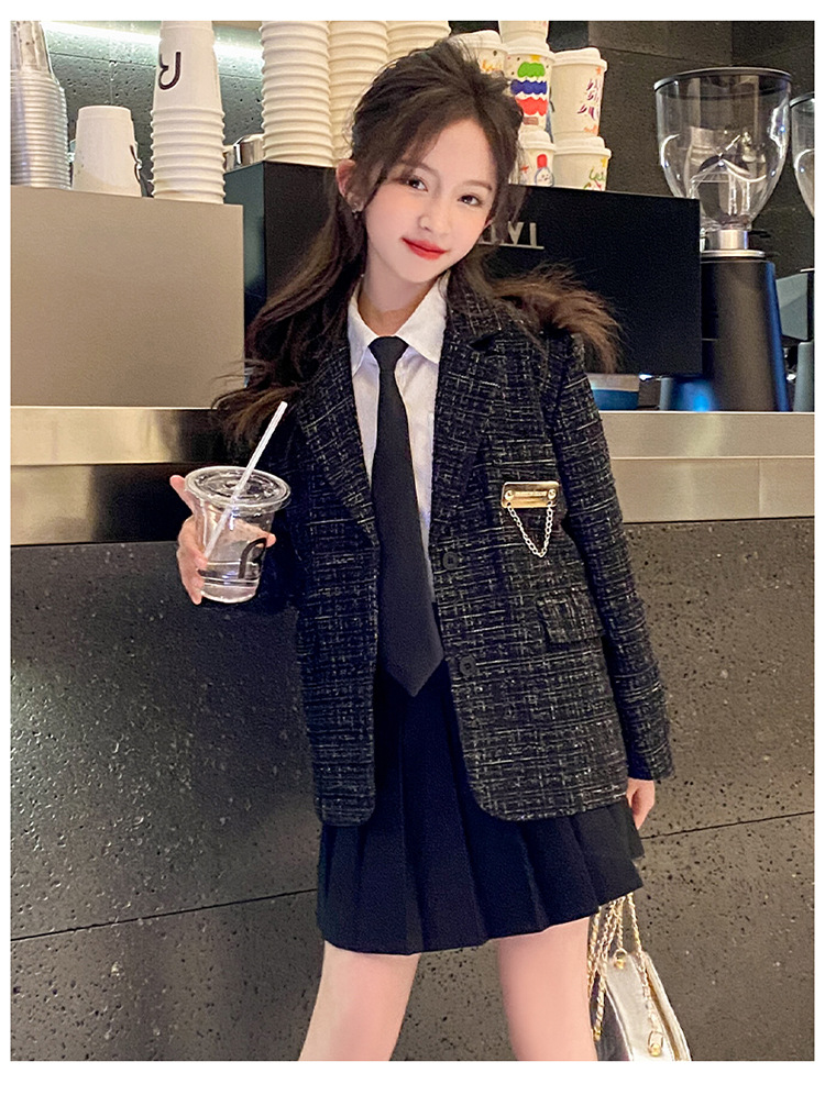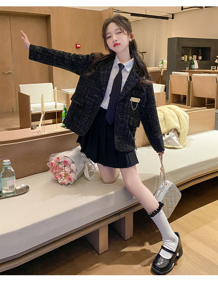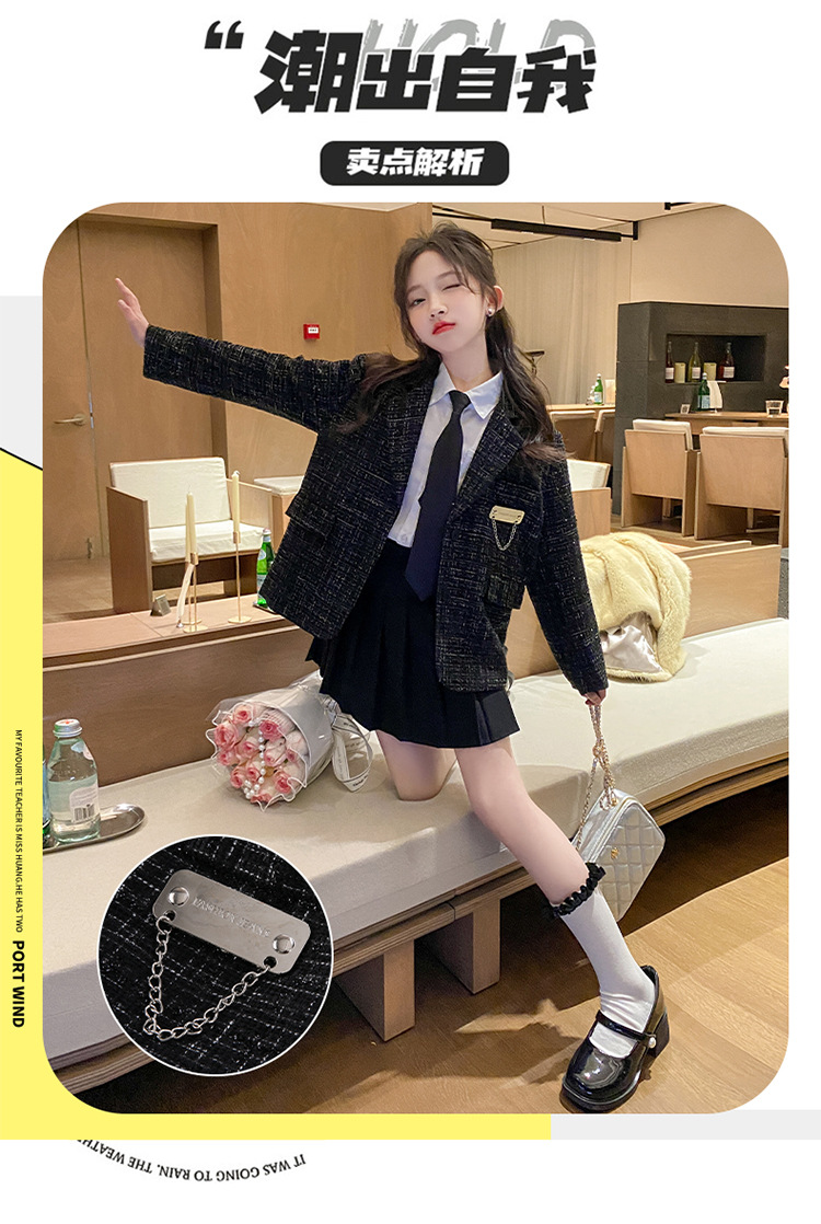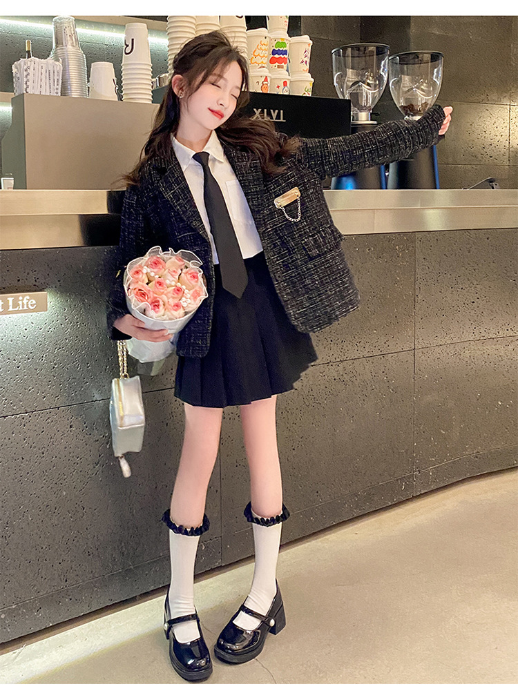 소녀 세트 봄과 가을 2025 새로운 패션 우아한 하이 블랙 샤넬 스타일 코트 대학 스타일 JK 세트스토어 가기