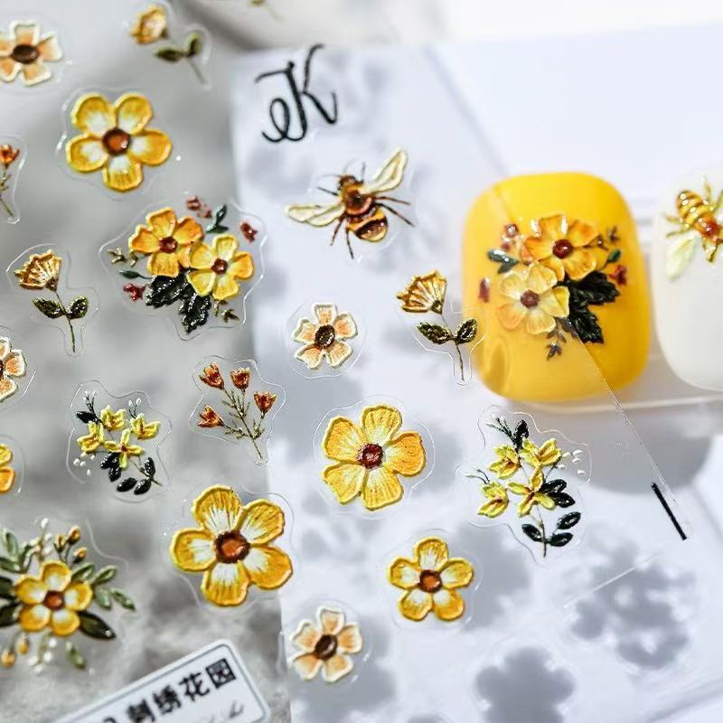 인터넷 축하 폭발성 자수 정원 양각 네일 아트 스티커 꿀벌 노란 꽃 작은 신선한 네일 장식