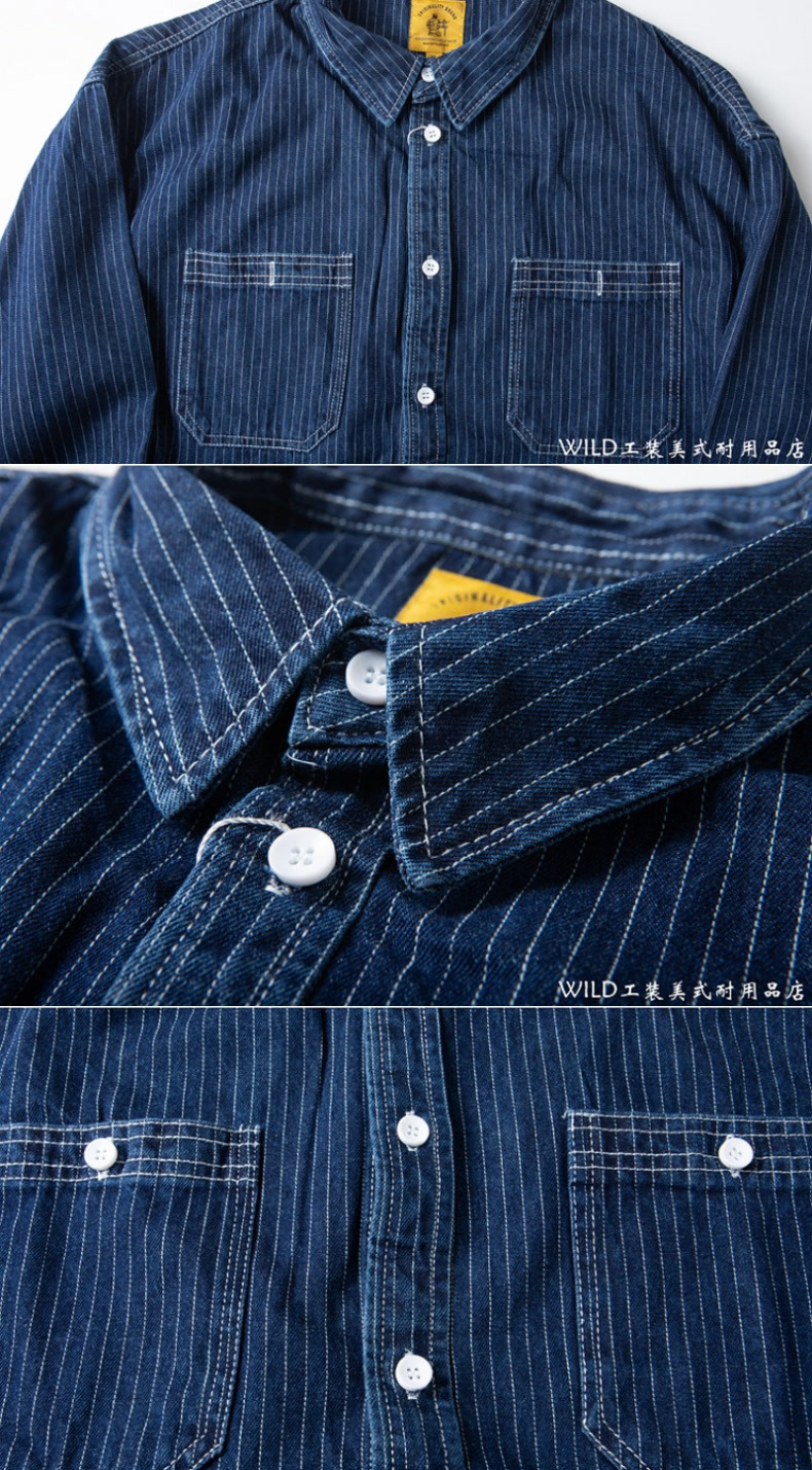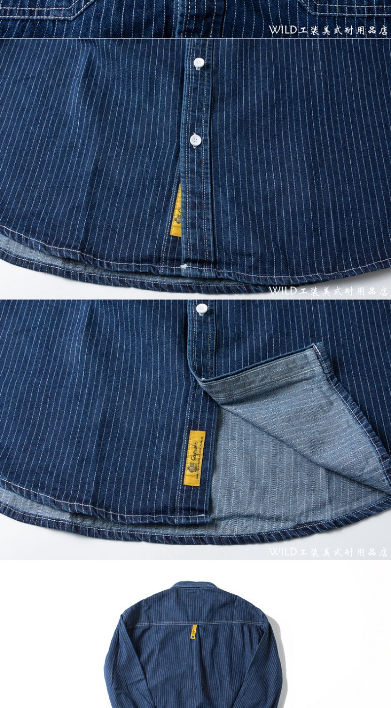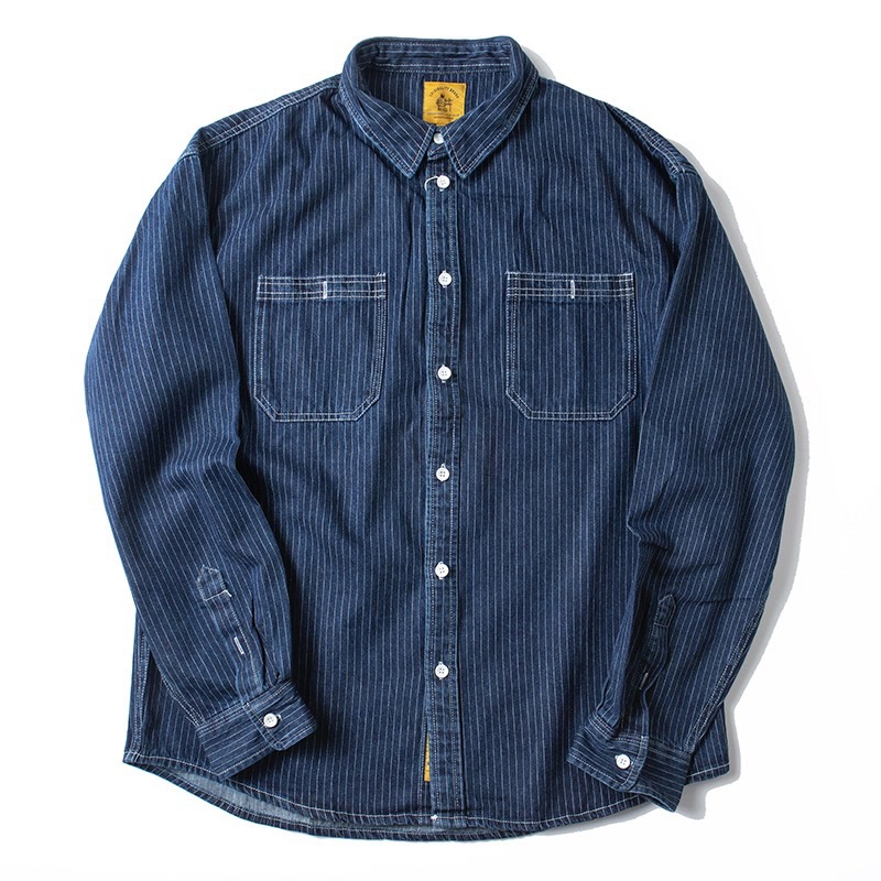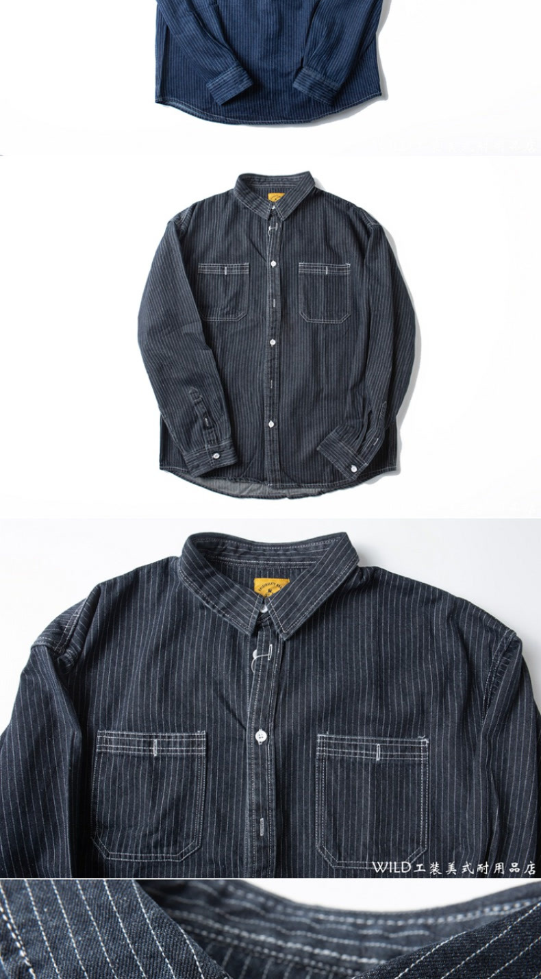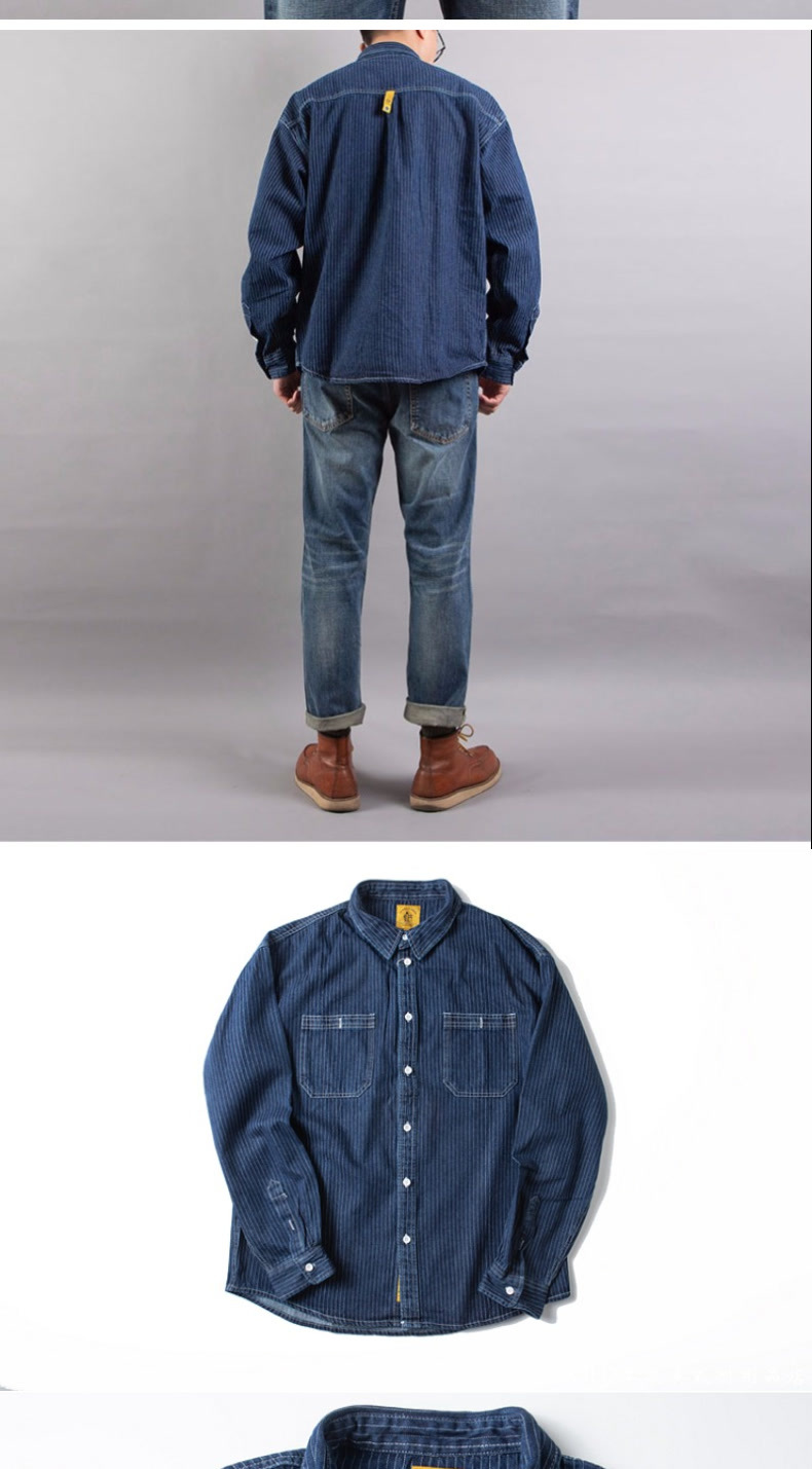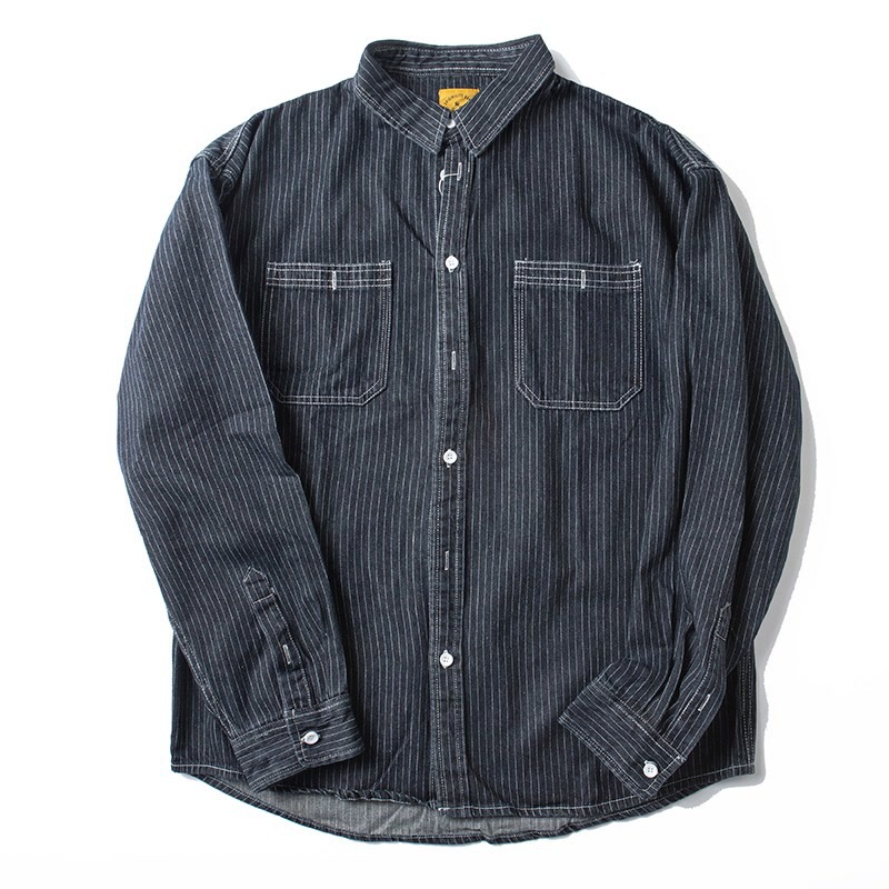 봄 일본식 빈티지 툴링 데님 줄무늬 셔츠 남성용 느슨한 면 멀티 포켓 블랙 캐주얼 긴팔 셔츠스토어 가기