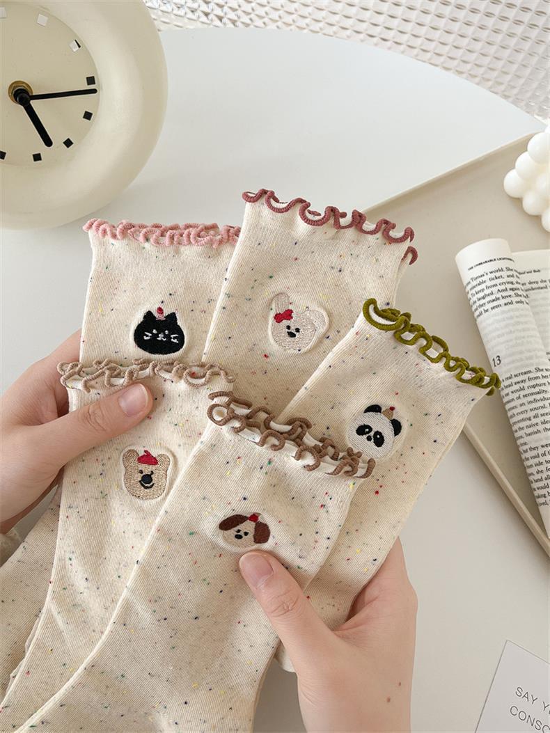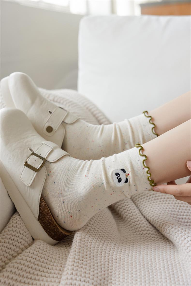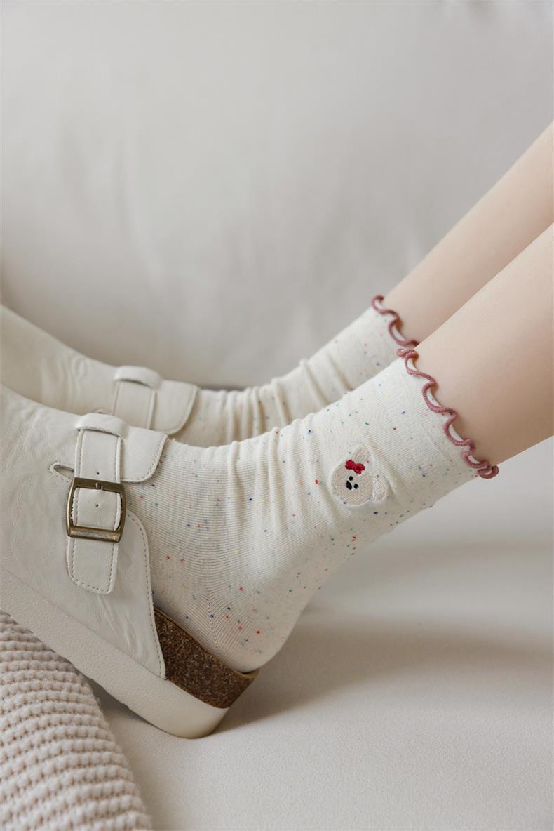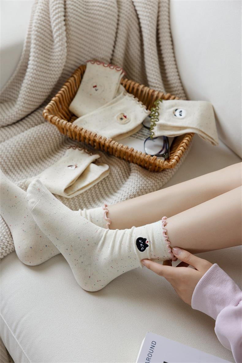 봄 및 가을 어린이를위한 사랑스러운 양말 중간 길이 양말 Ins 트렌디 한 퓨어 코튼 레이스 스타킹 여성의 귀 가장자리 포장 스타킹 여름 얇은