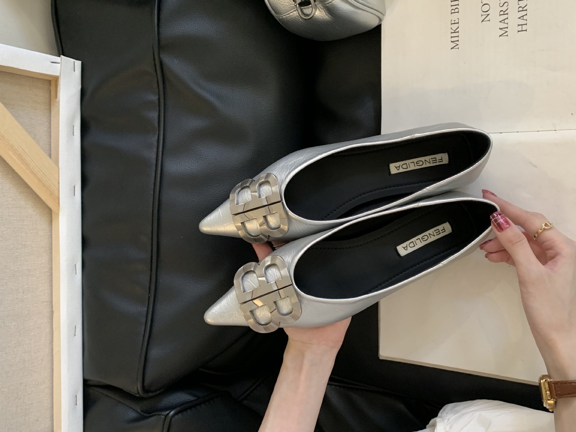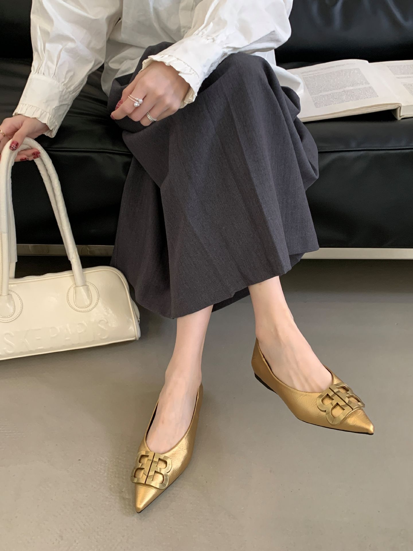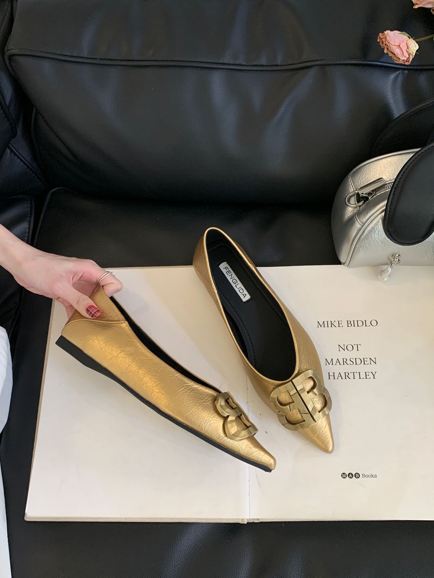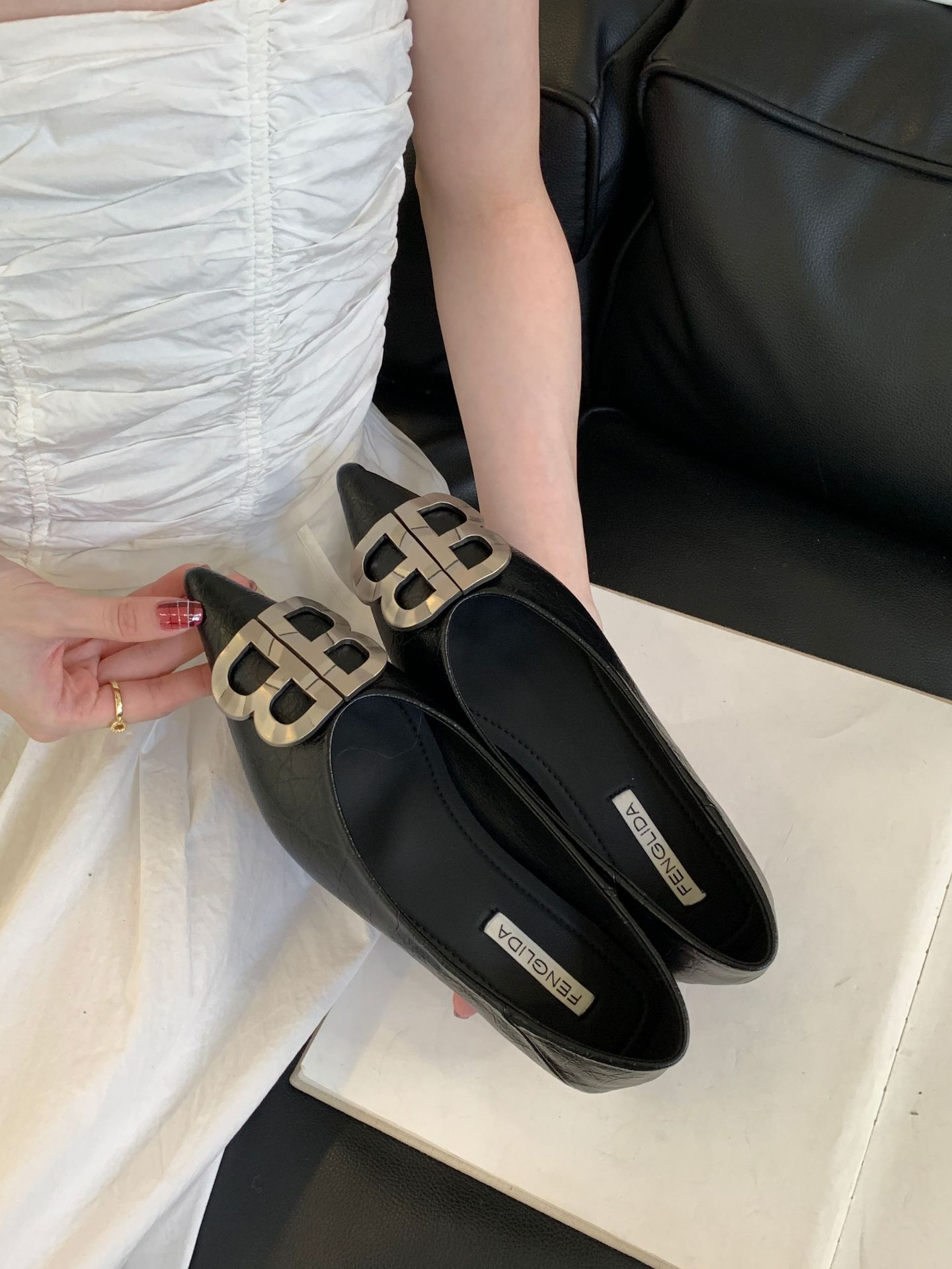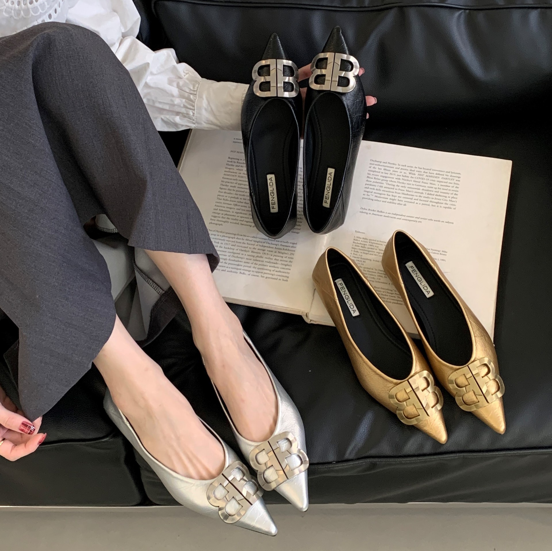 2025 새로운 봄 신발 여성 패션 유럽과 미국 스타일의 금속 버클 여성 신발 뾰족한 얕은 입 신발 여성 플랫 신발 여성