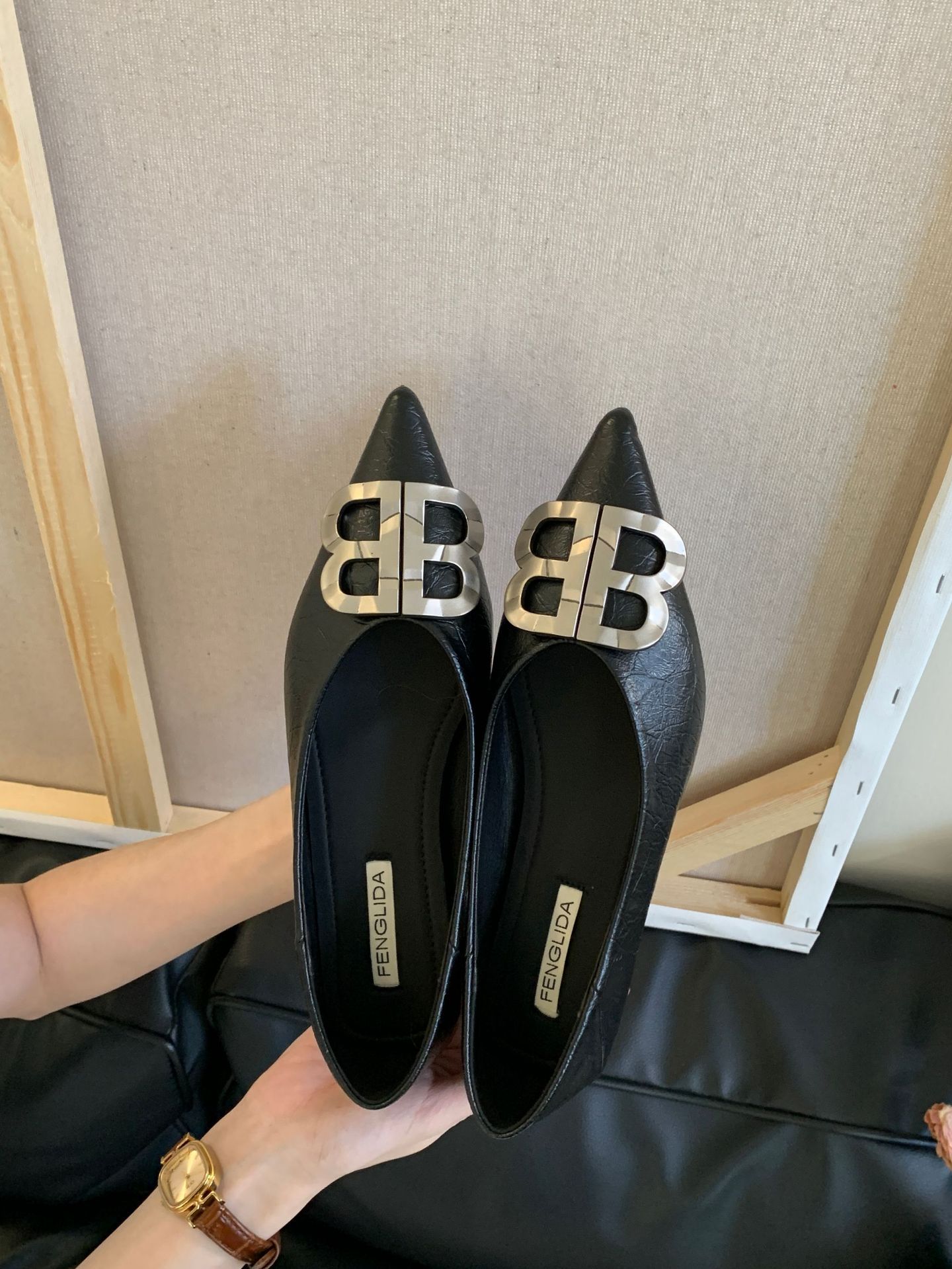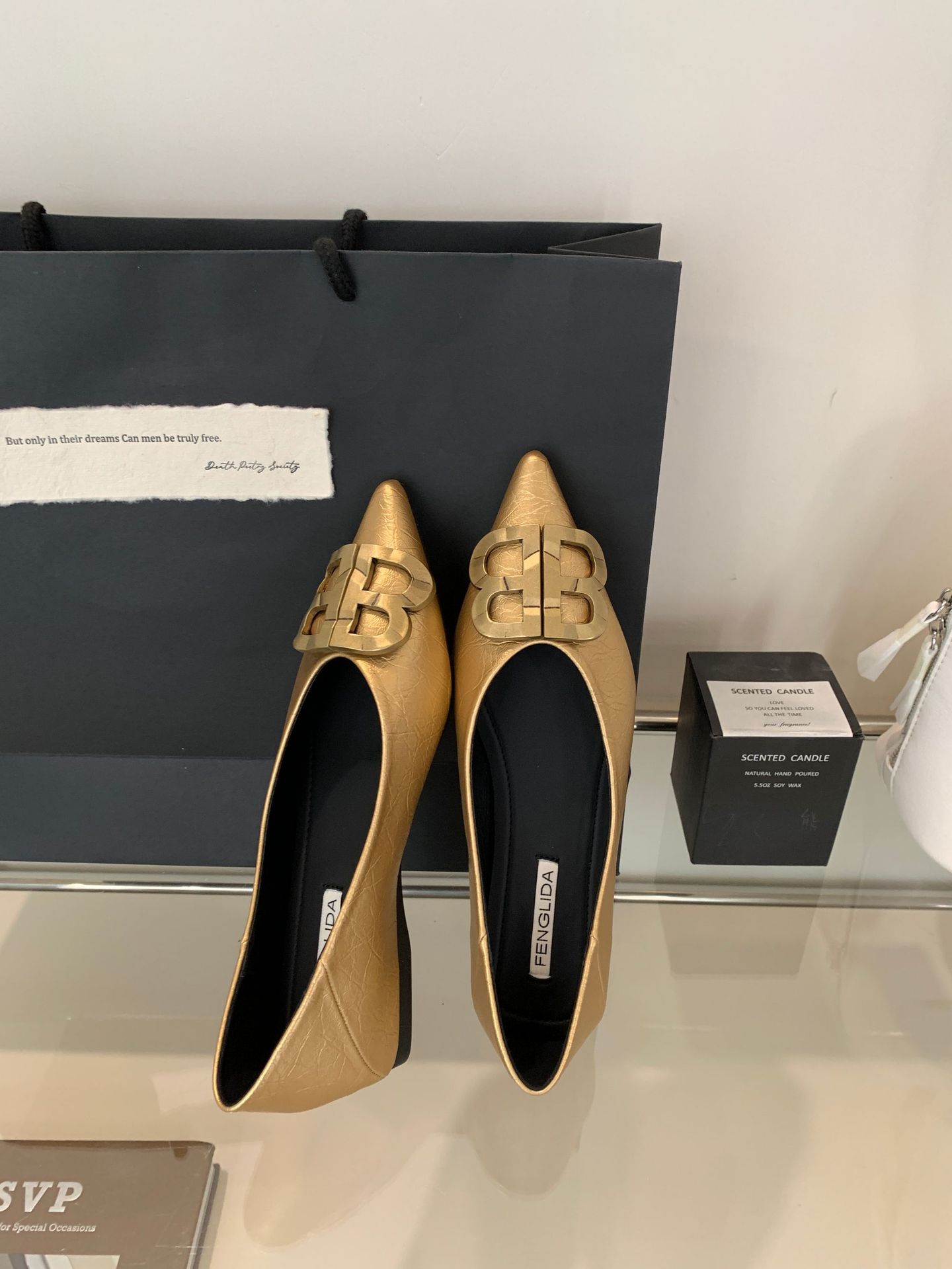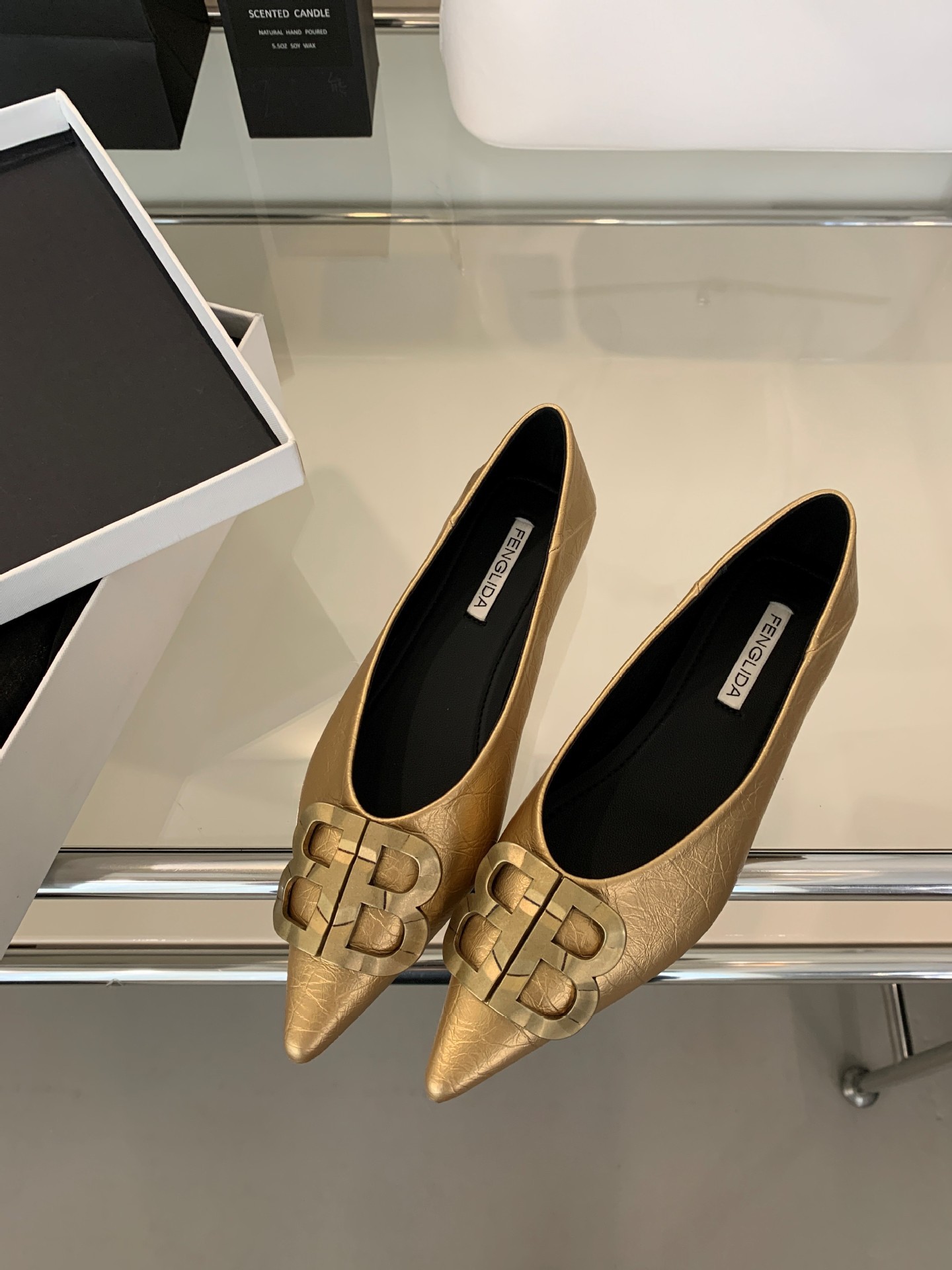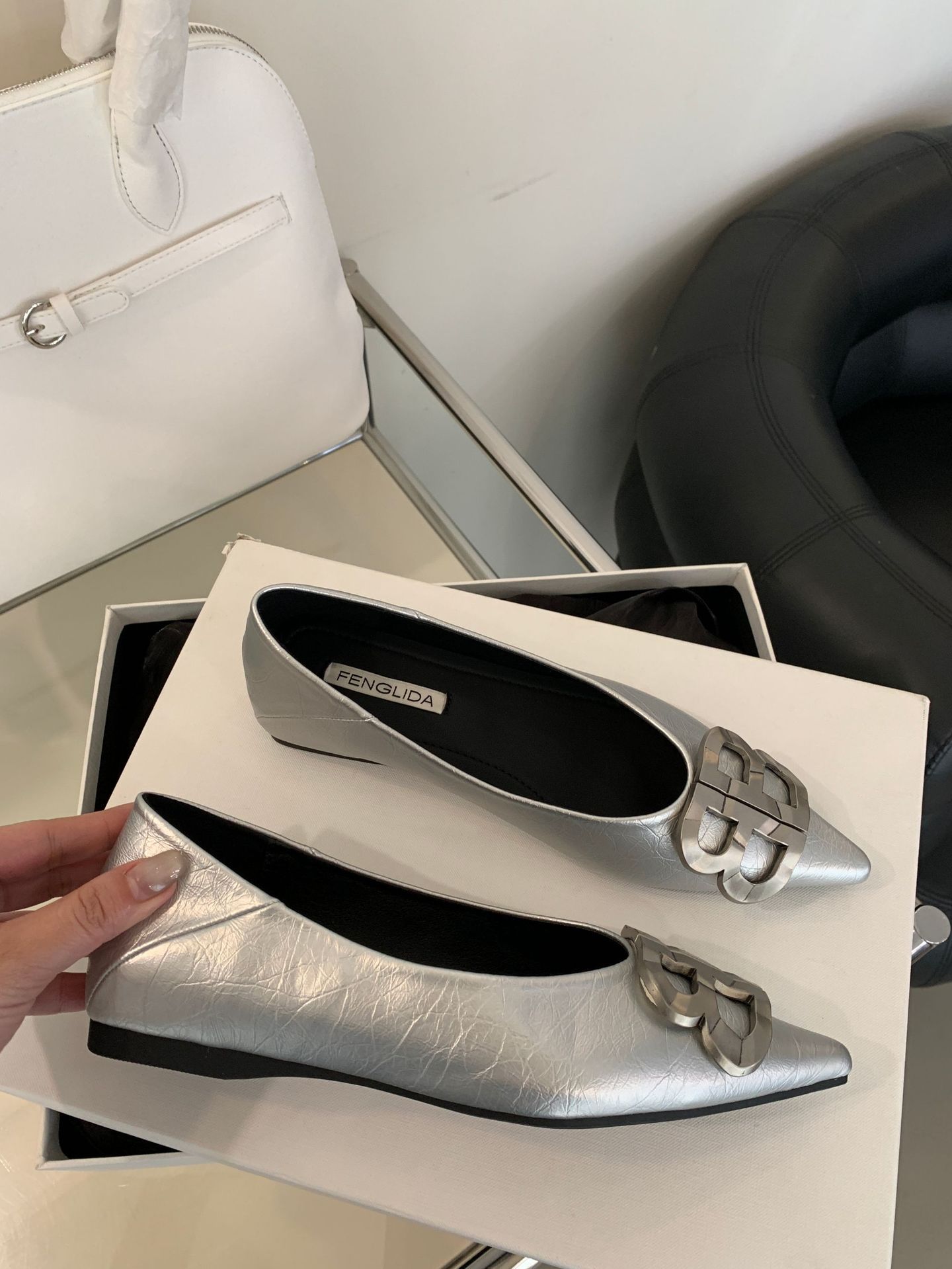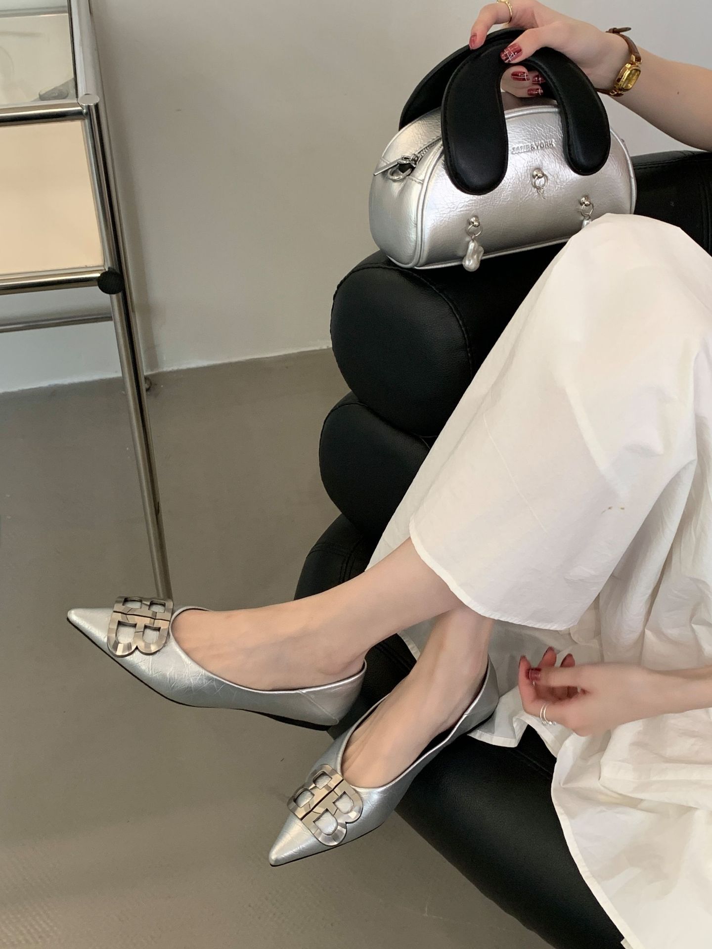 2025 새로운 봄 신발 여성 패션 유럽과 미국 스타일의 금속 버클 여성 신발 뾰족한 얕은 입 신발 여성 플랫 신발 여성