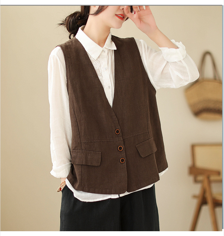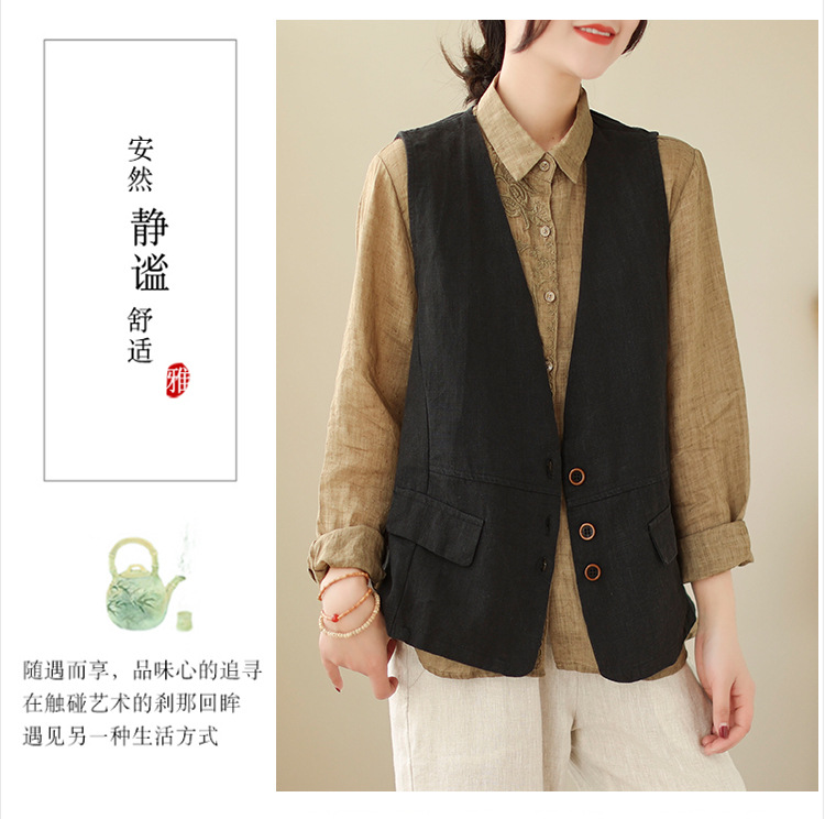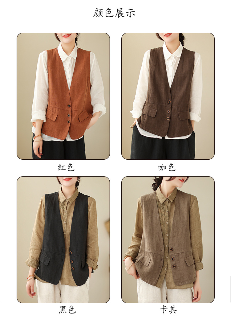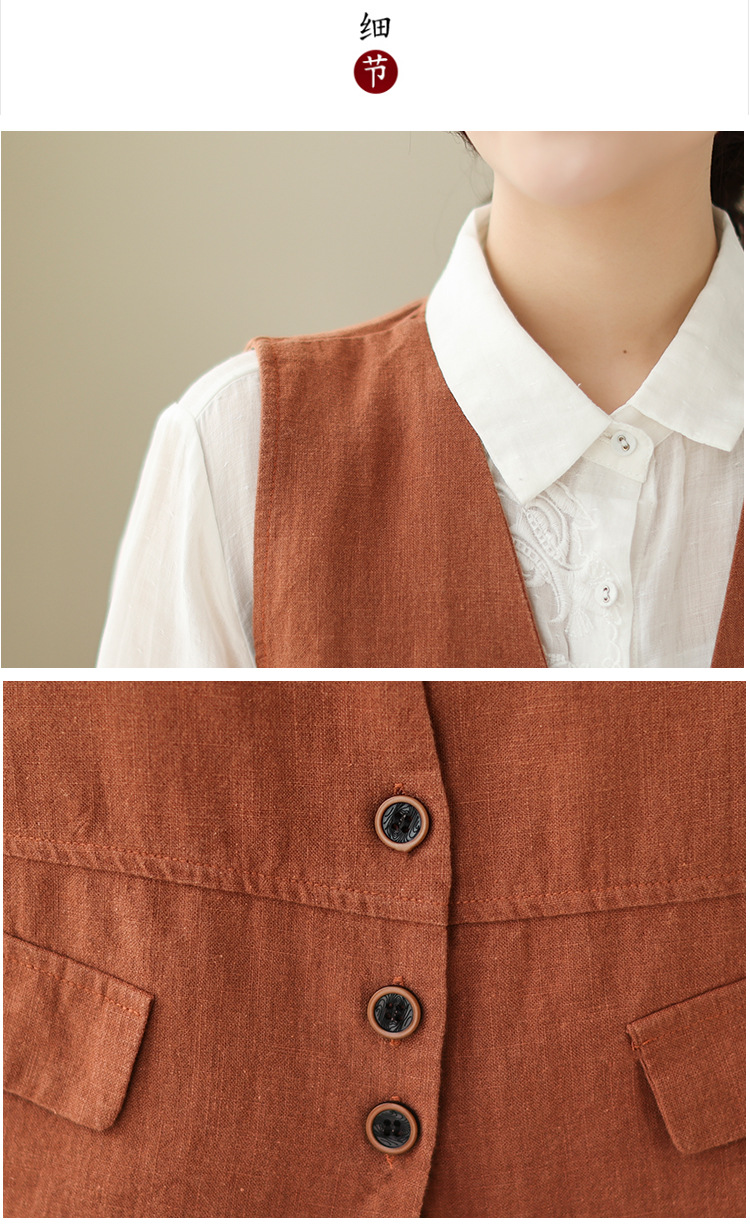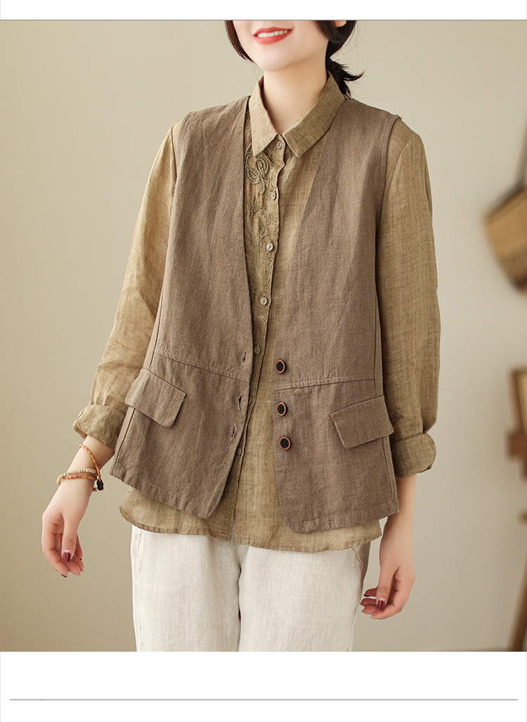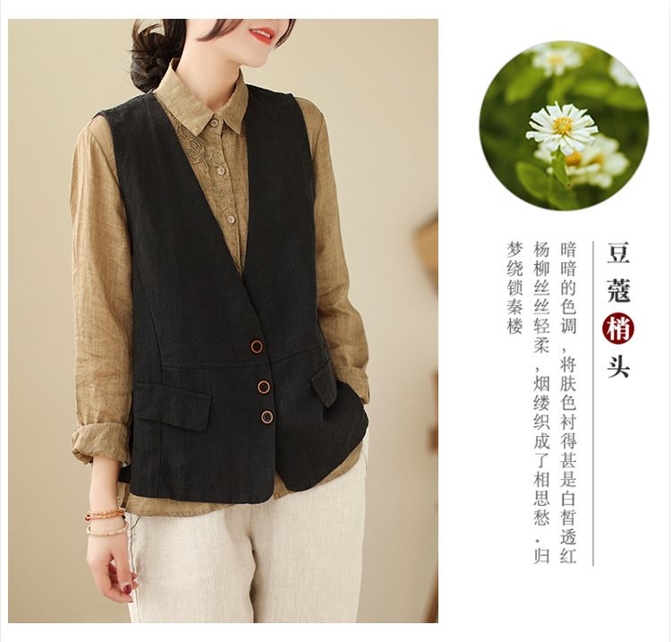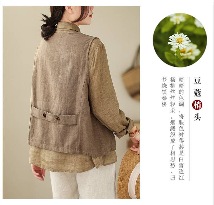 리얼 샷 2025 봄 빈티지 오래 된 V-넥 버튼은 솔리드 컬러 예술적 짧은 면 및 리넨 허리 여성용 외부 착용스토어 가기