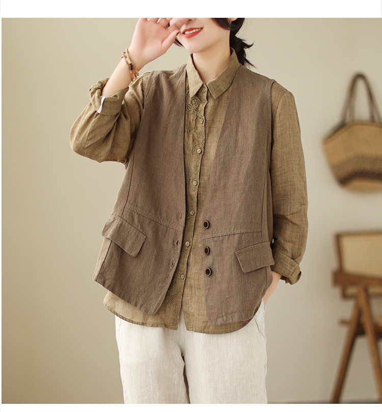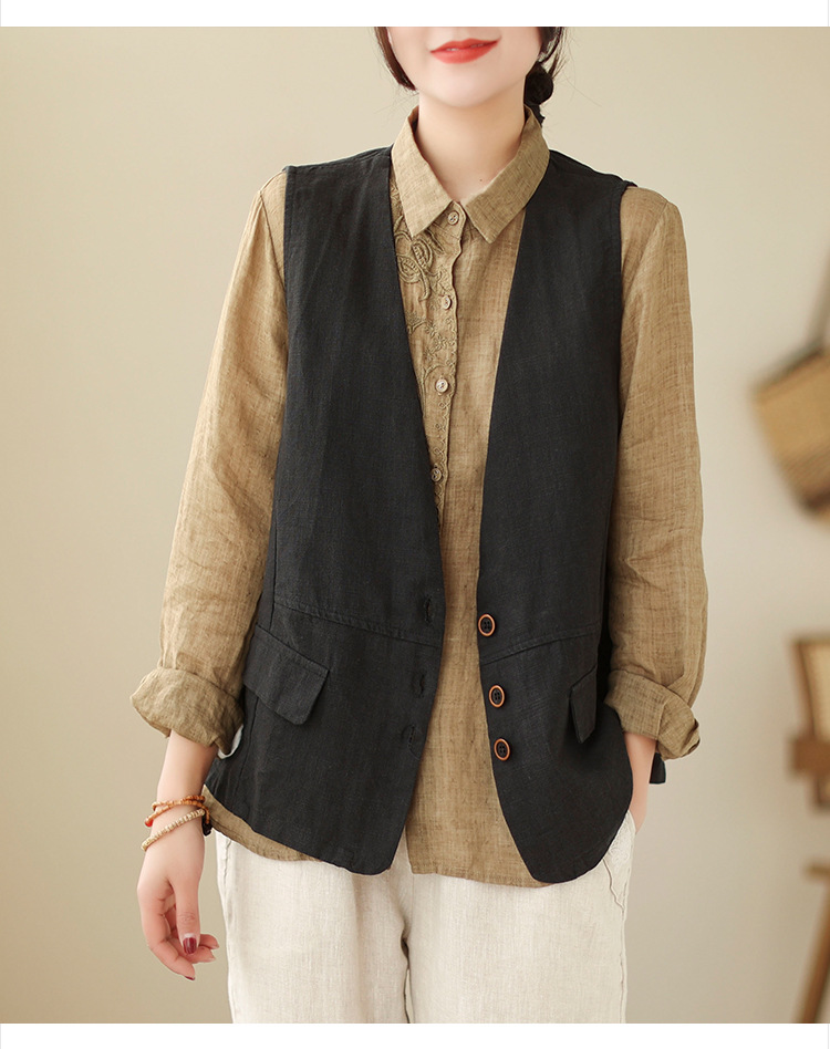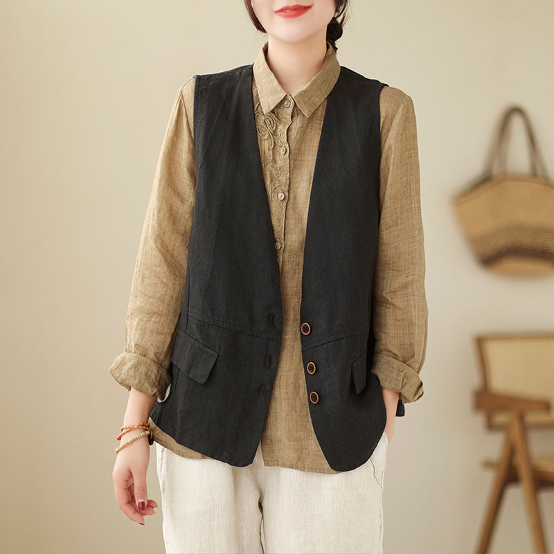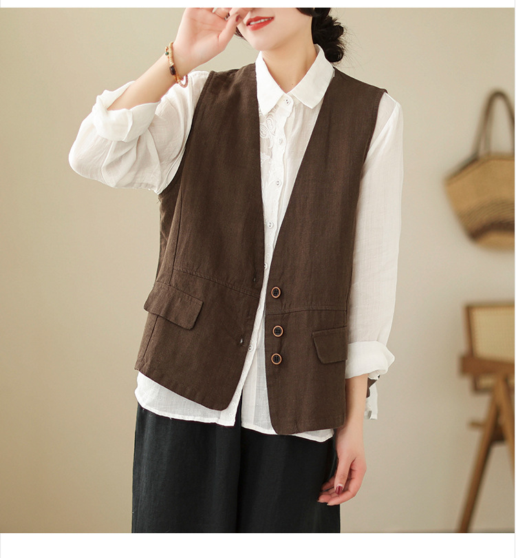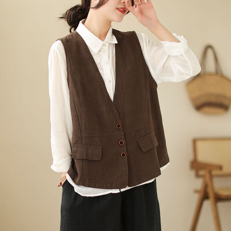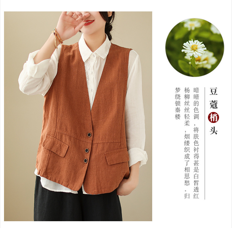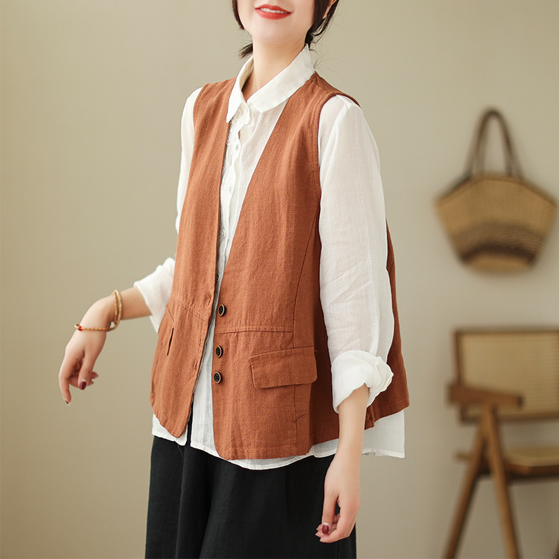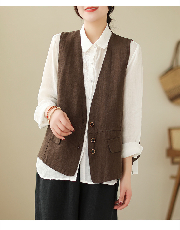 리얼 샷 2025 봄 빈티지 오래 된 V-넥 버튼은 솔리드 컬러 예술적 짧은 면 및 리넨 허리 여성용 외부 착용스토어 가기