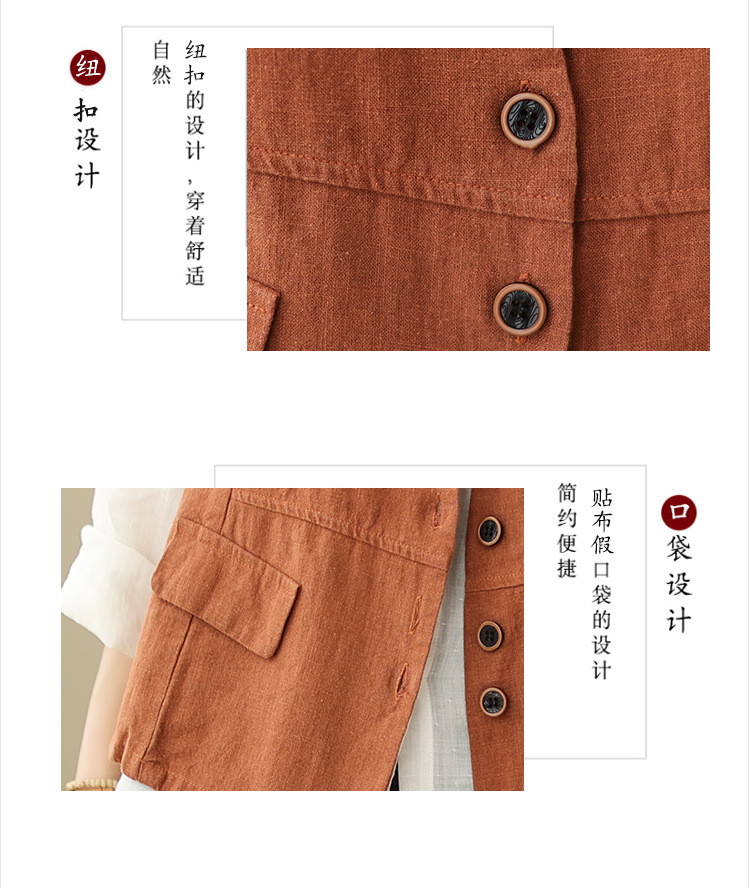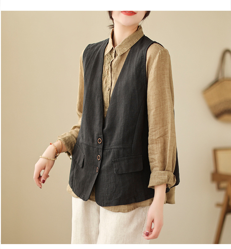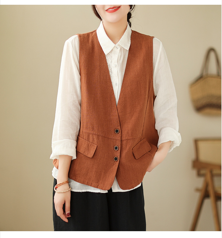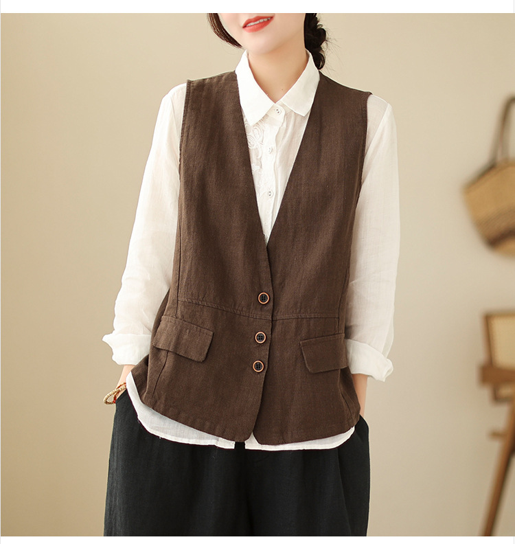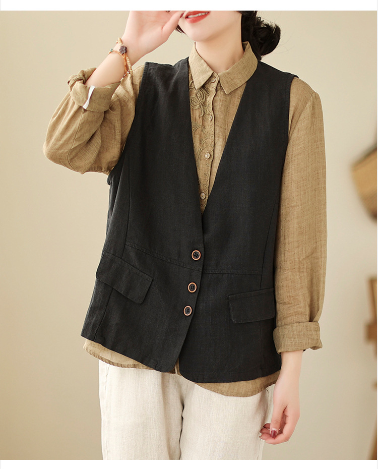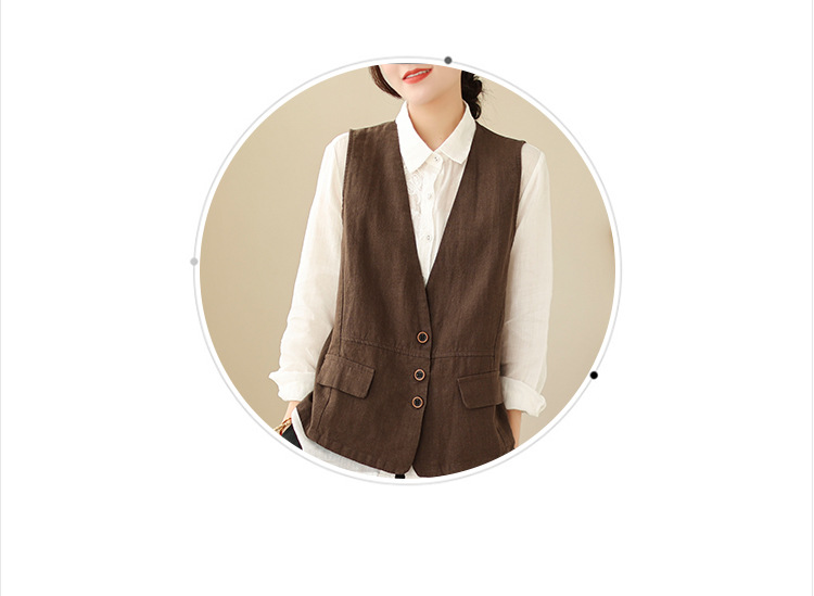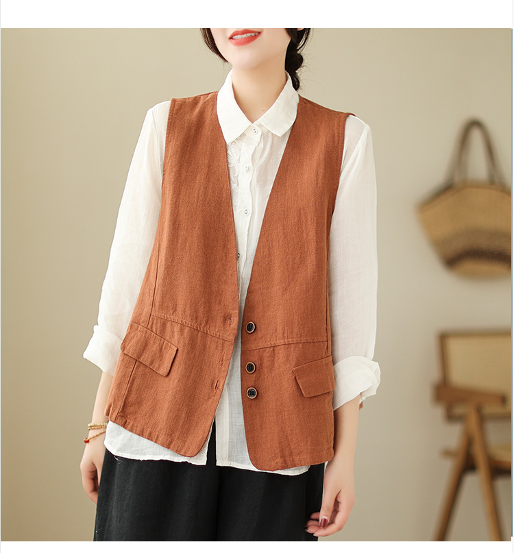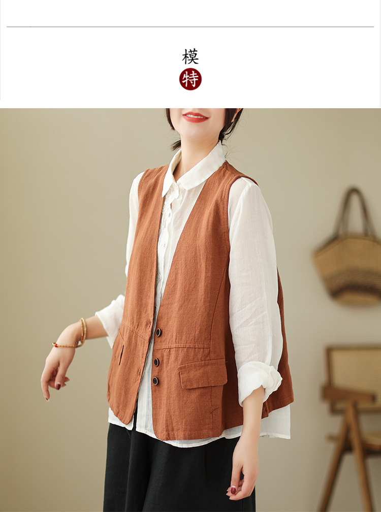 리얼 샷 2025 봄 빈티지 오래 된 V-넥 버튼은 솔리드 컬러 예술적 짧은 면 및 리넨 허리 여성용 외부 착용스토어 가기