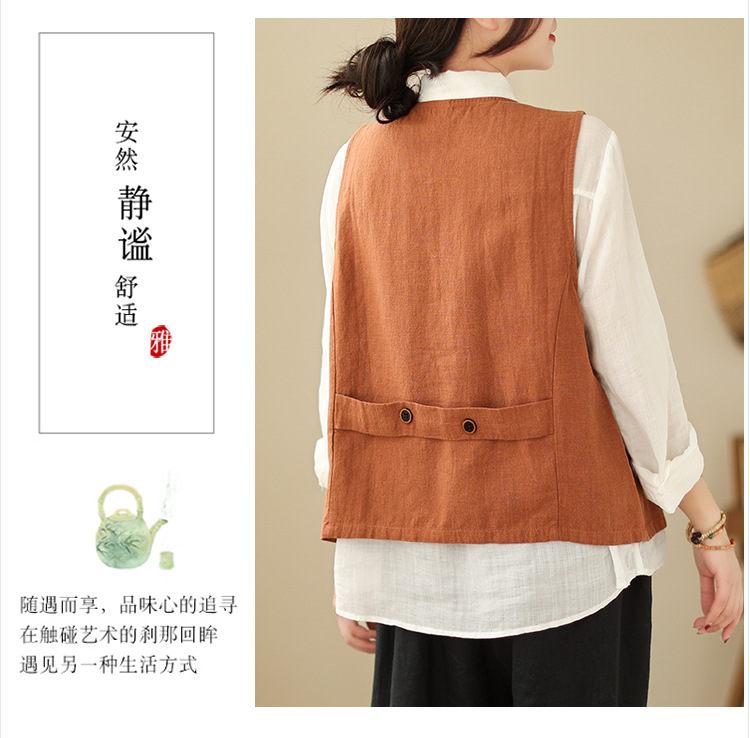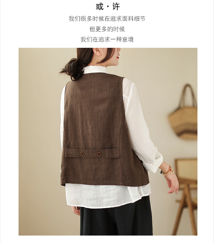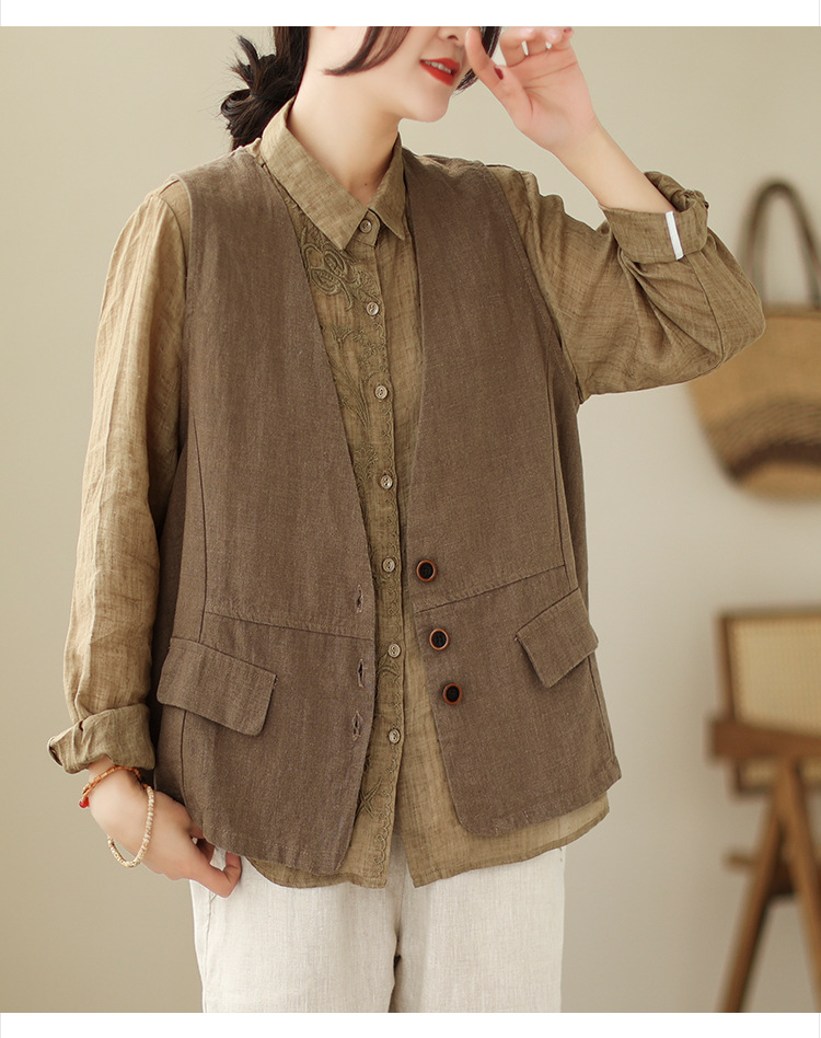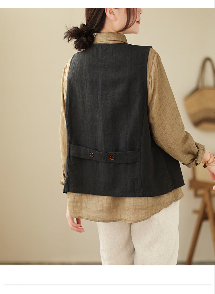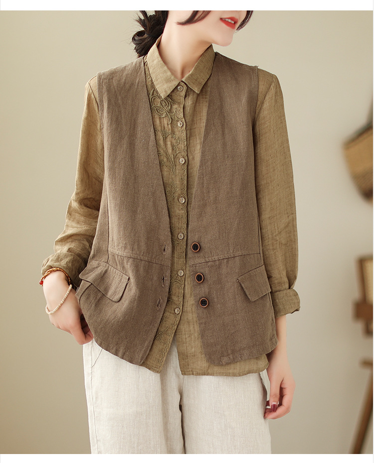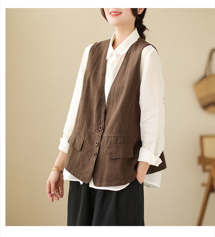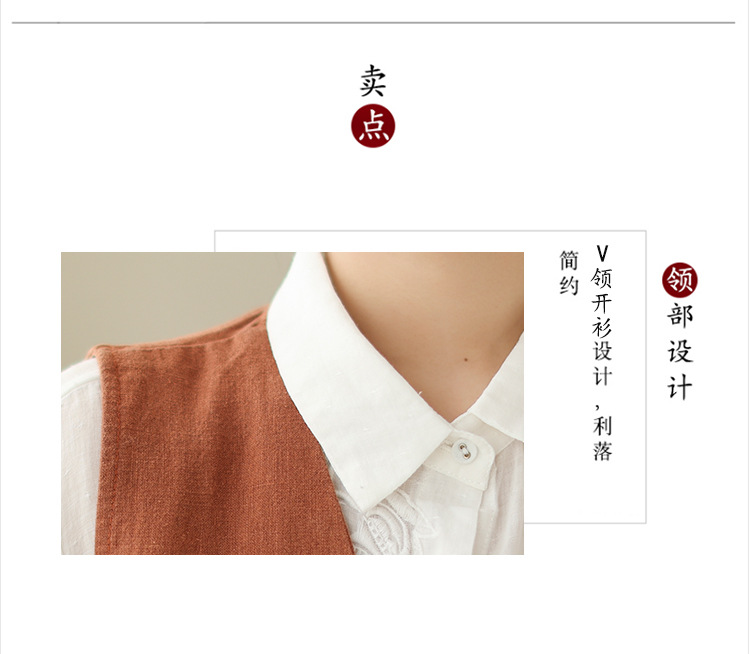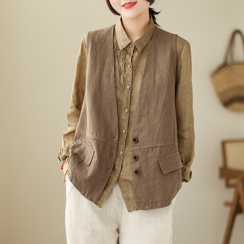 리얼 샷 2025 봄 빈티지 오래 된 V-넥 버튼은 솔리드 컬러 예술적 짧은 면 및 리넨 허리 여성용 외부 착용스토어 가기