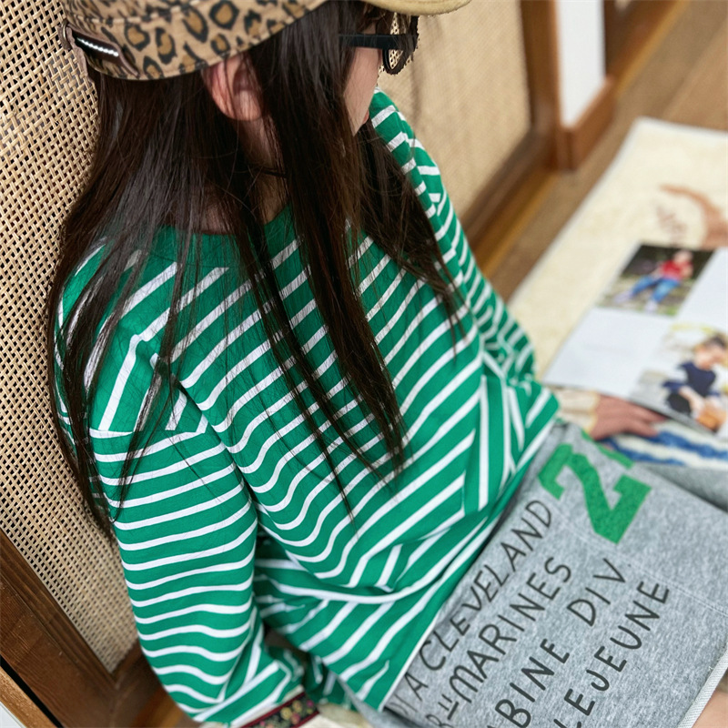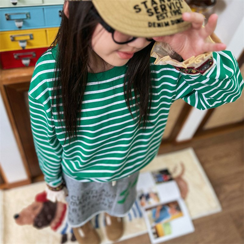2025 봄 여름 신작 아동용 셔츠 소녀 레이스 슬리브 다용도 스트라이프 티셔츠스토어 가기