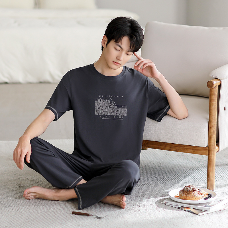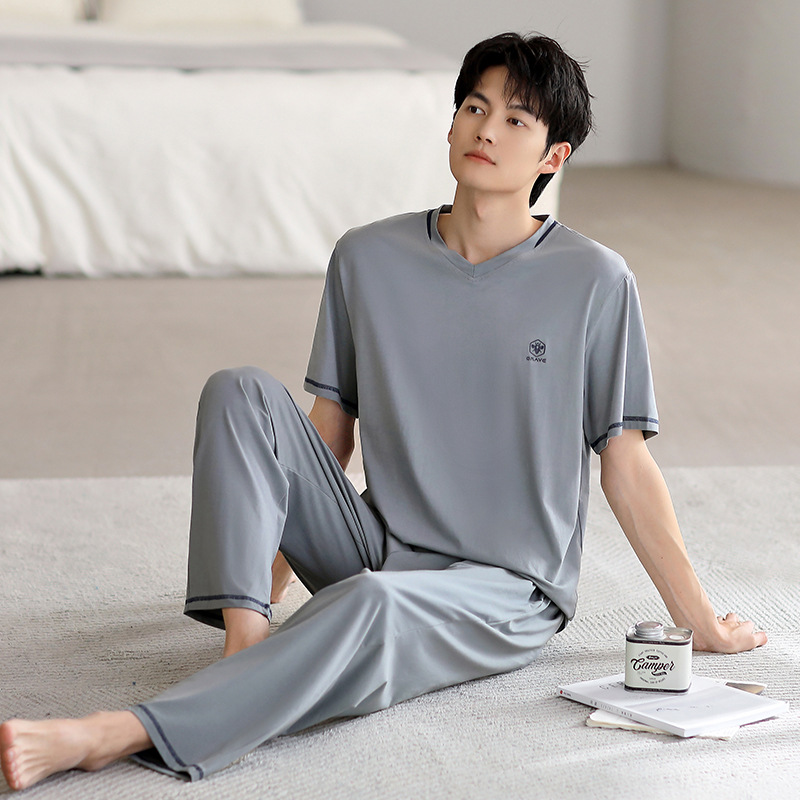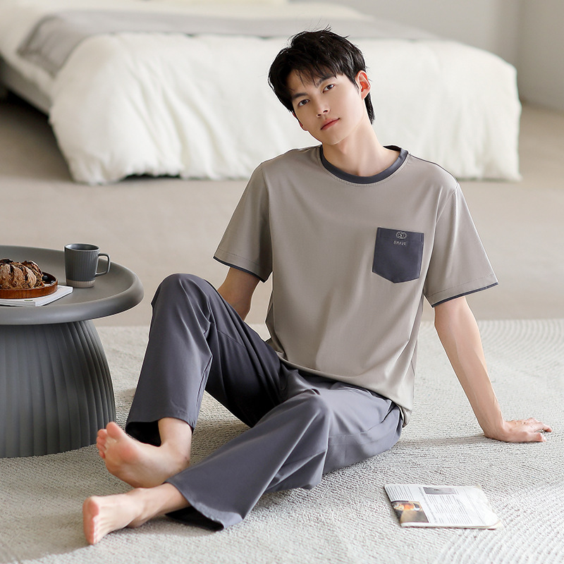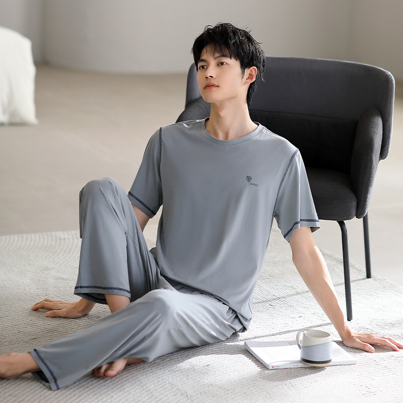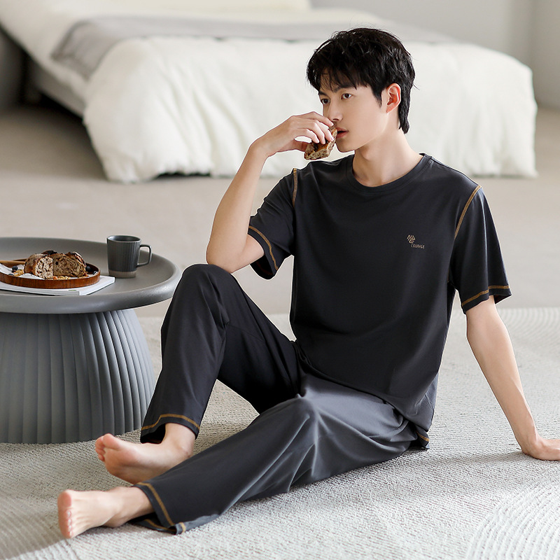 모달 남자 잠옷 봄과 여름 둥근 목 풀오버 여름 얇은 짧은 소매 플러스 사이즈 청소년 홈 옷 세트