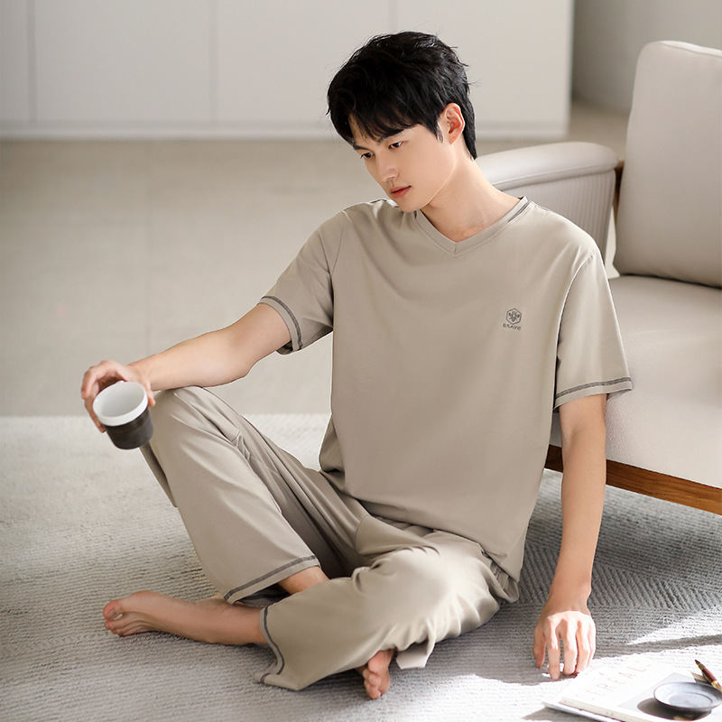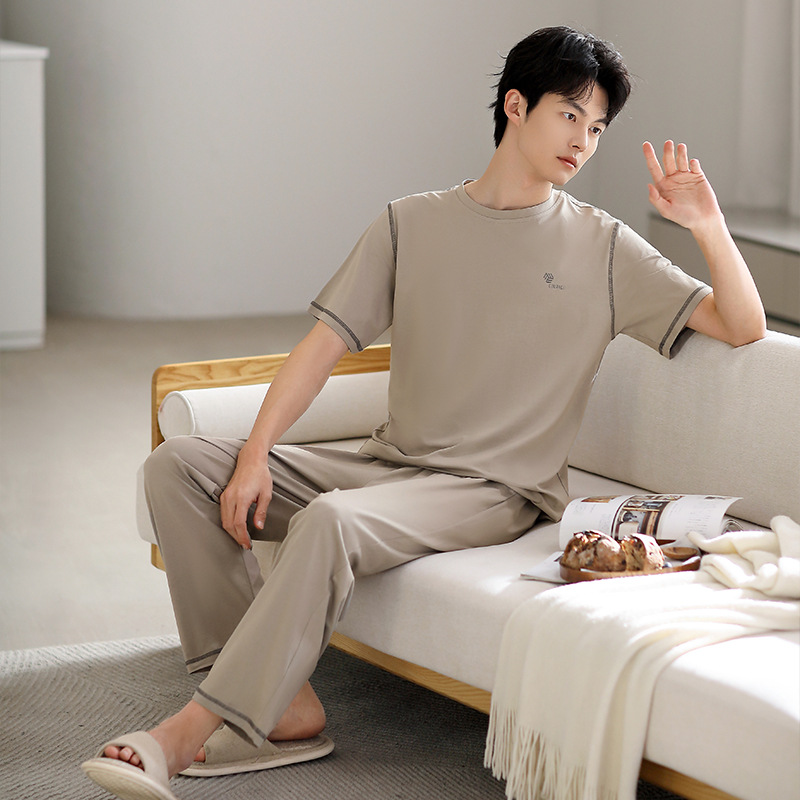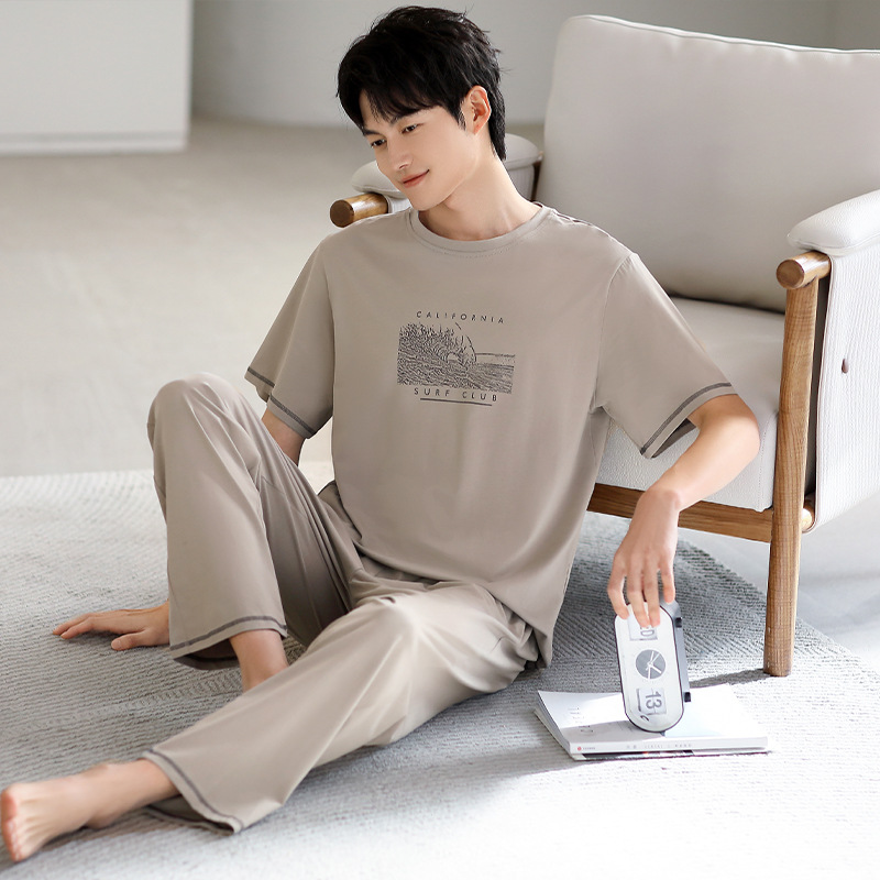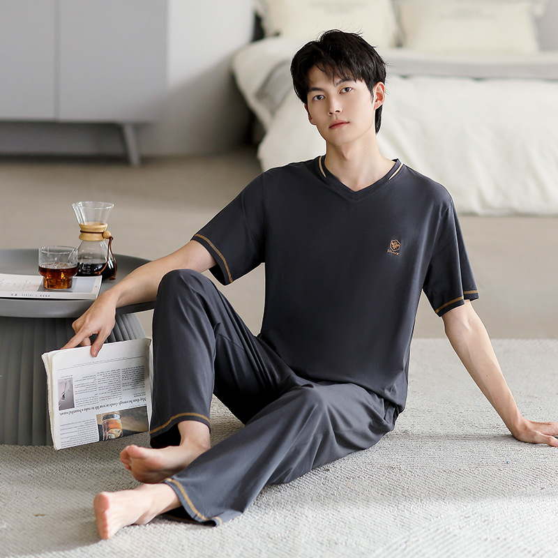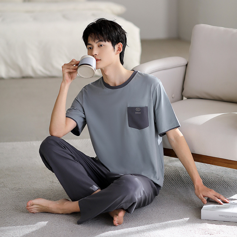 모달 남자 잠옷 봄과 여름 둥근 목 풀오버 여름 얇은 짧은 소매 플러스 사이즈 청소년 홈 옷 세트