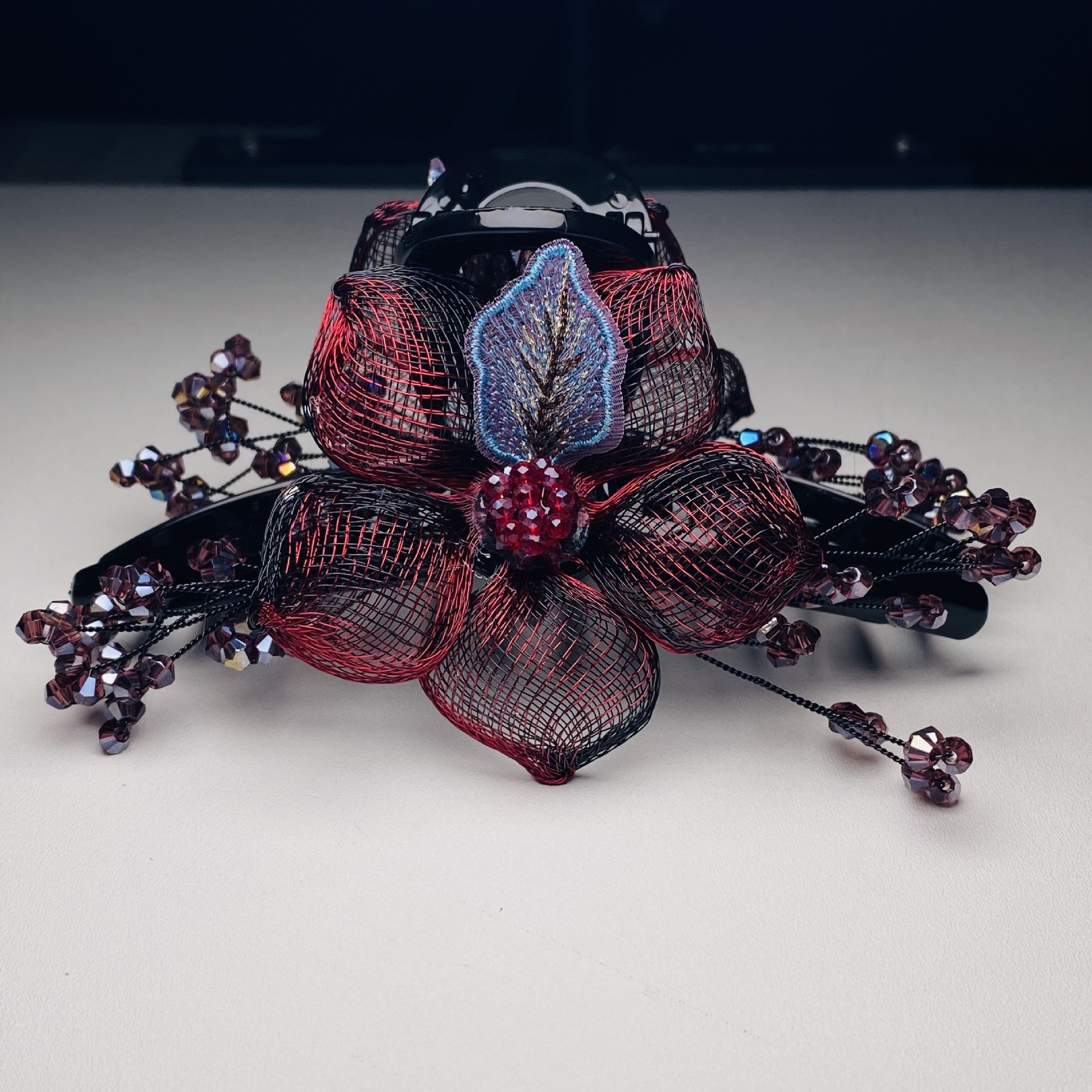 • 검정 & 빨강 싱글 플라워 양면 비즈 장식 집게핀 13cm