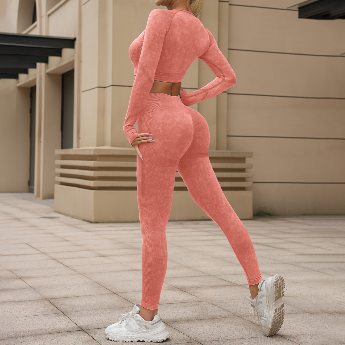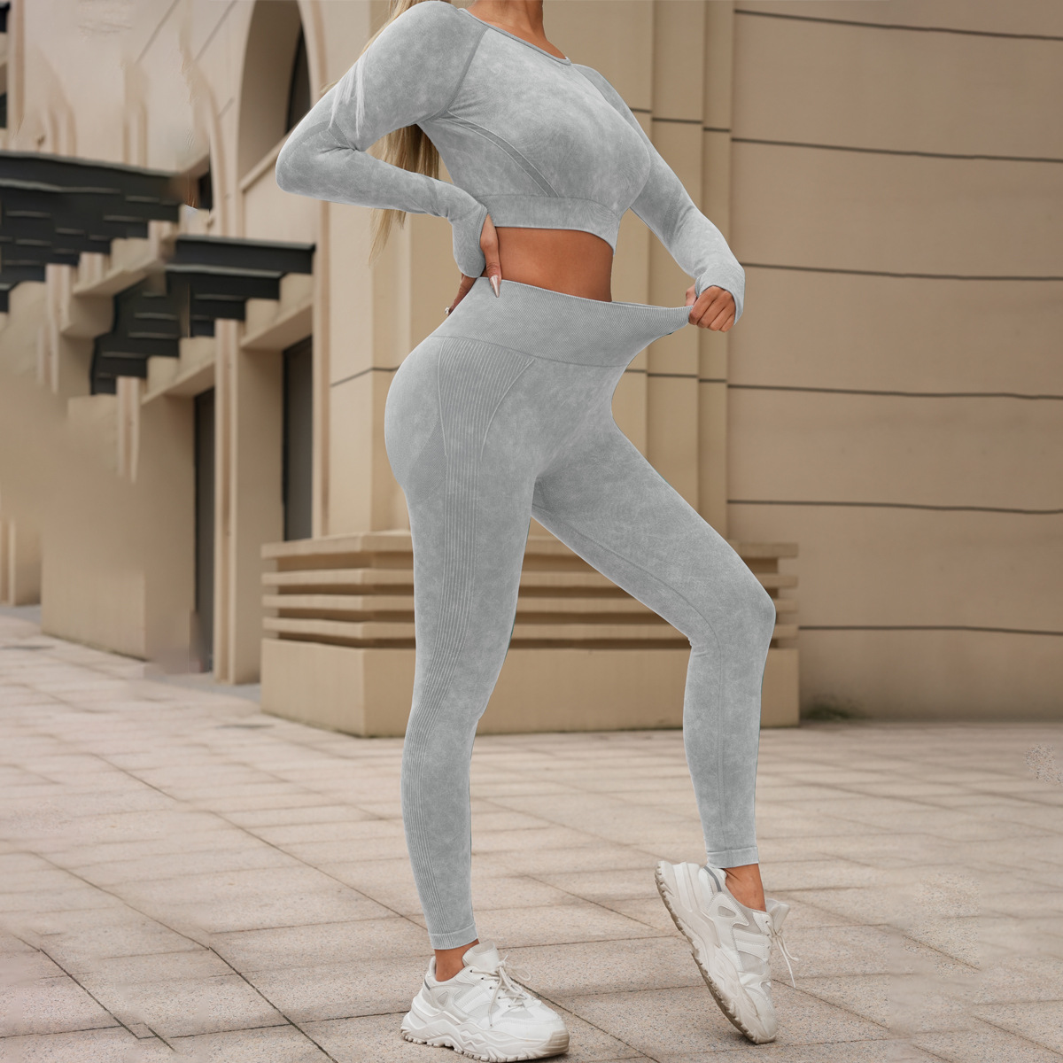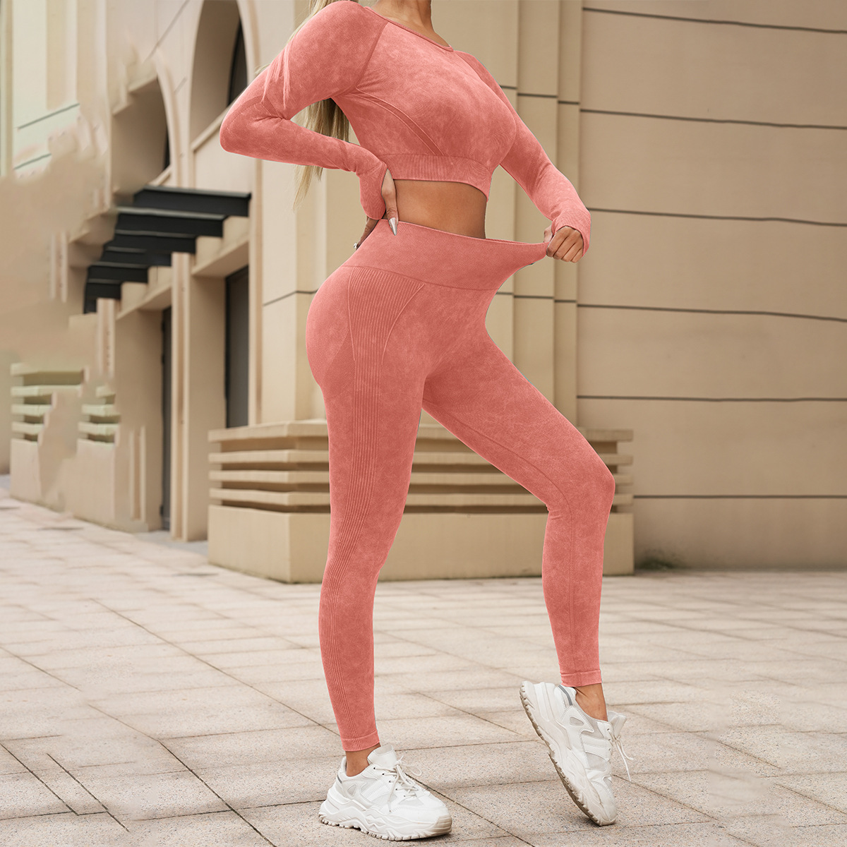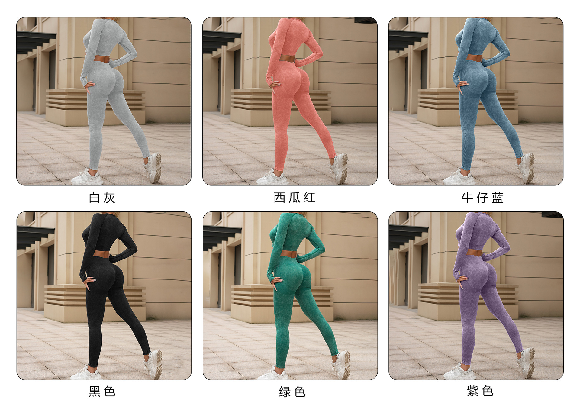유럽과 미국의 세탁 요가 의류 세트 여성용 긴팔 바지 투피스 세트 슬림핏 허니 힙 세탁 피트니스 바지 세트