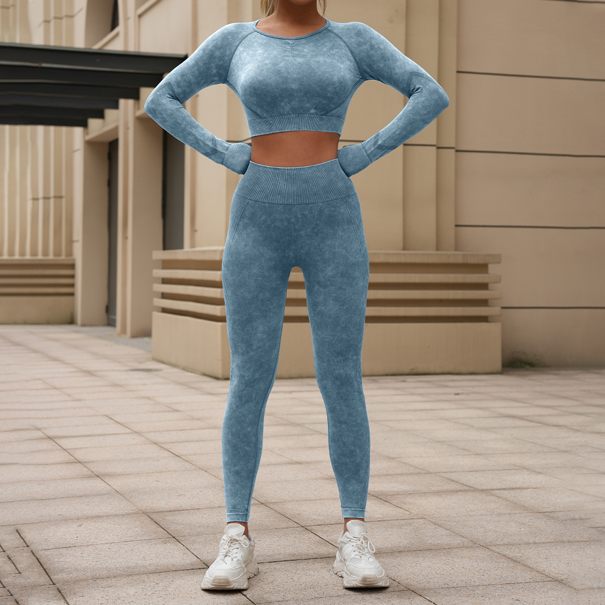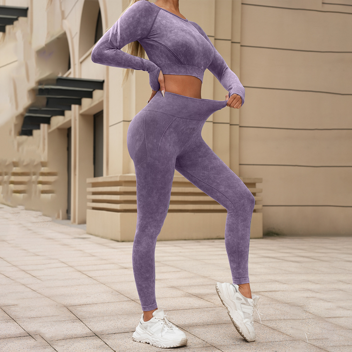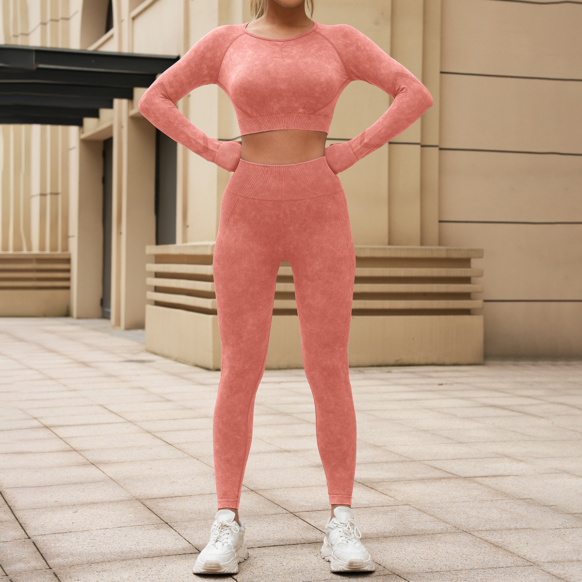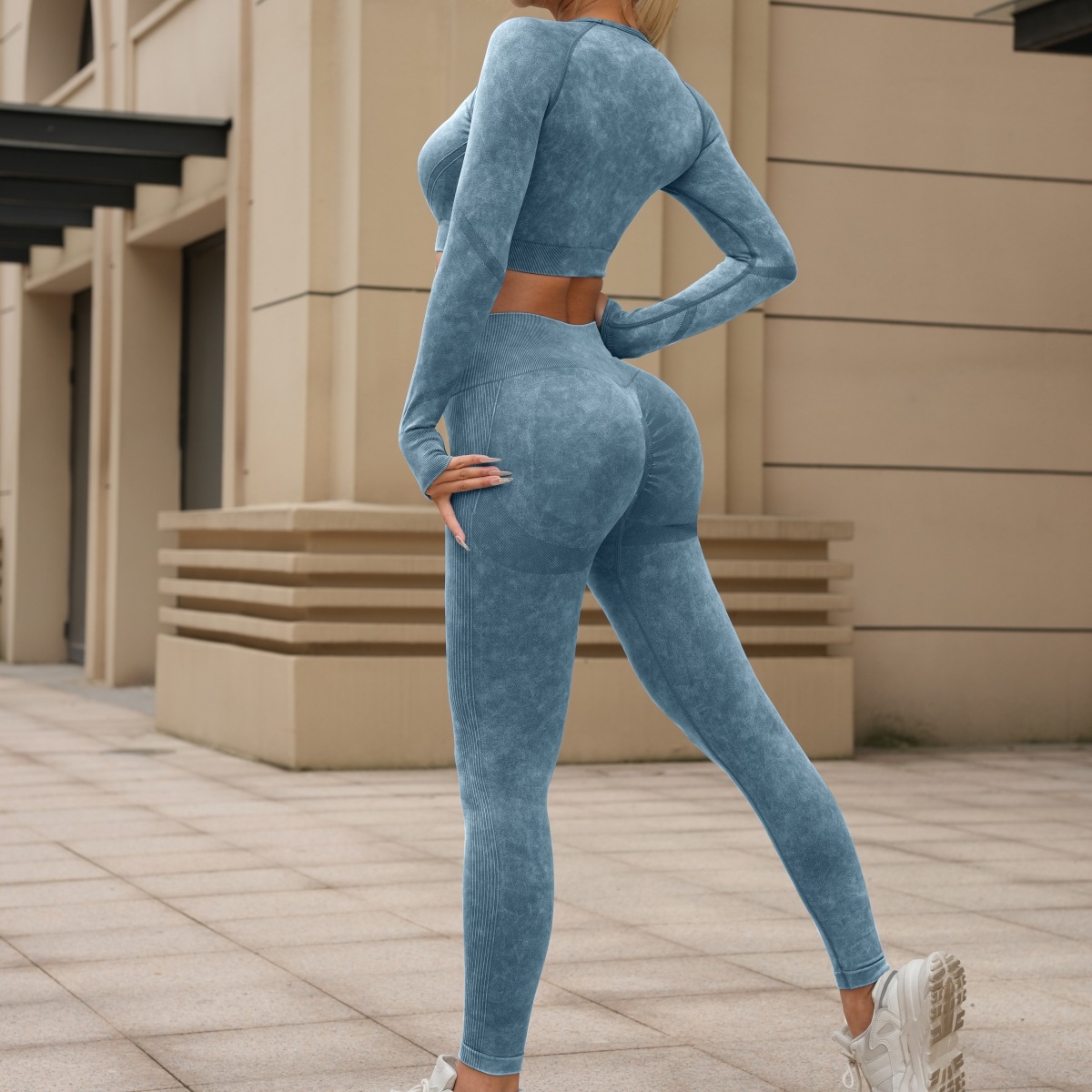 유럽과 미국의 세탁 요가 의류 세트 여성용 긴팔 바지 투피스 세트 슬림핏 허니 힙 세탁 피트니스 바지 세트