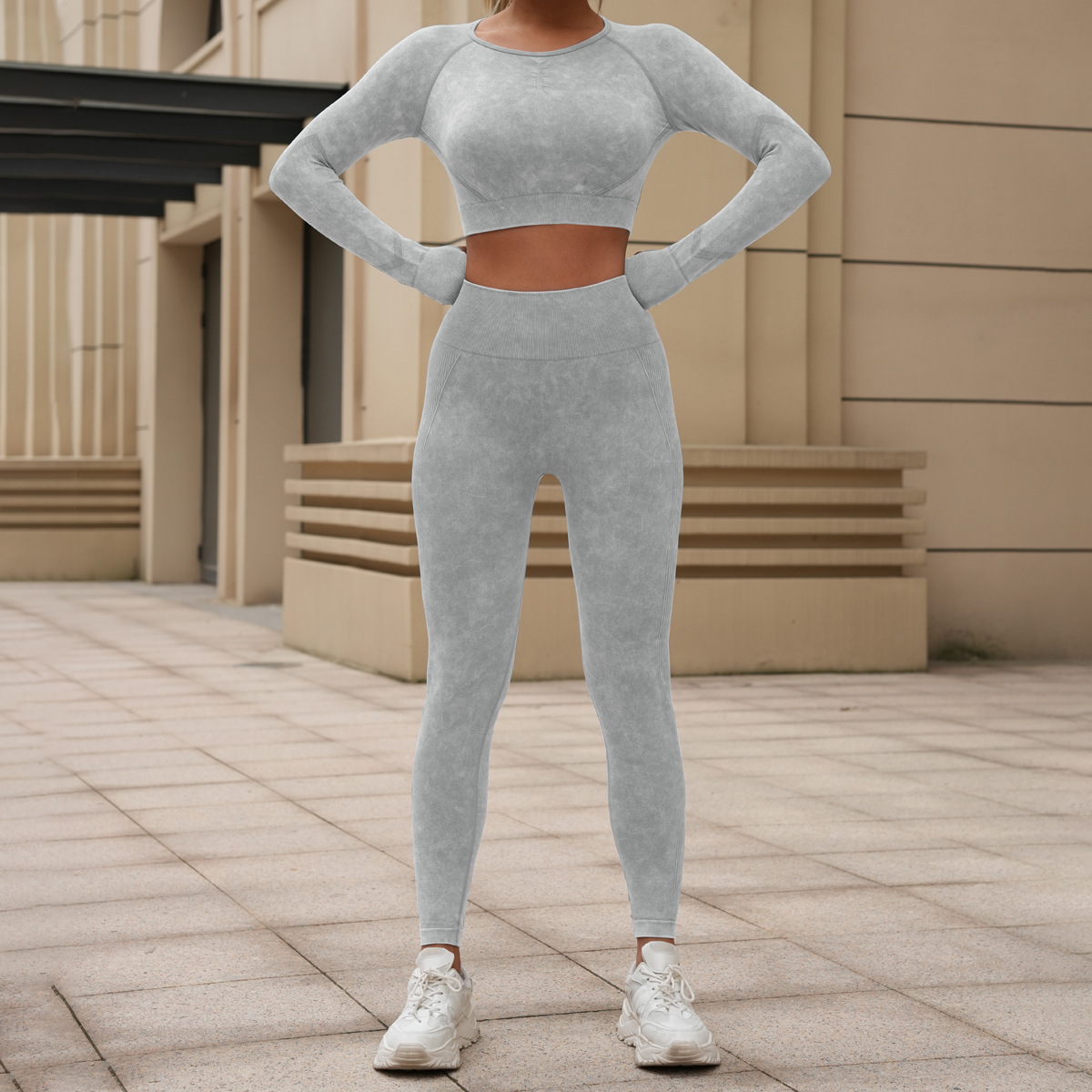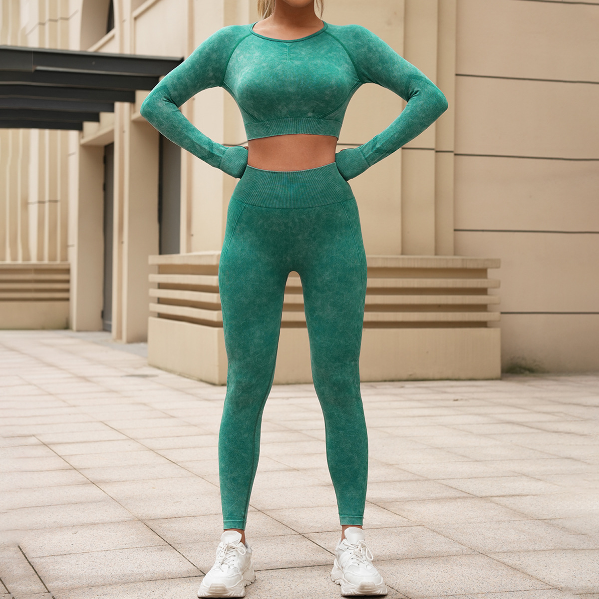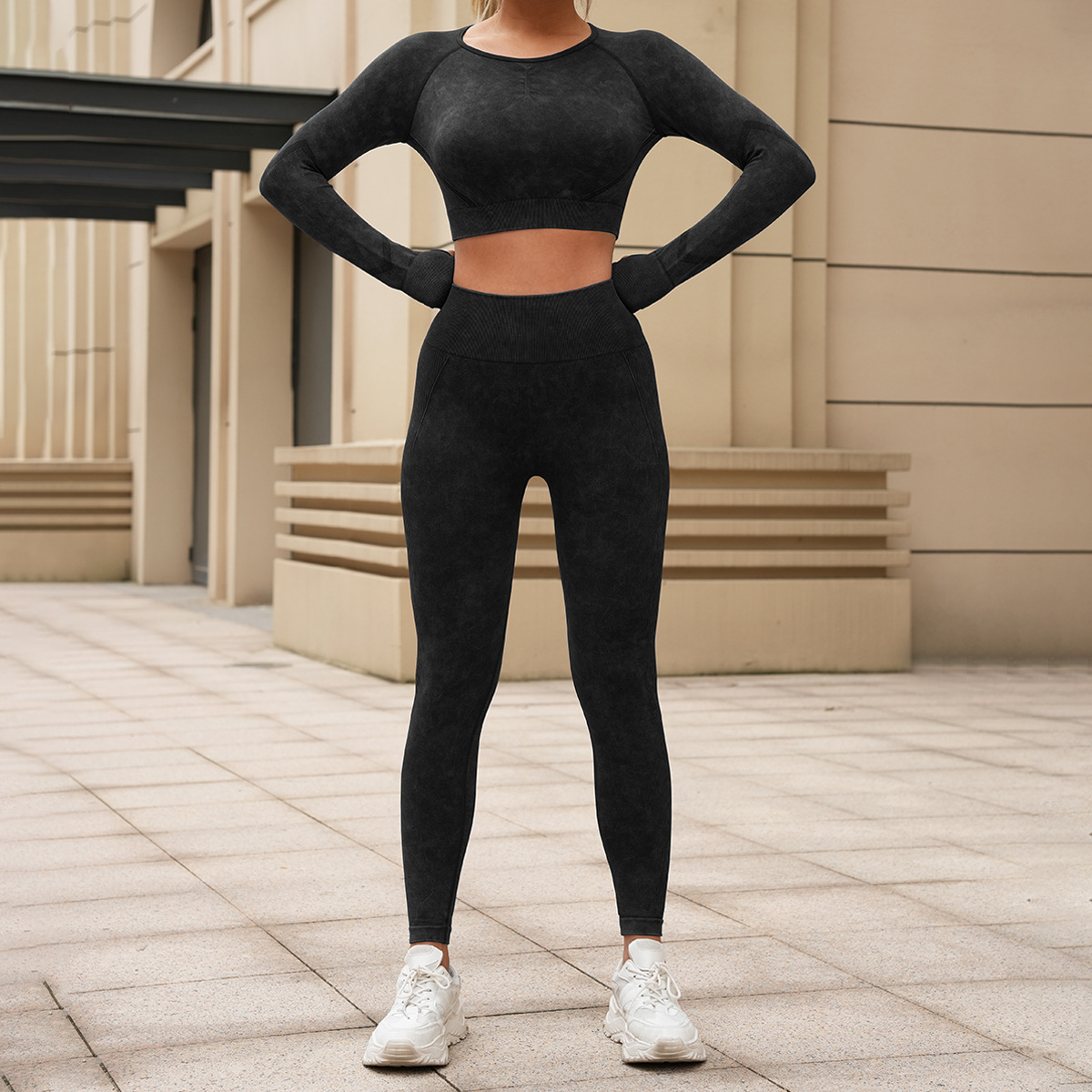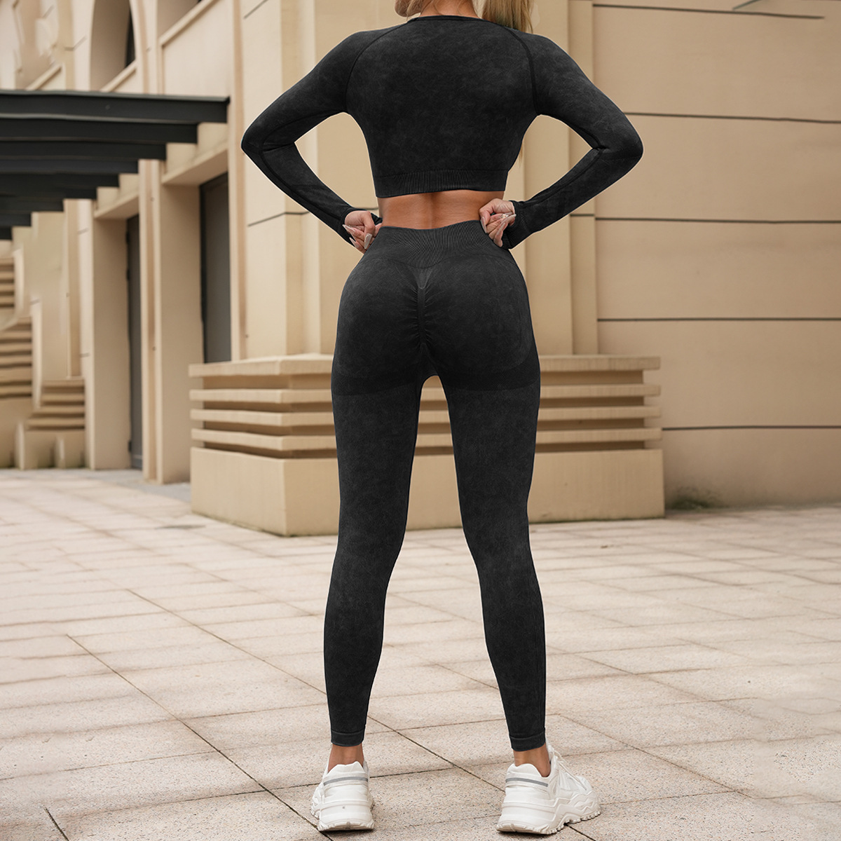 유럽과 미국의 세탁 요가 의류 세트 여성용 긴팔 바지 투피스 세트 슬림핏 허니 힙 세탁 피트니스 바지 세트