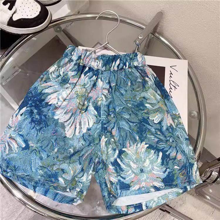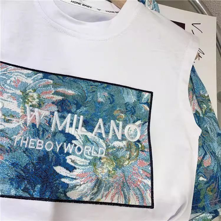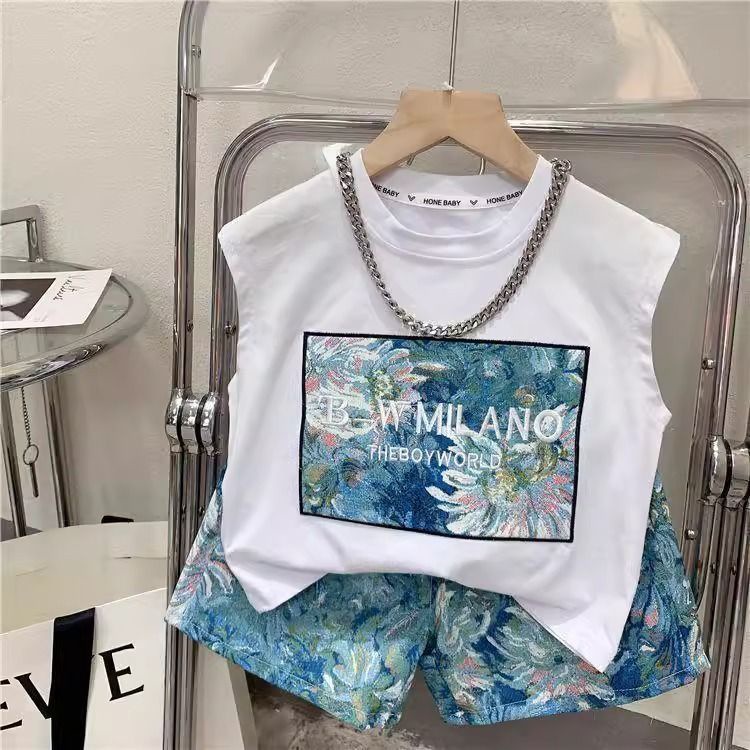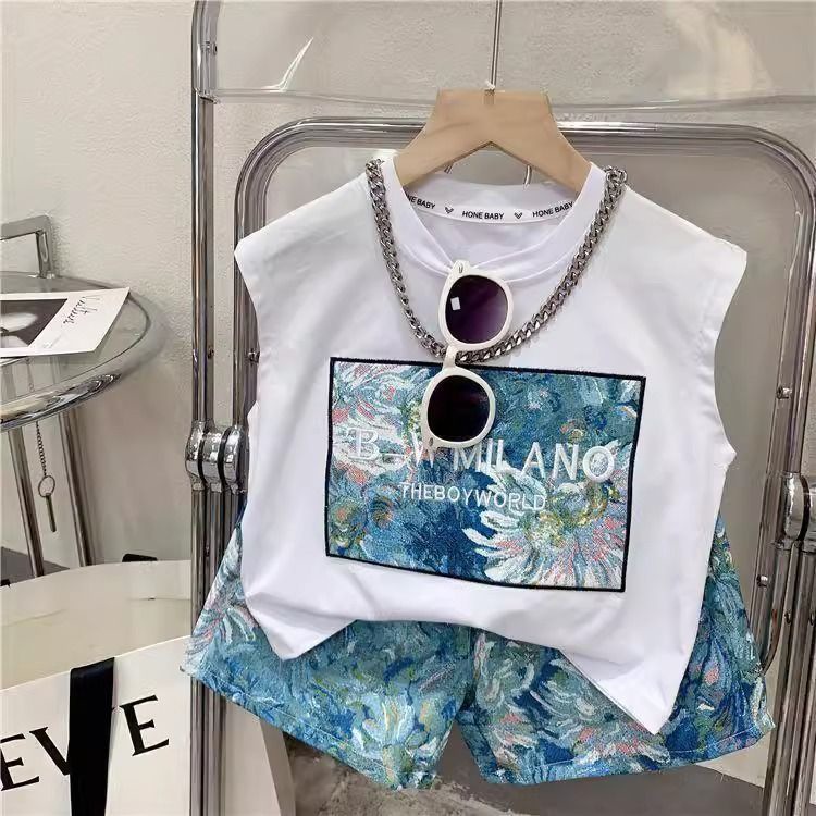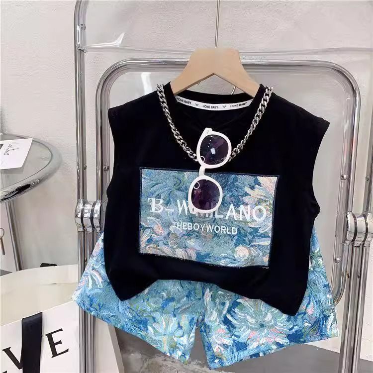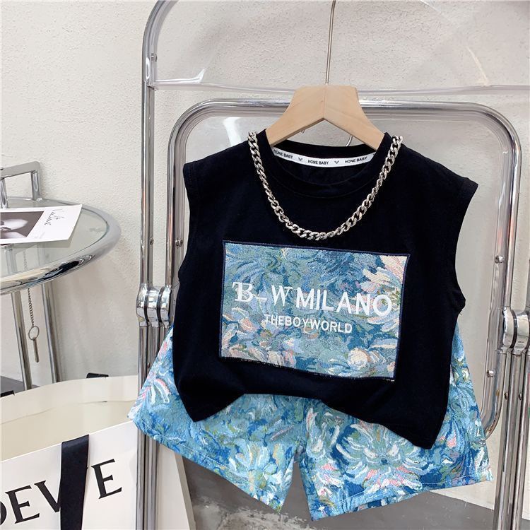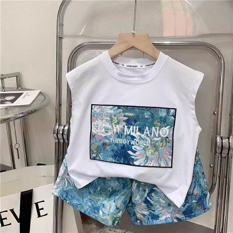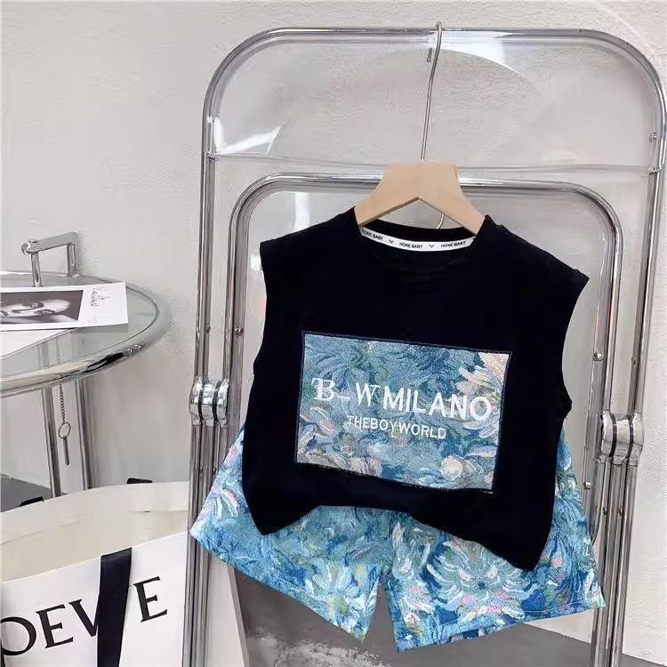 남학생과 여학생 여름 투피스 세트 아기 세련된 어린이 독특한 유행 한국식 비치 레터 베스 티셔츠 반바지스토어 가기