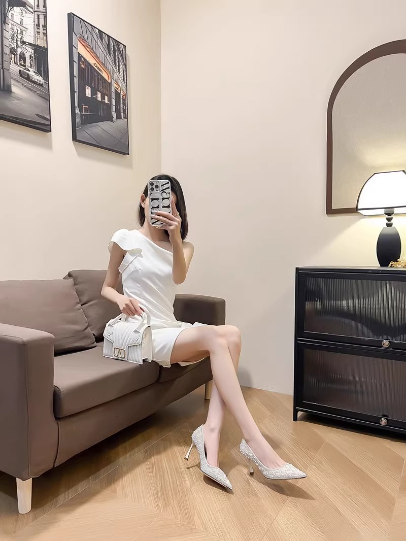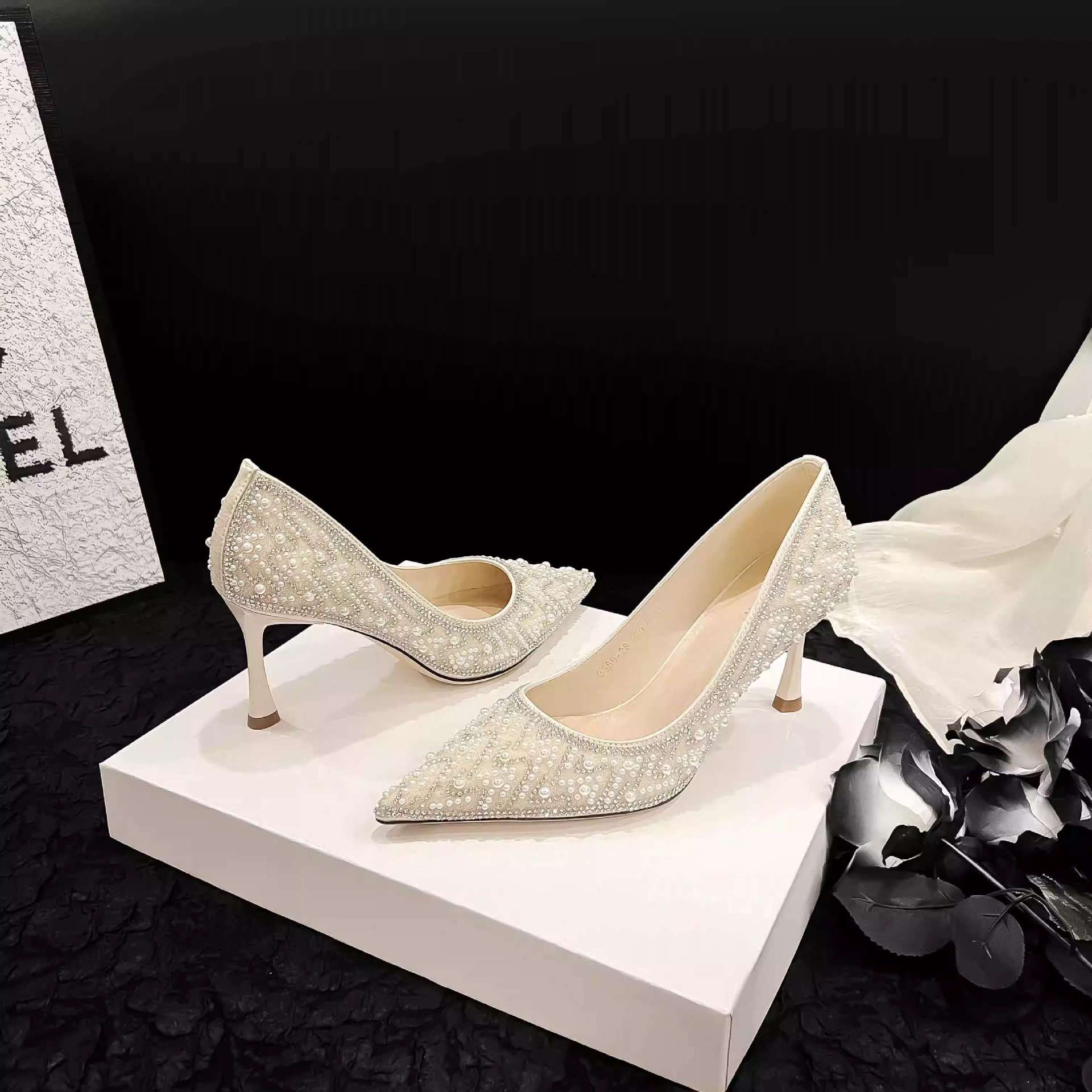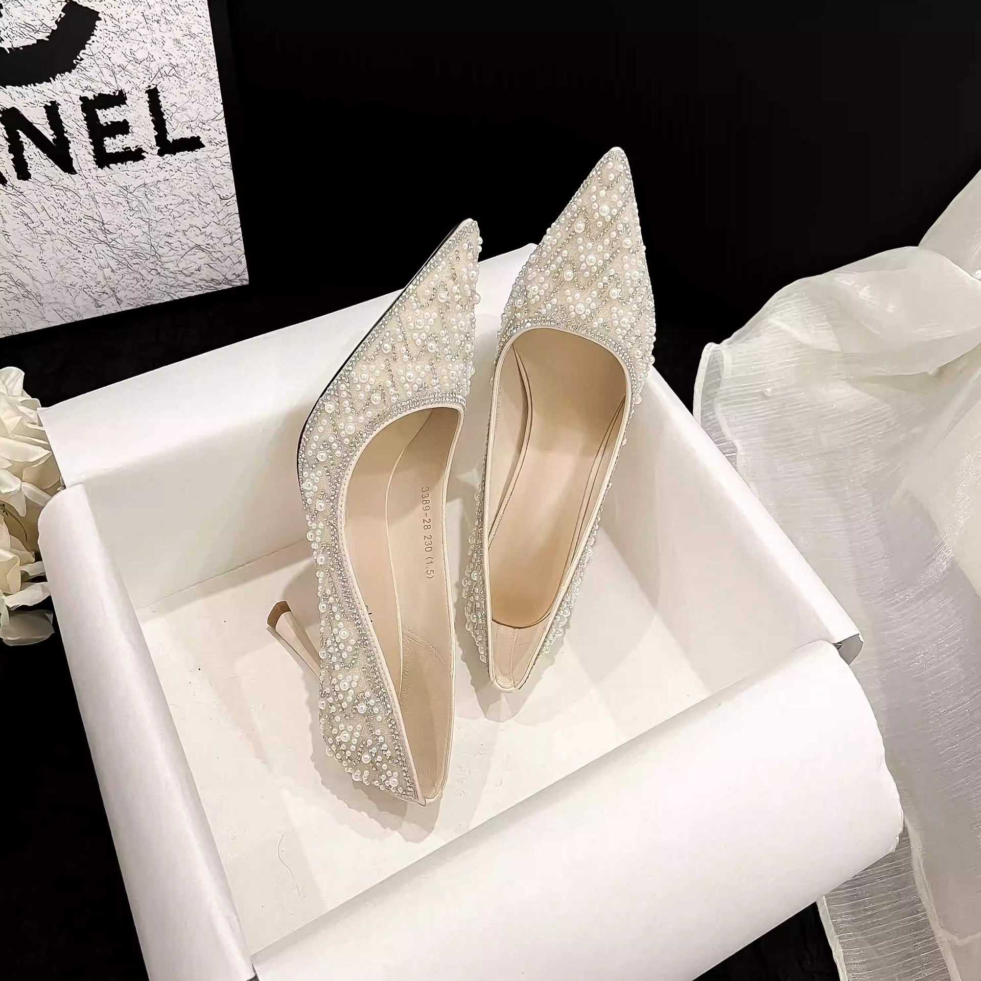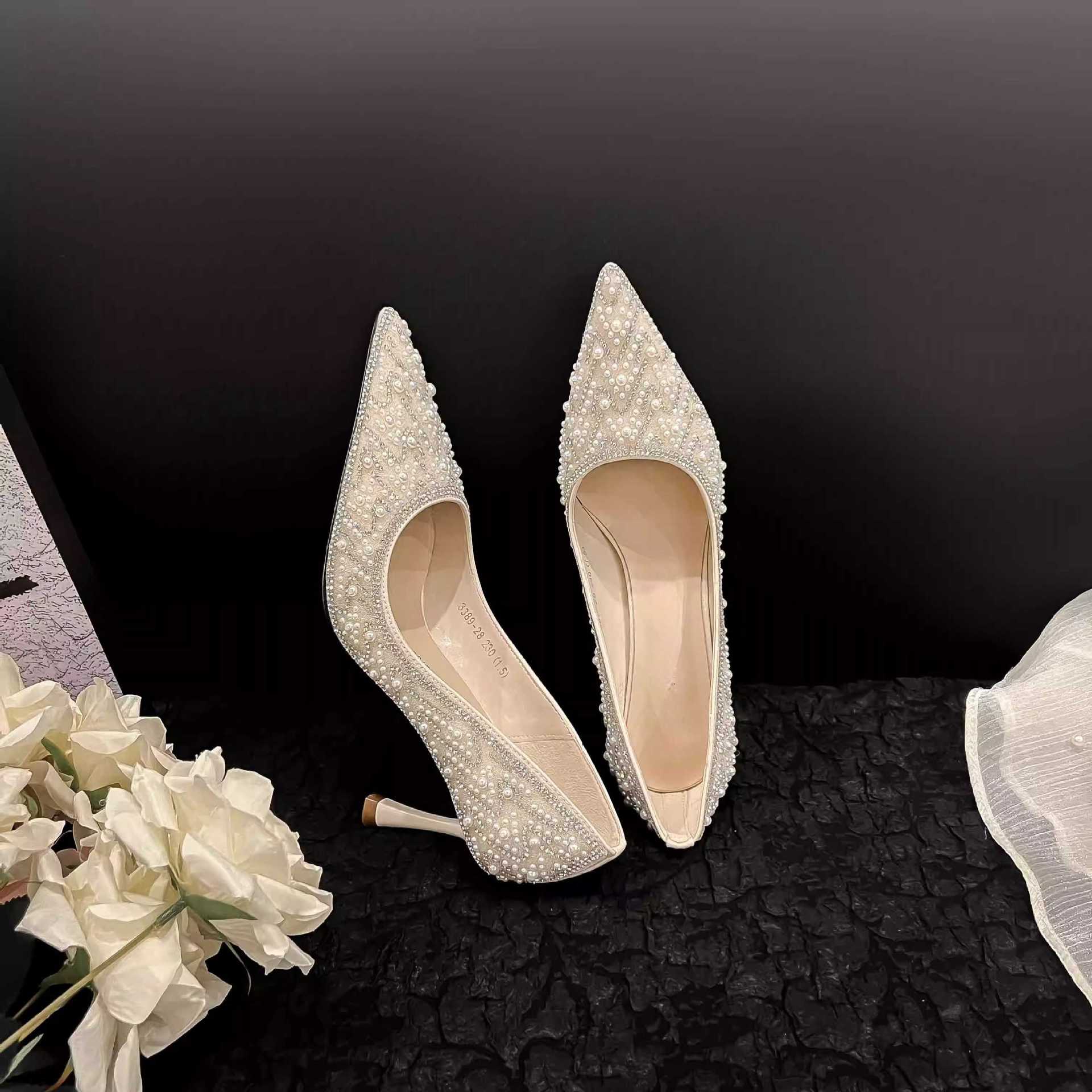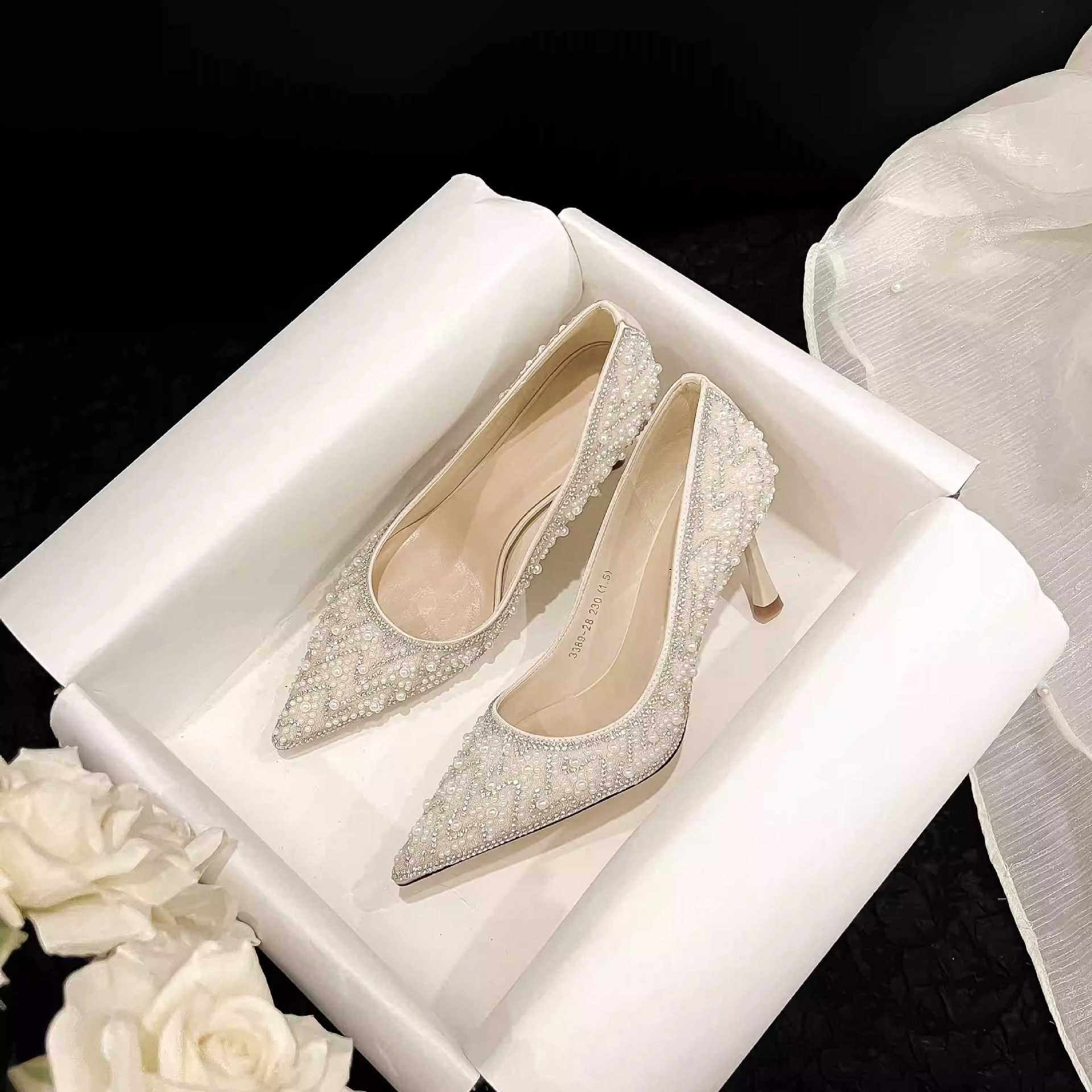 고급스러운 신부 들러리 웨딩 슈즈, 발이 편한 2026 가을 신상 얇은 굽 싱글 슈즈, 워터 다이아몬드 진주 장식 하이힐스토어 가기