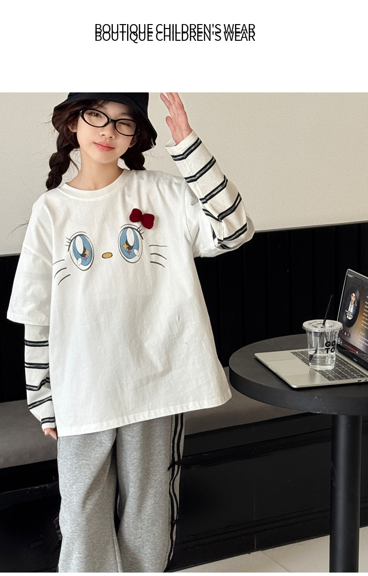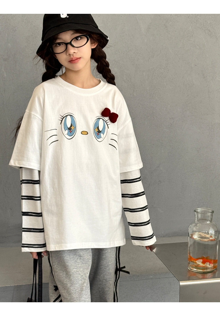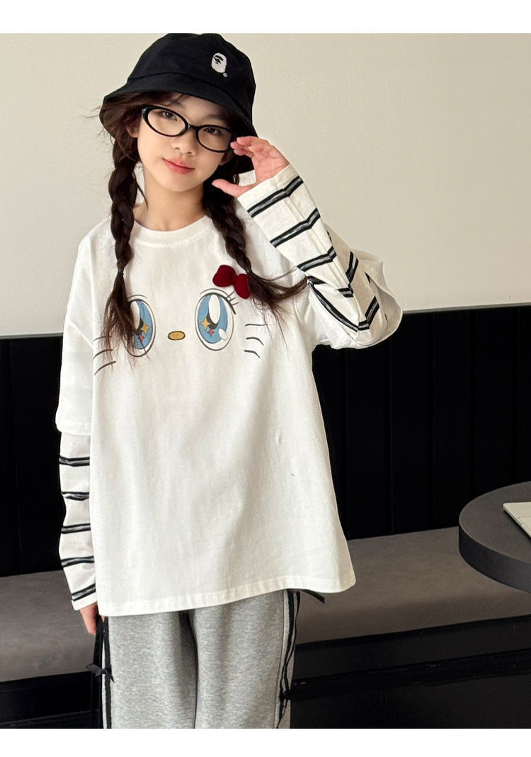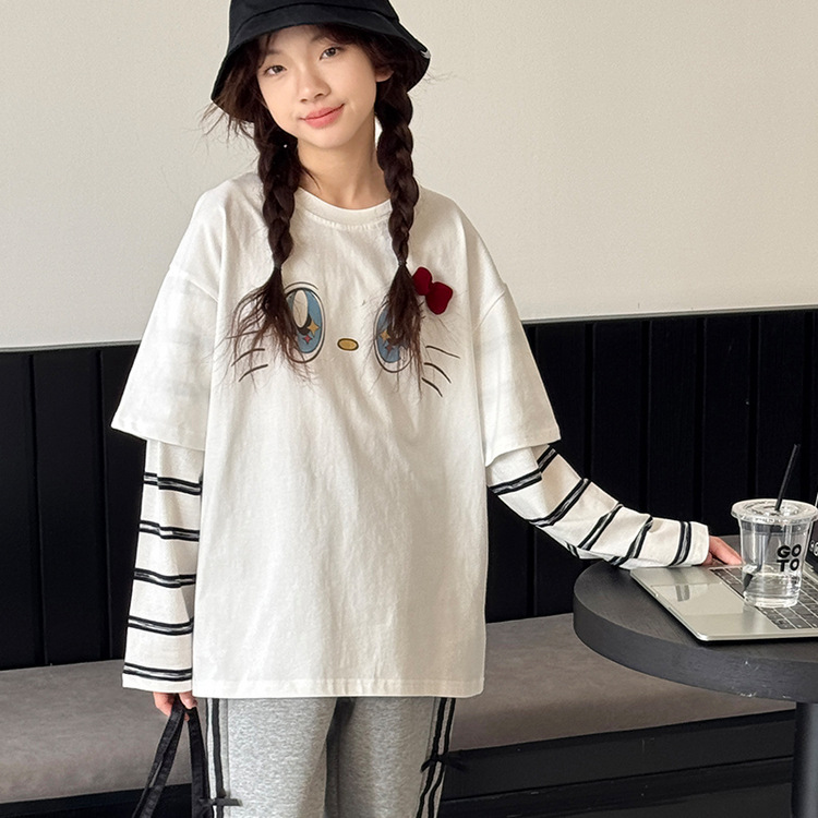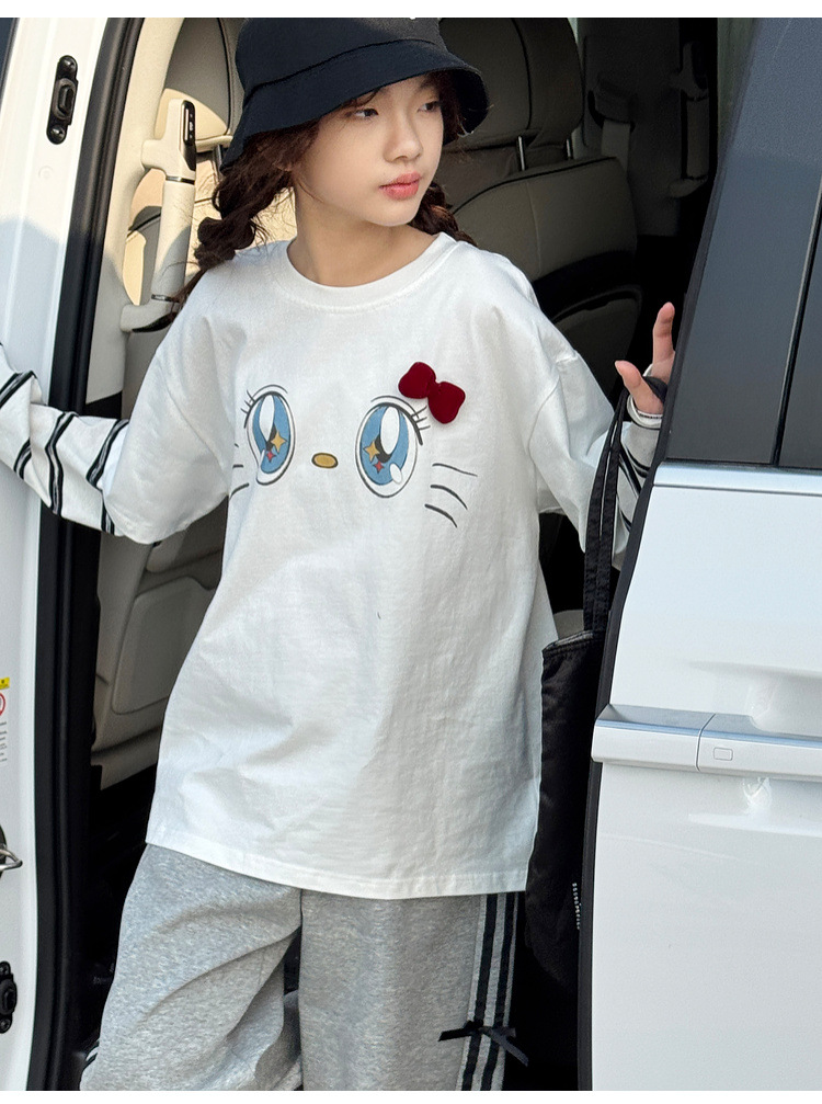 여자 티셔츠 긴 소매 가을 2025 새로운 어린이 느슨한 캐주얼 순수 코튼 다목적 만화 바닥 셔츠 유행 탑