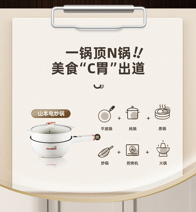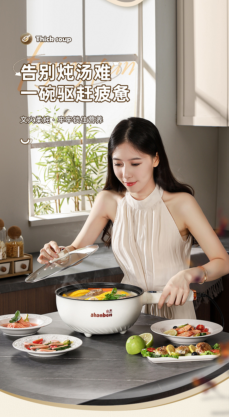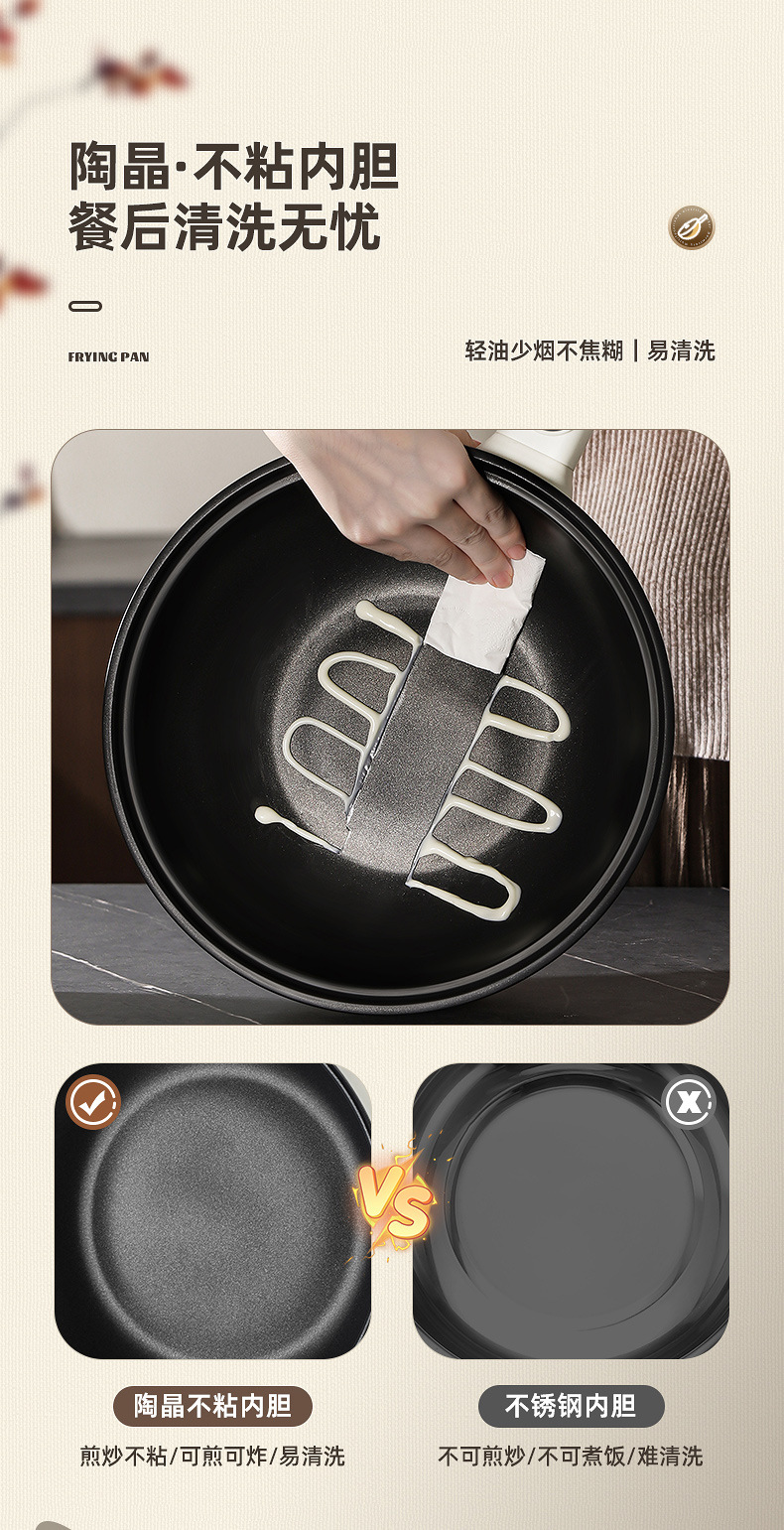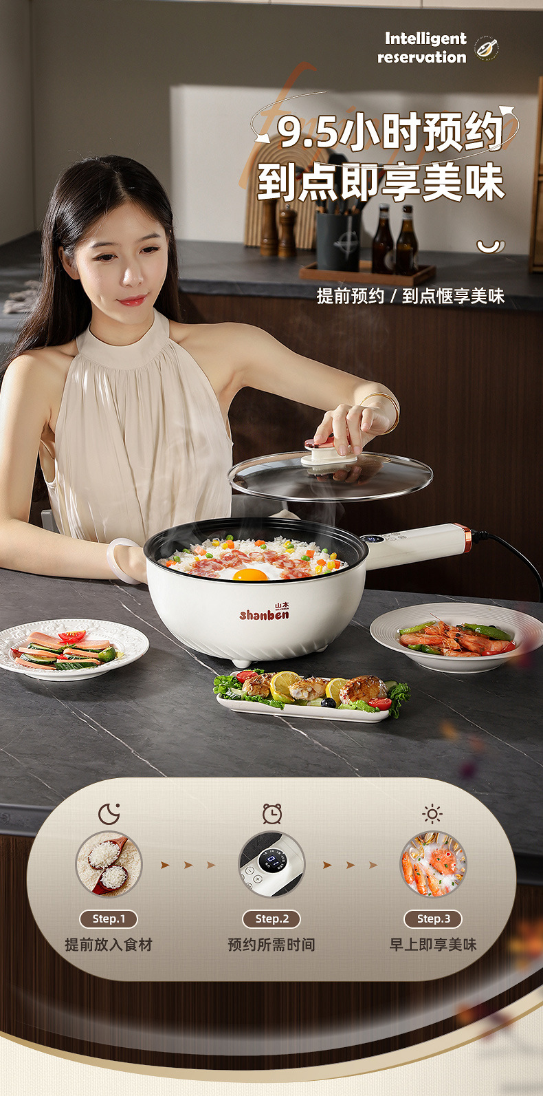 야마모토 전기 볶음 팬 가정용 다기능 통합 전기 요리 팬 전기 팬 튀김 및 김이 나는 비 스틱 팬 전기 뜨거운 냄비