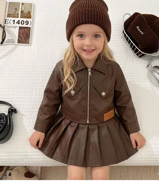 소녀의 가을 PU 가죽 세트 소녀의 한국 스타일 유행 베어러 옷 어린이 가죽 재킷 주름 치마 투피스 세트