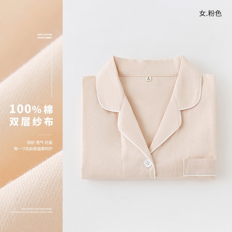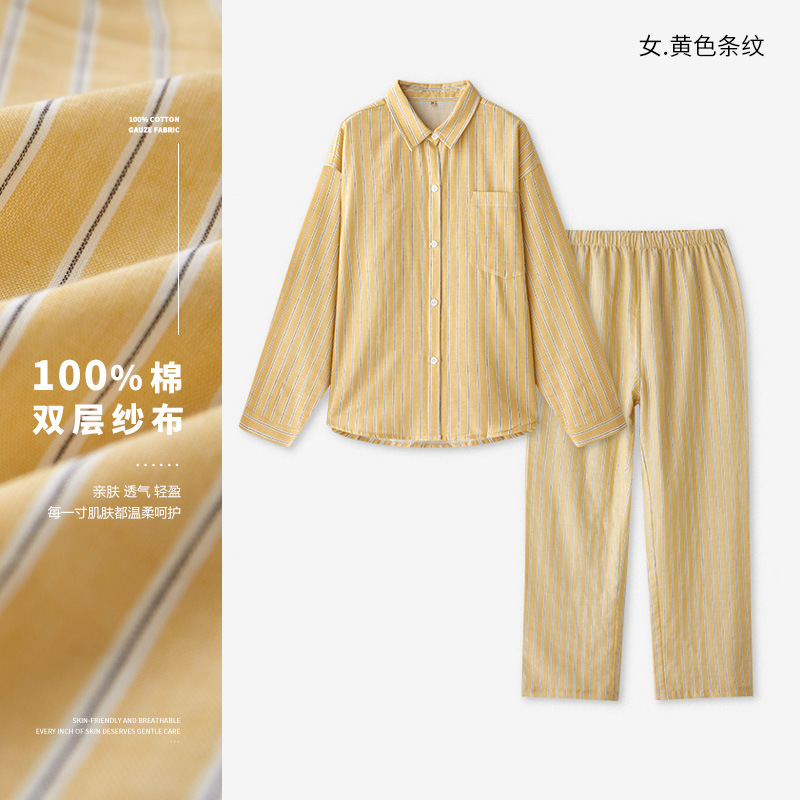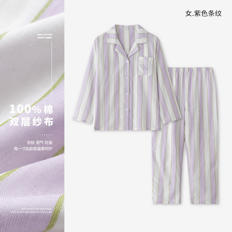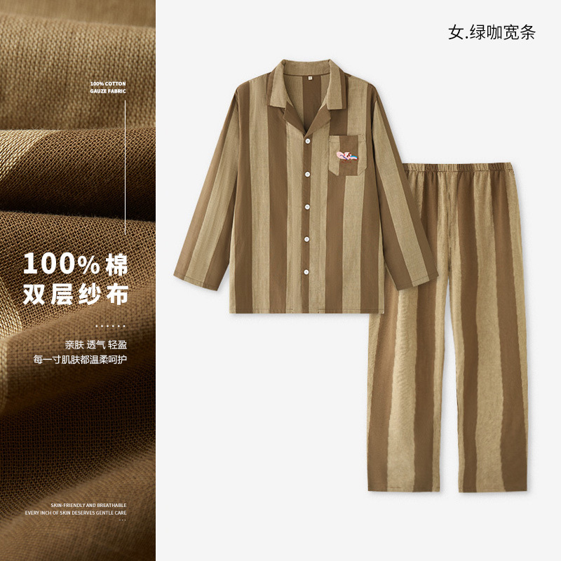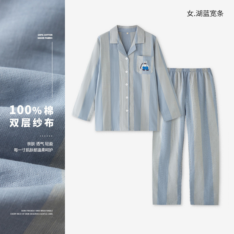 특가-커플 잠옷 여성용 봄, 가을 순면 거즈 남성용 면 긴팔 홈웨어 커플 세트 대형 사이즈