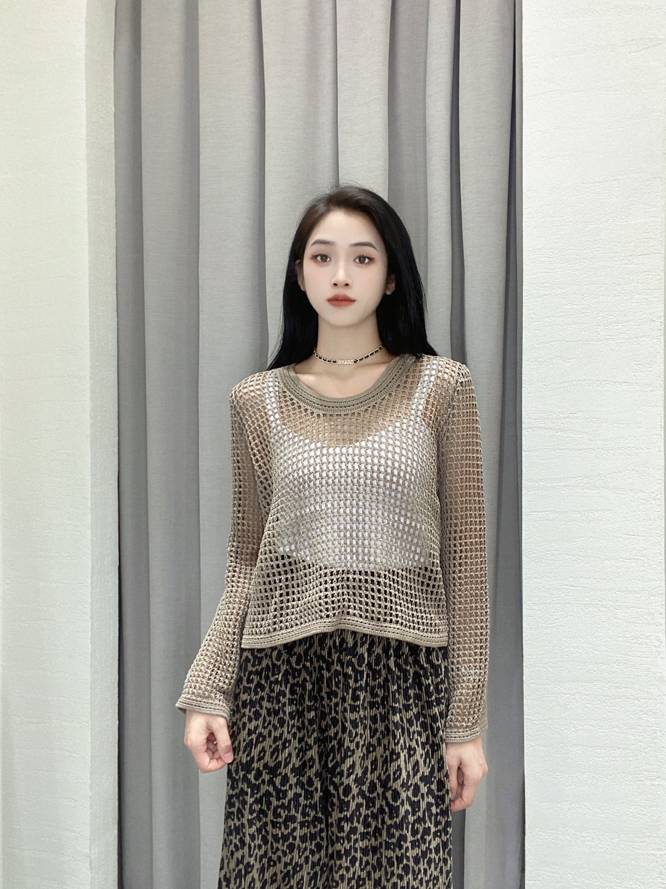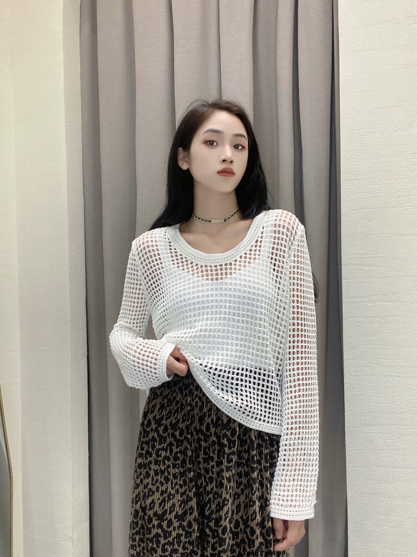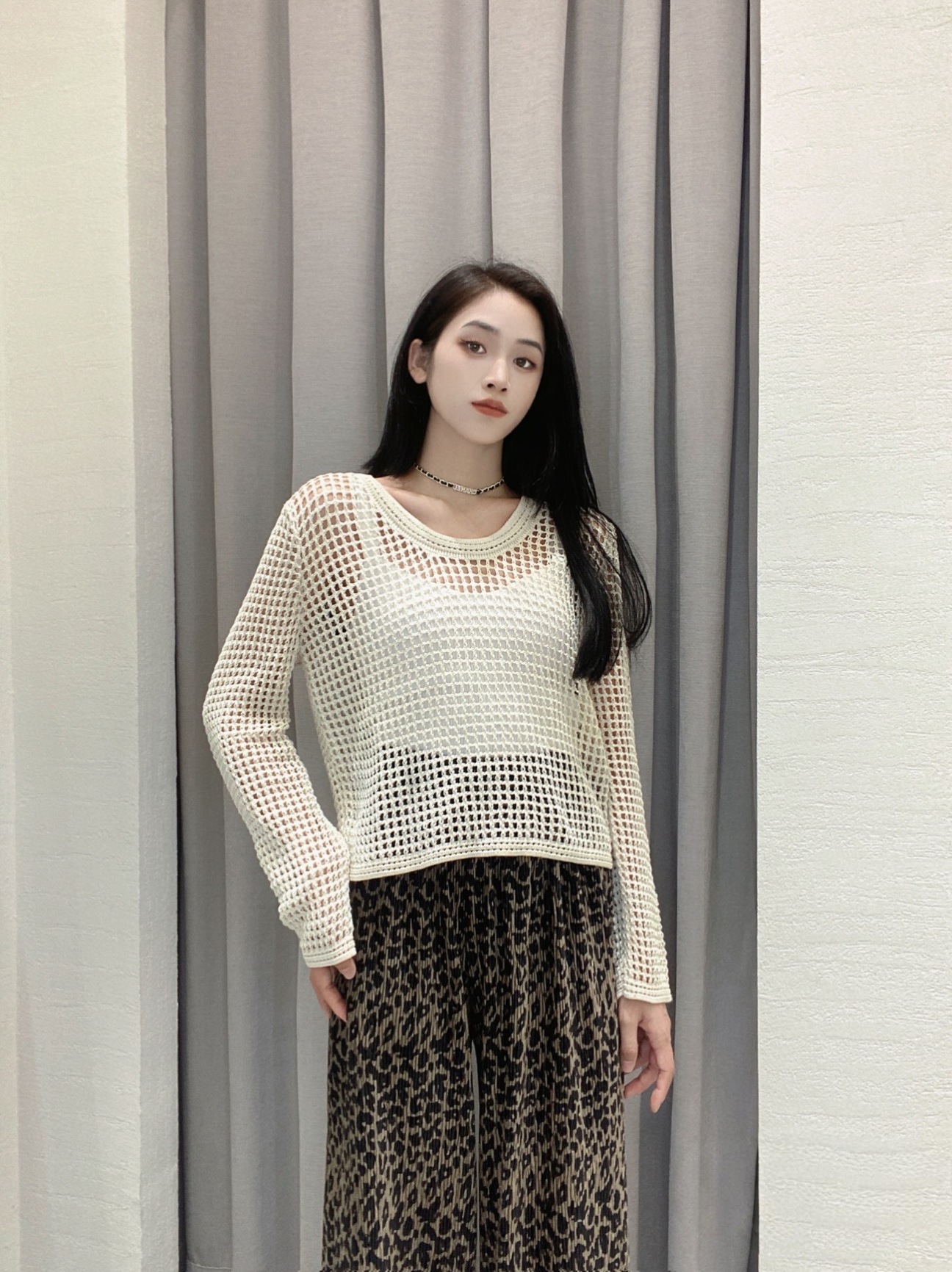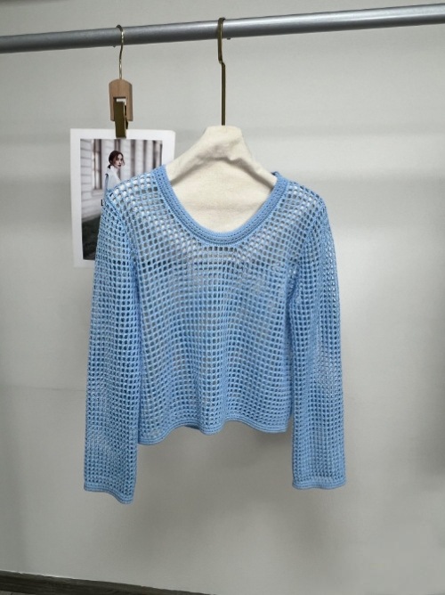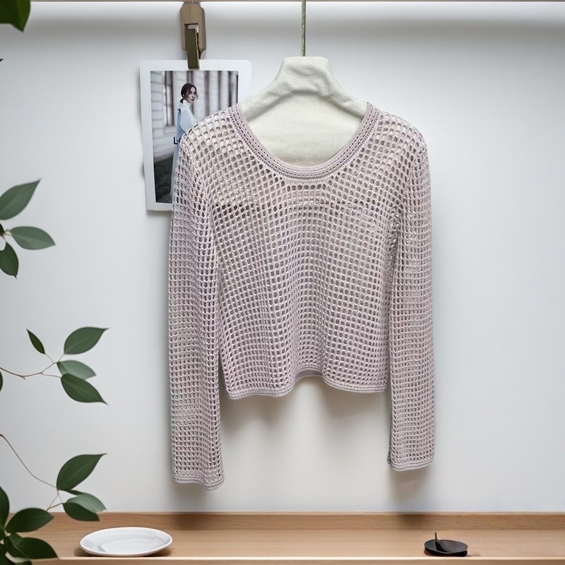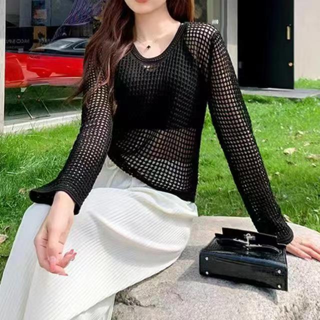 봄과 여름 중공 니트웨어 여성의 2025 새로운 얇은 둥근 목 긴 소매 느슨한 풀오버 올 매치 탑 패션 블라우스스토어 가기