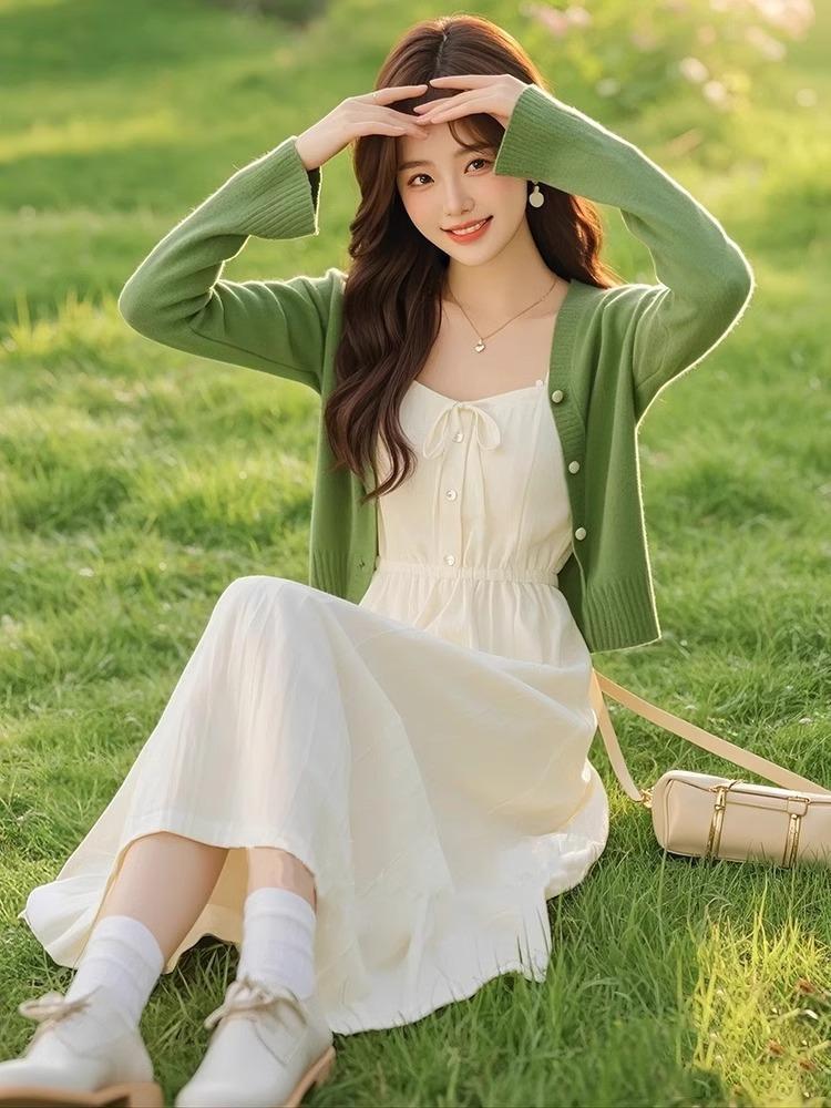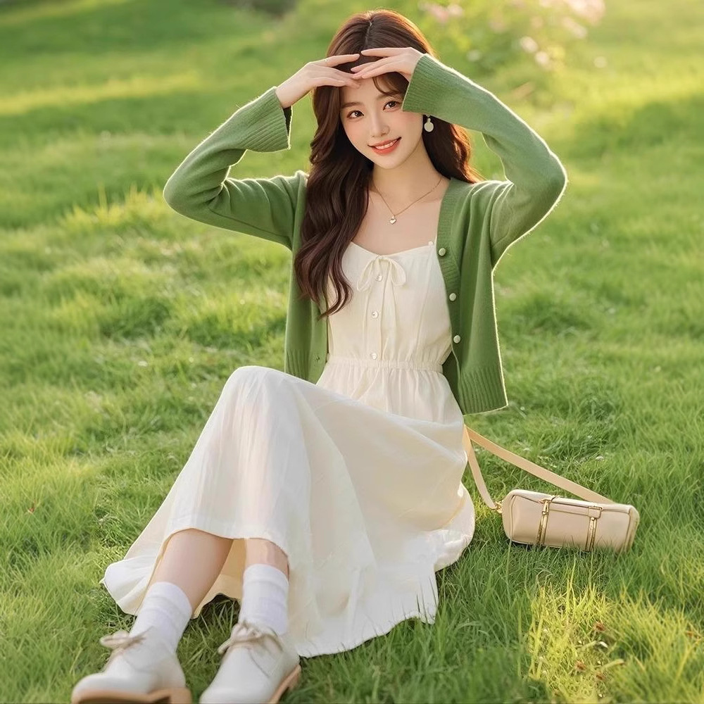 모리 스타일의 완전한 세트와 봄 원피스 사교계 기질 녹색 니트 카디건 부드러운 바람 서스펜더 스커트 세트 착용