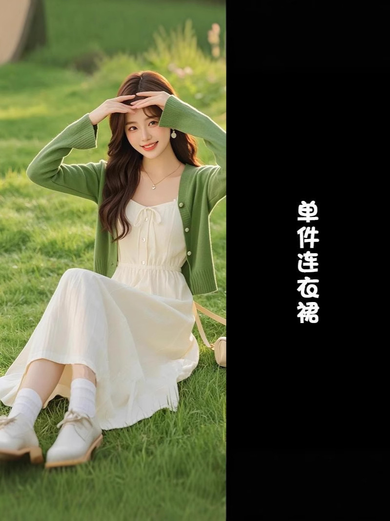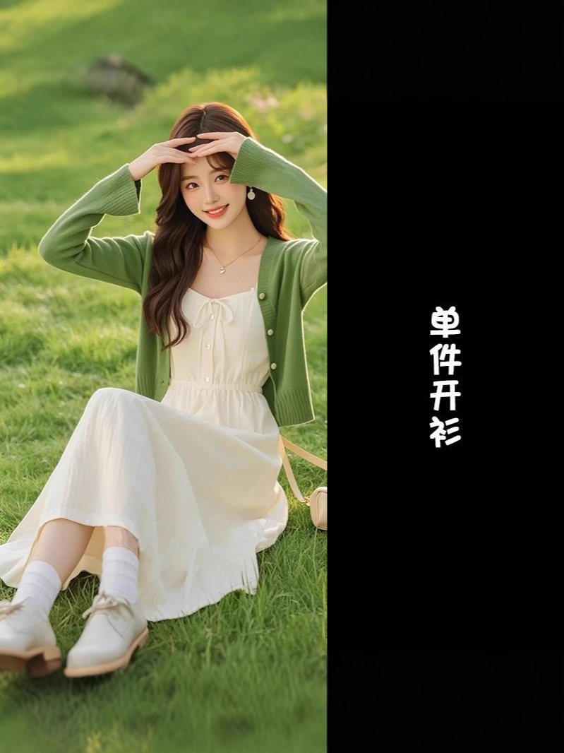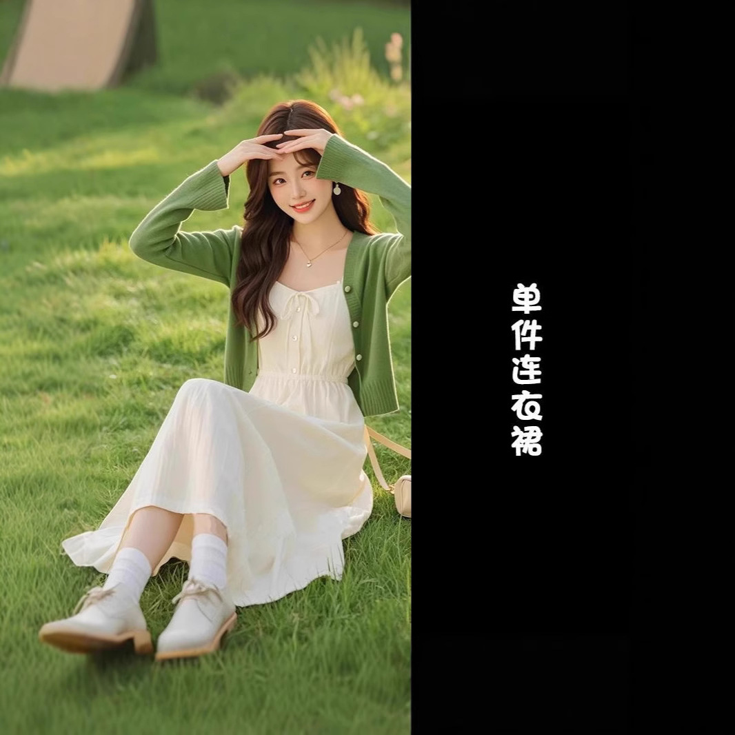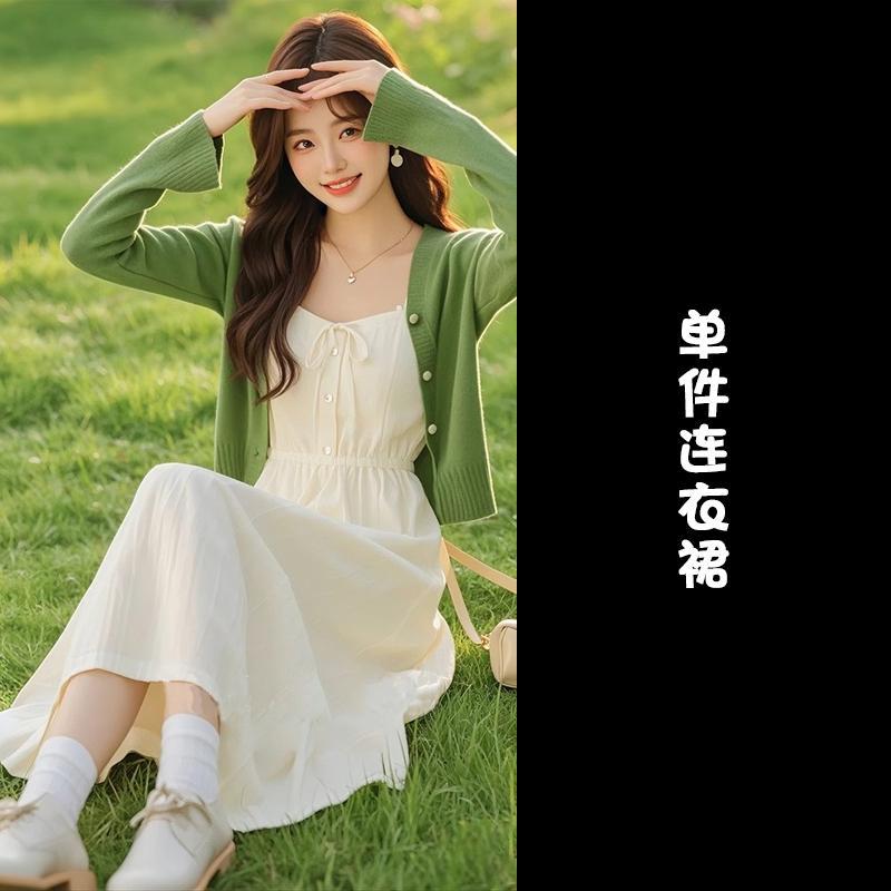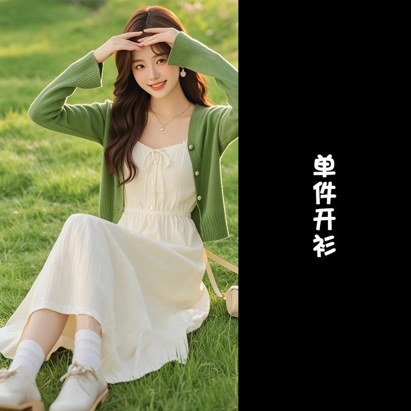 모리 스타일의 완전한 세트와 봄 원피스 사교계 기질 녹색 니트 카디건 부드러운 바람 서스펜더 스커트 세트 착용스토어 가기