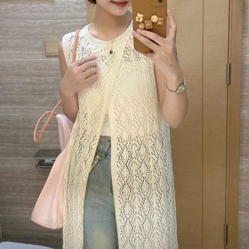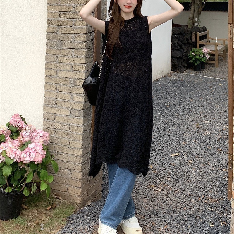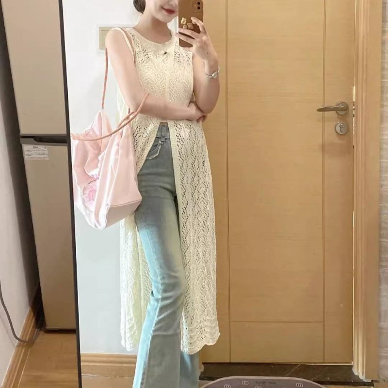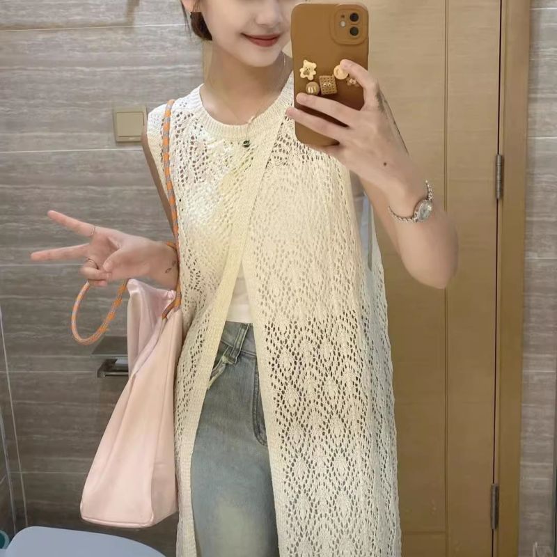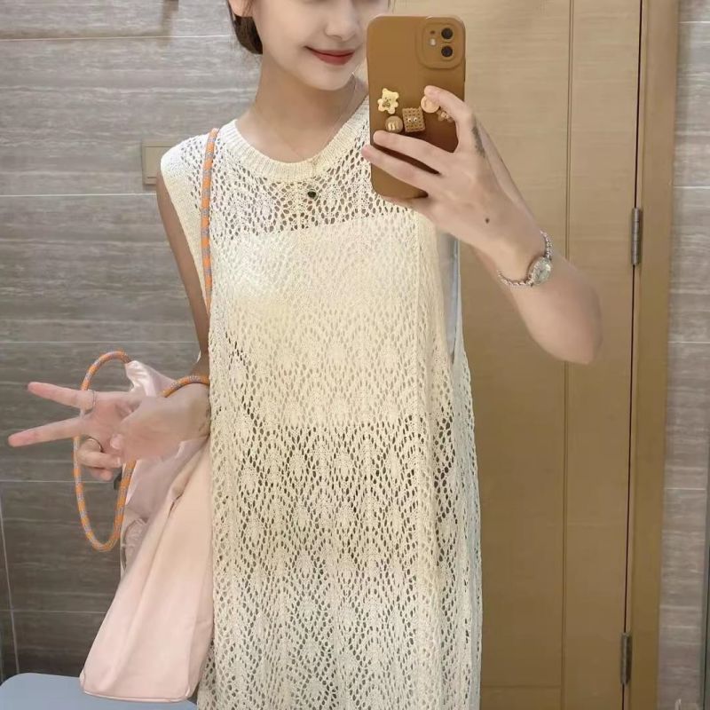 뜨거운 여자 착용 원피스 여름 프랑스 중공 베스파 스커트 니트 스웨터 여성용 얇은 외부 블라우스스토어 가기