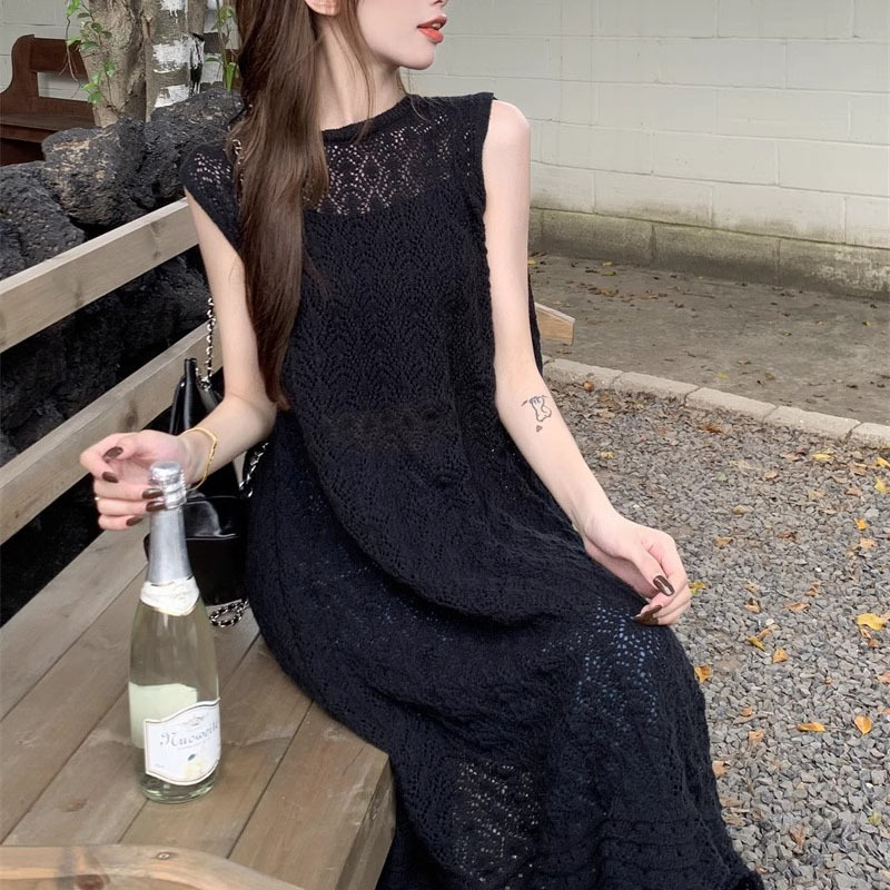 뜨거운 여자 착용 원피스 여름 프랑스 중공 베스파 스커트 니트 스웨터 여성용 얇은 외부 블라우스
