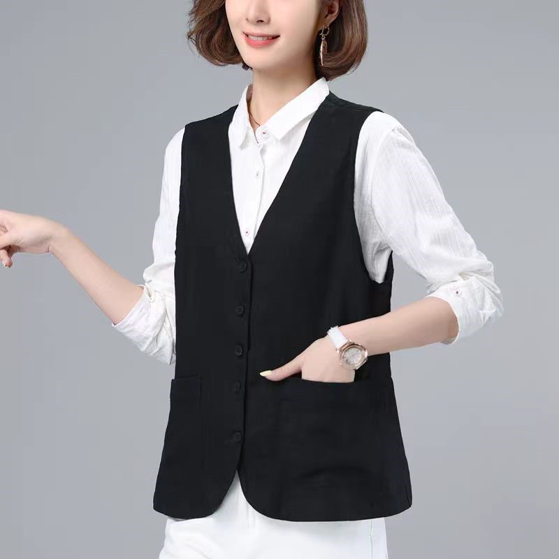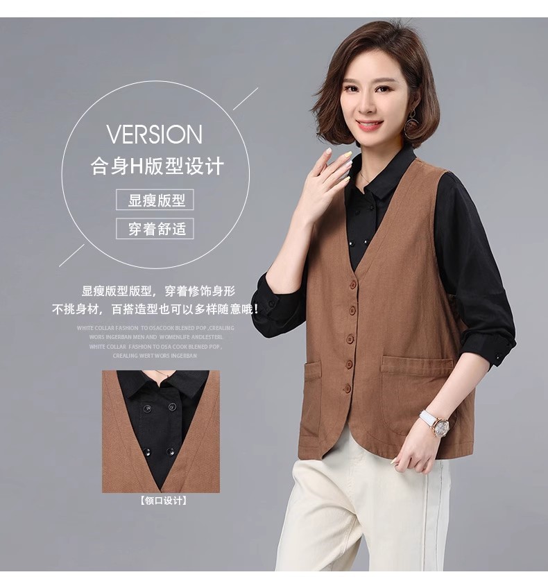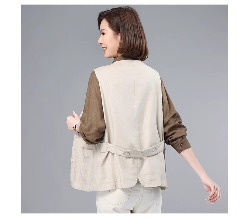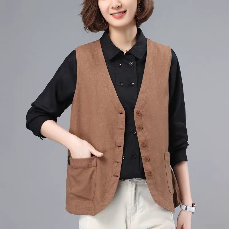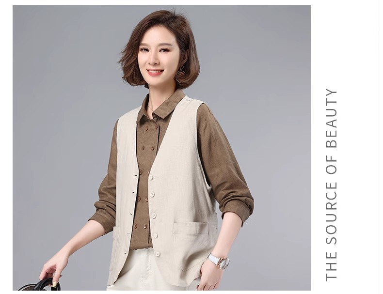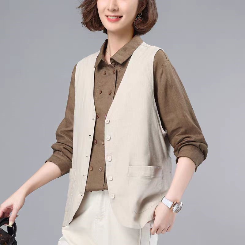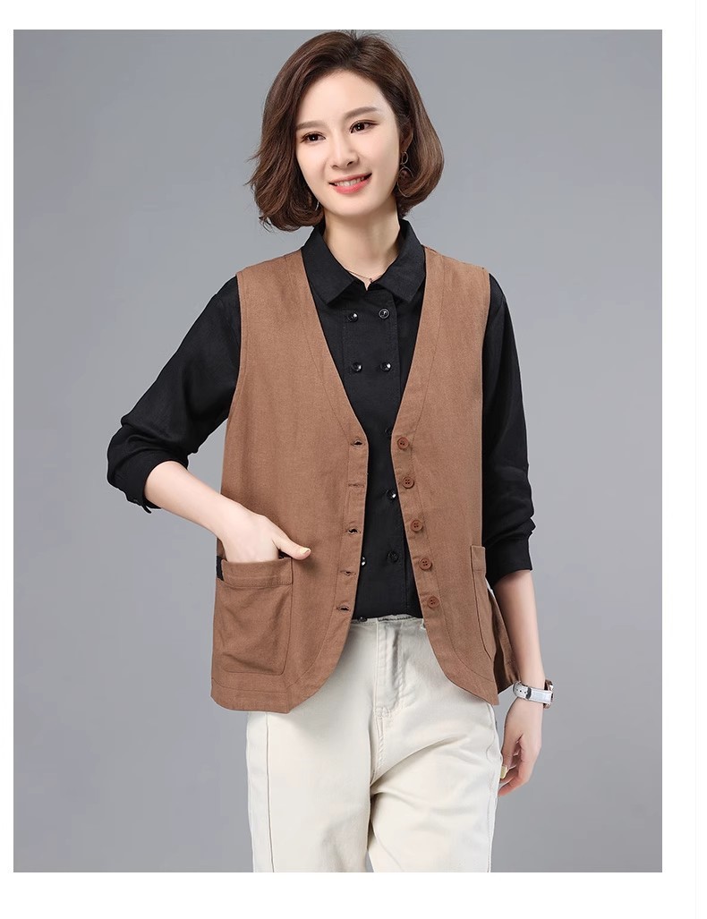 공식 피겨 코튼 및 리넨 조끼 여성 쇼트 2025 봄 여름 한국 스타일 중년 어머니 레트로 웨이스트 코트 외부 얇은 조끼 착용