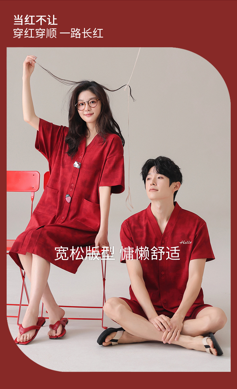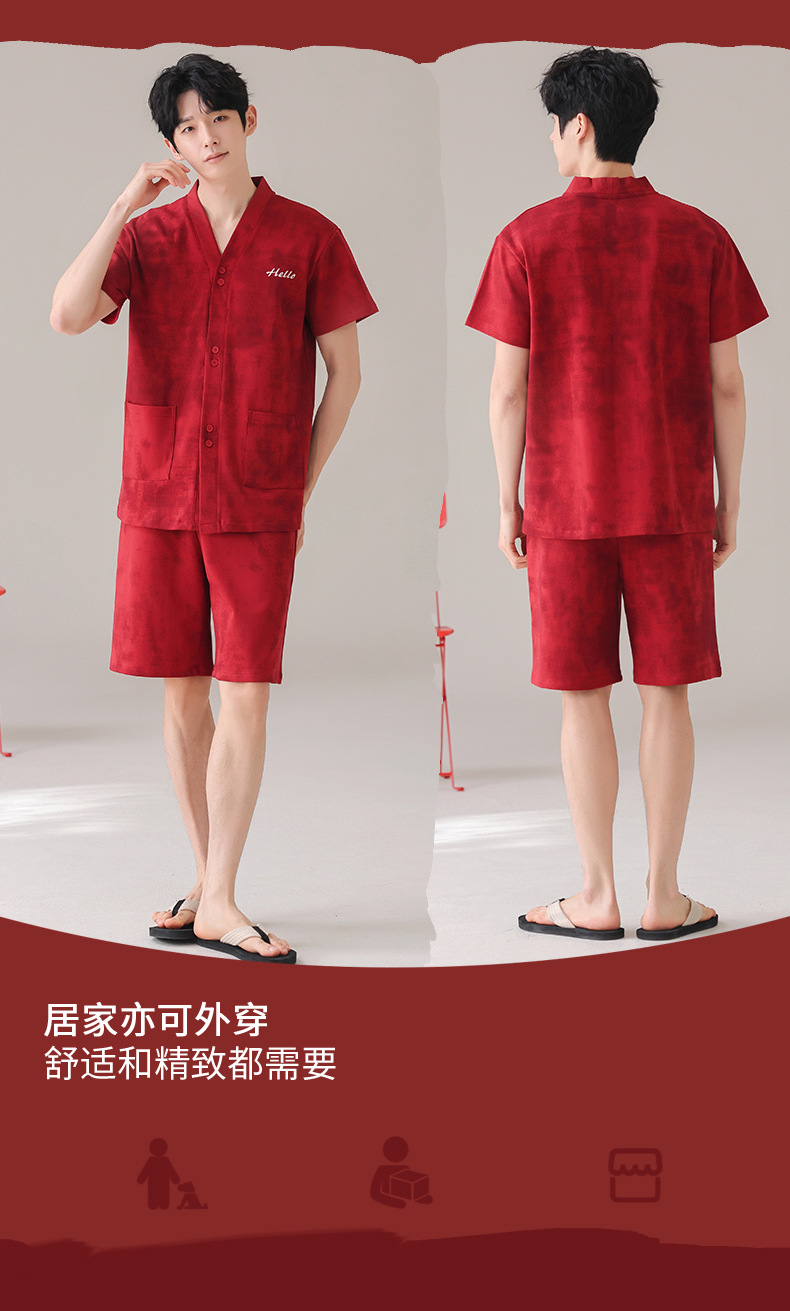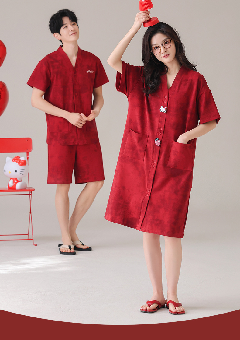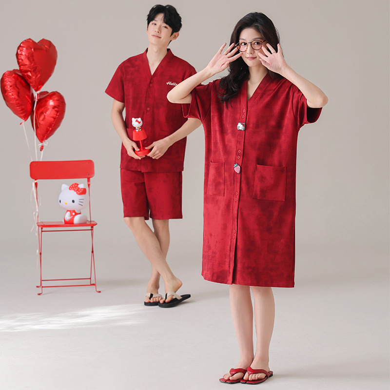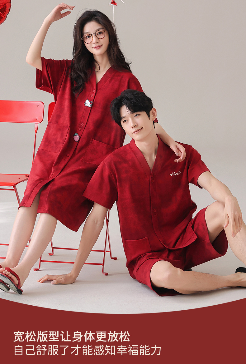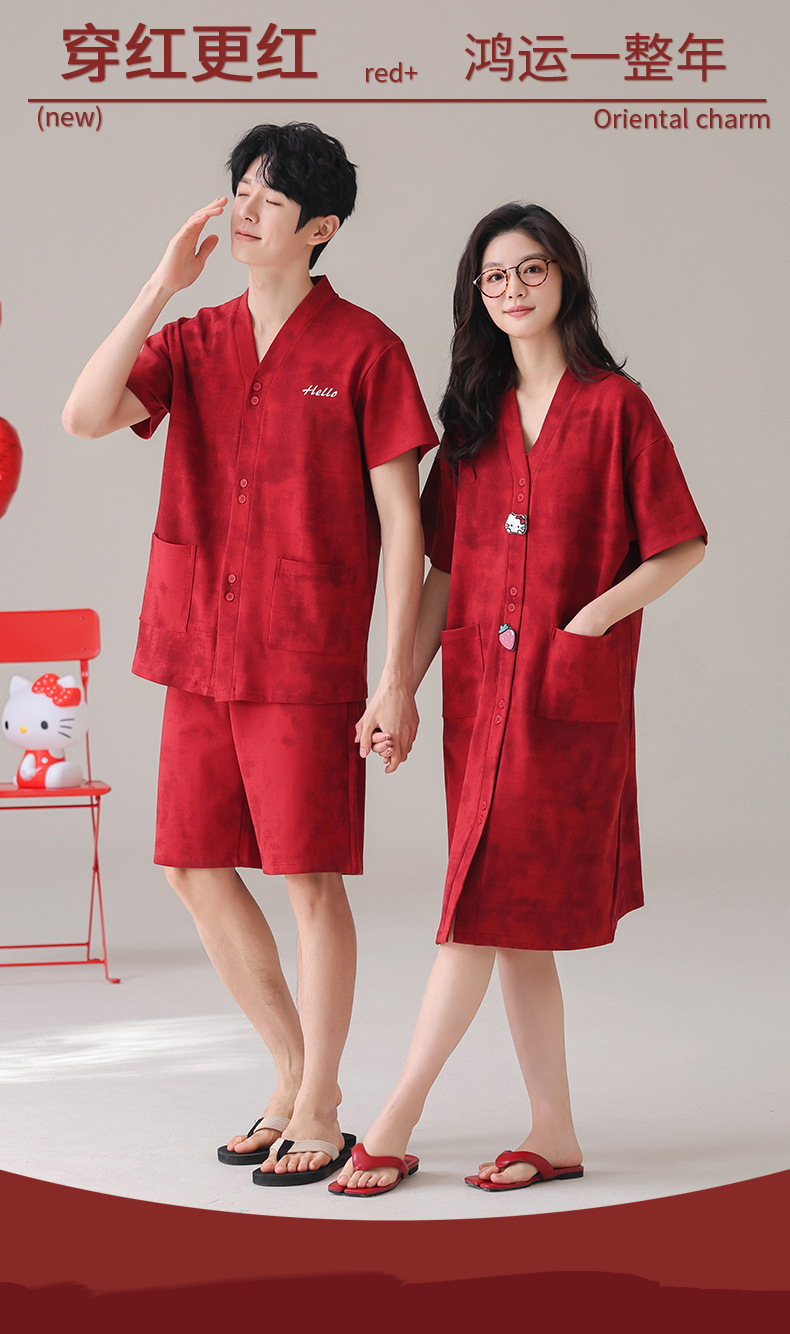 빨간 커플 잠옷 여름 결혼식 신혼 여성 반팔 면화 잠옷 얇은 남자 생활 년 홈 의류 세트