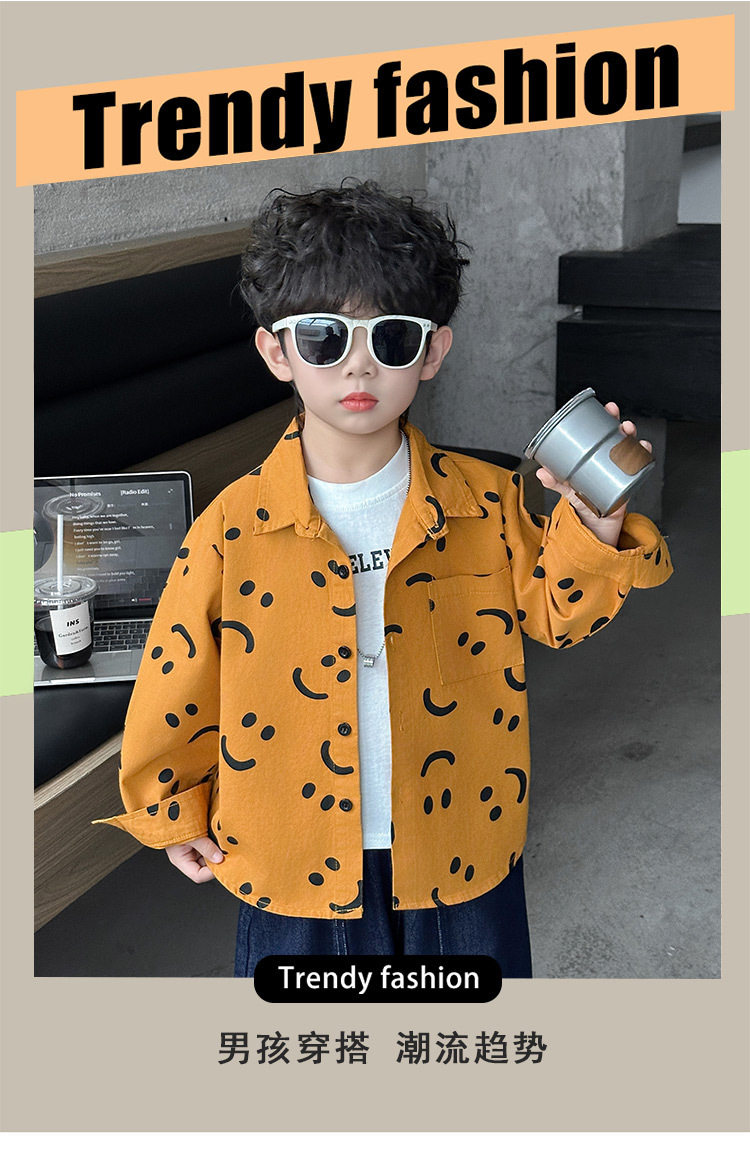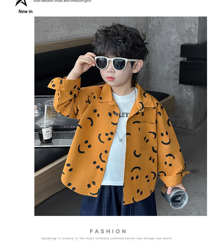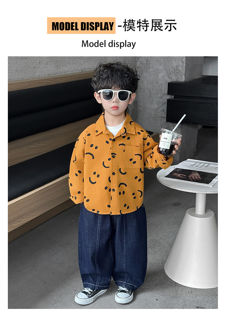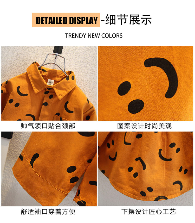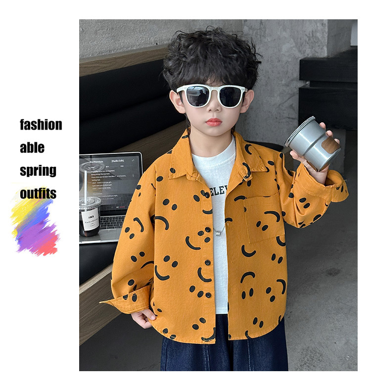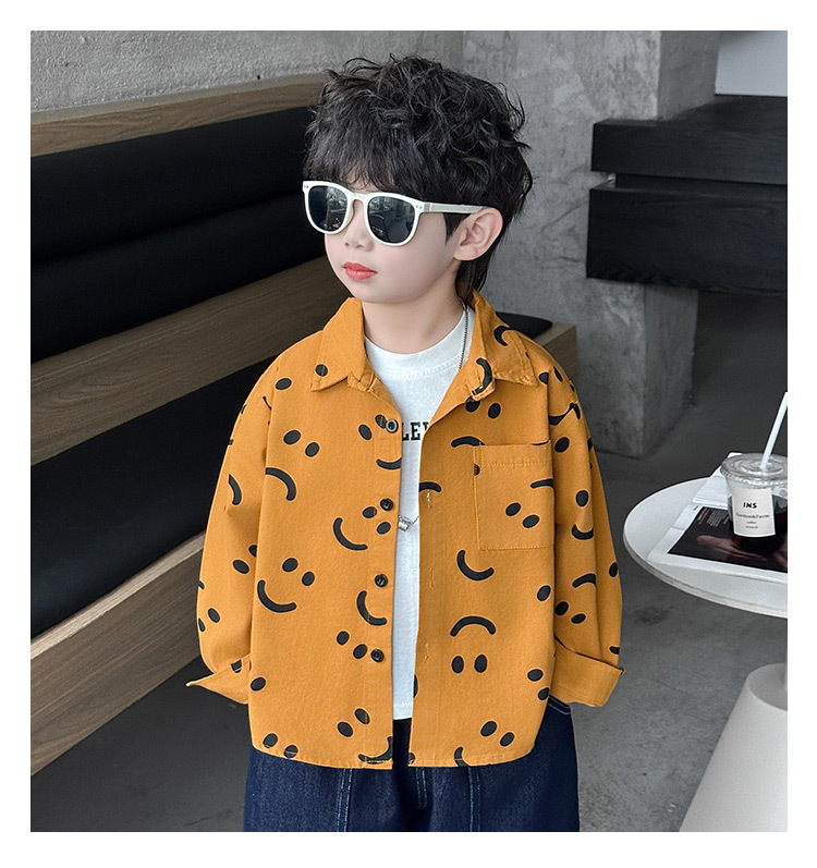 남아용 순면 통기성 스마일 셔츠, 긴팔, 봄, 가을 신상, 아동용 패셔너블하고 부드럽고 편안한 상의, 트렌디스토어 가기