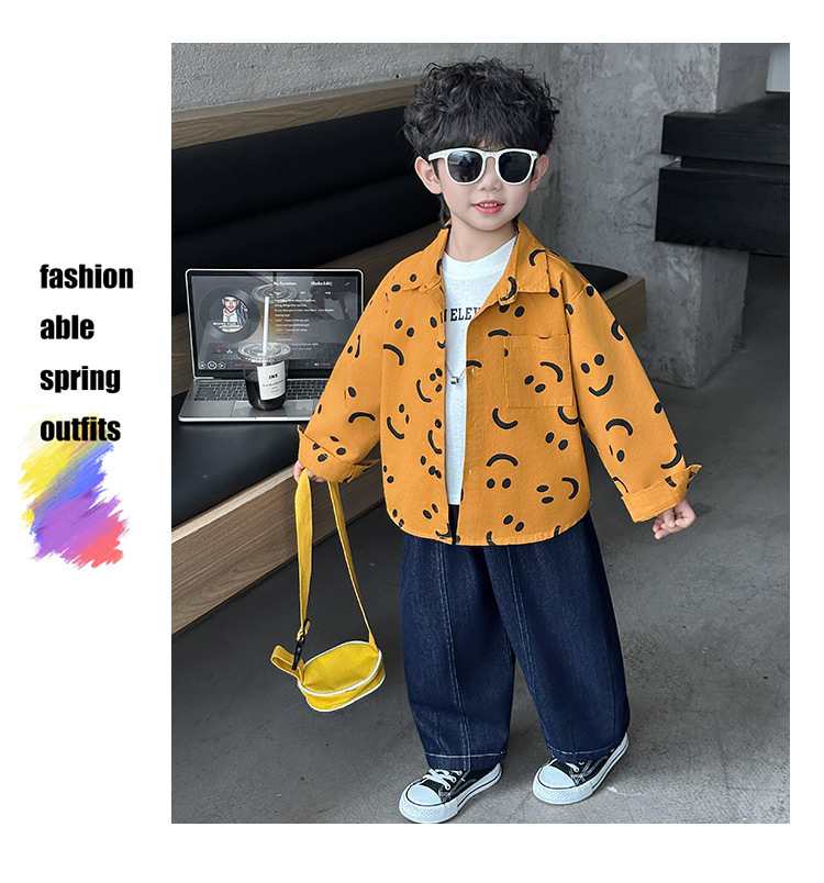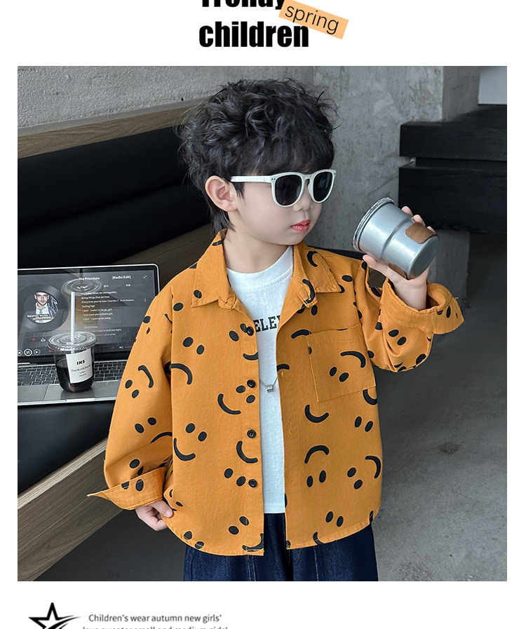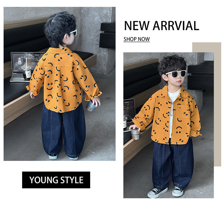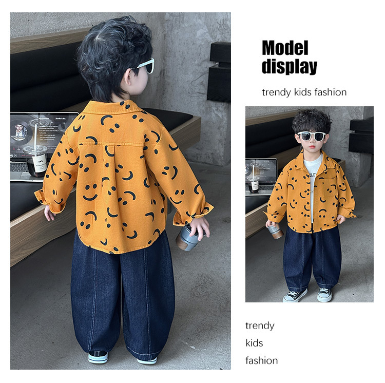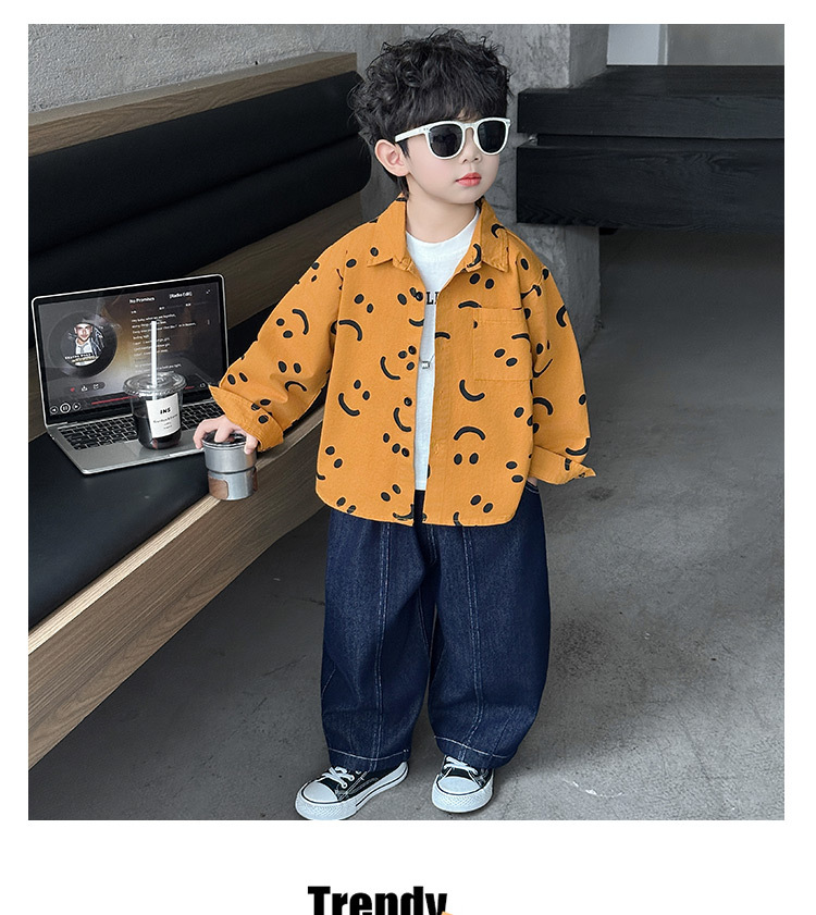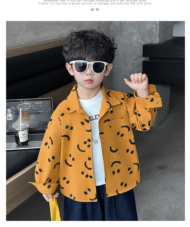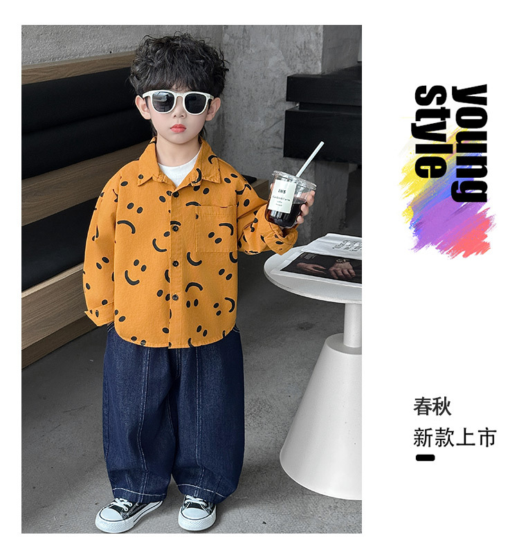 남아용 순면 통기성 스마일 셔츠, 긴팔, 봄, 가을 신상, 아동용 패셔너블하고 부드럽고 편안한 상의, 트렌디스토어 가기