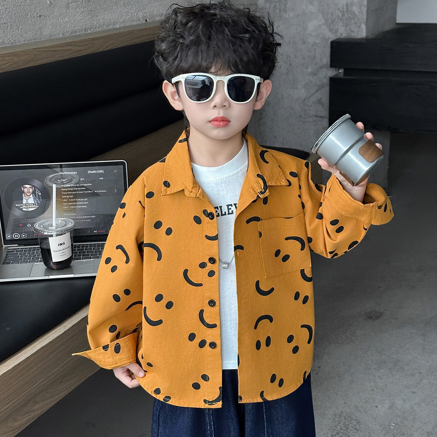 남아용 순면 통기성 스마일 셔츠, 긴팔, 봄, 가을 신상, 아동용 패셔너블하고 부드럽고 편안한 상의, 트렌디