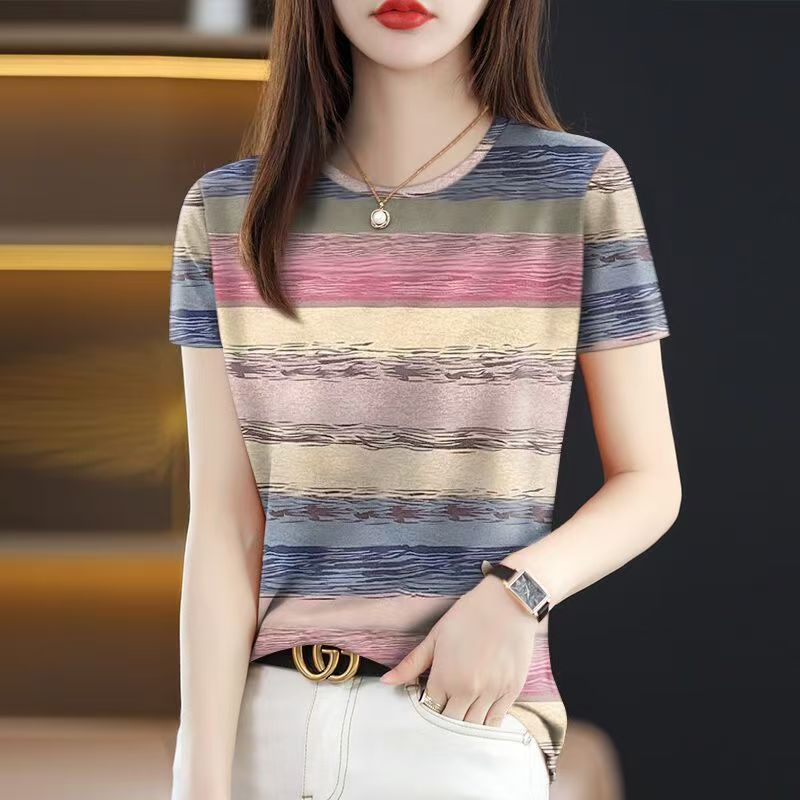 패션 여성 티셔츠 짧은 소매 2025 여름 새로운 라운드 넥 풀오버 웨스턴 스타일 복고풍 느슨한 최고 인기 트렌드