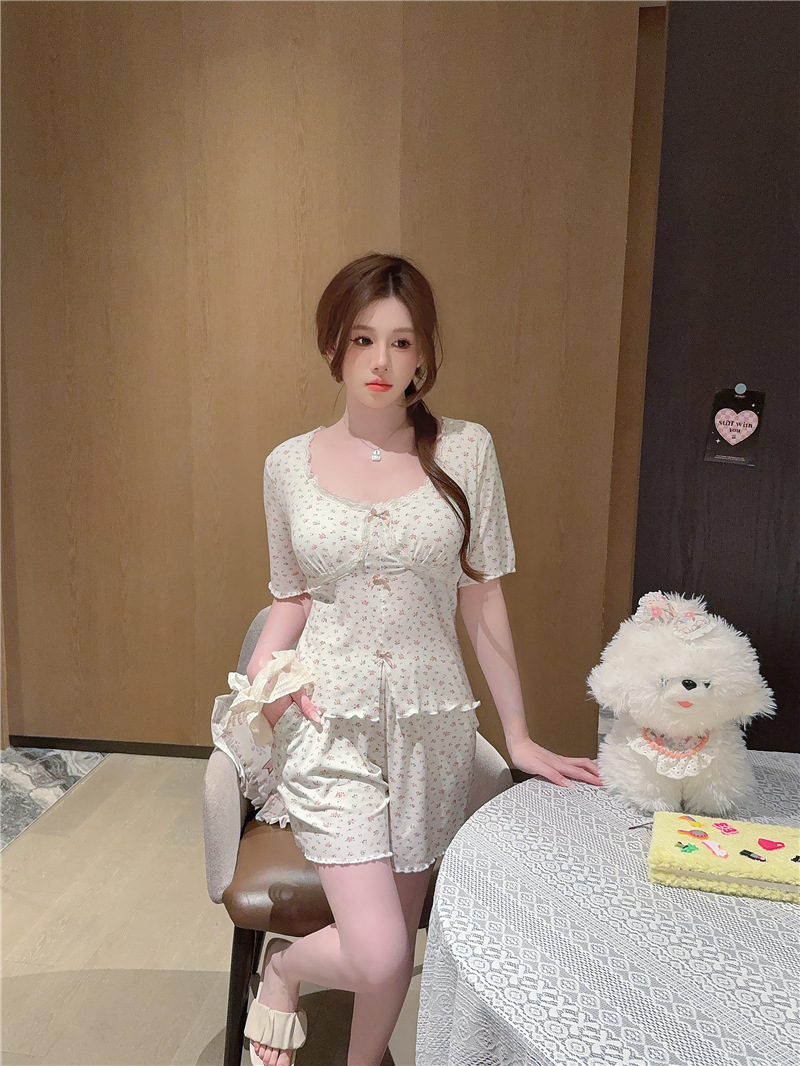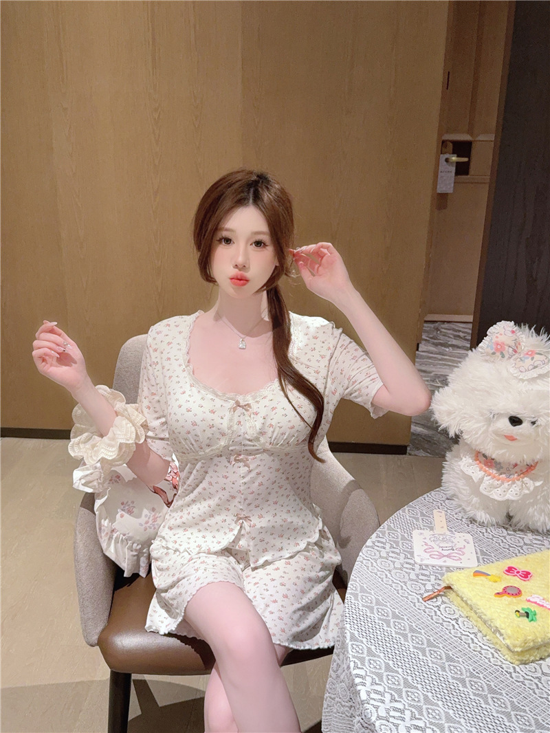 잠옷 여성의 봄과 여름 모데일면 꽃 달콤한 반팔 반바지 세트 아웃웨어 홈 의류 플러스 면화