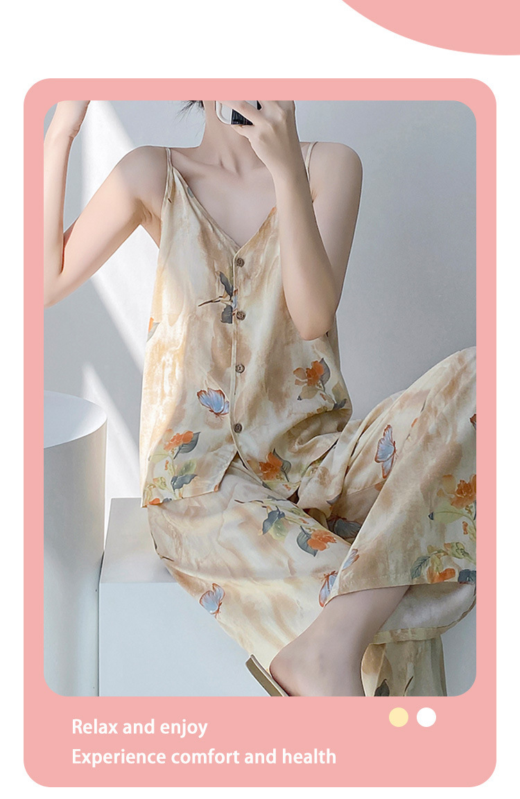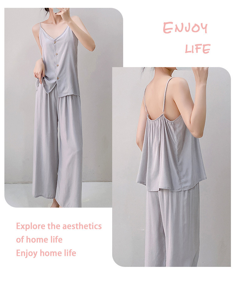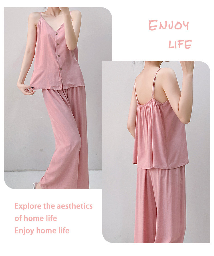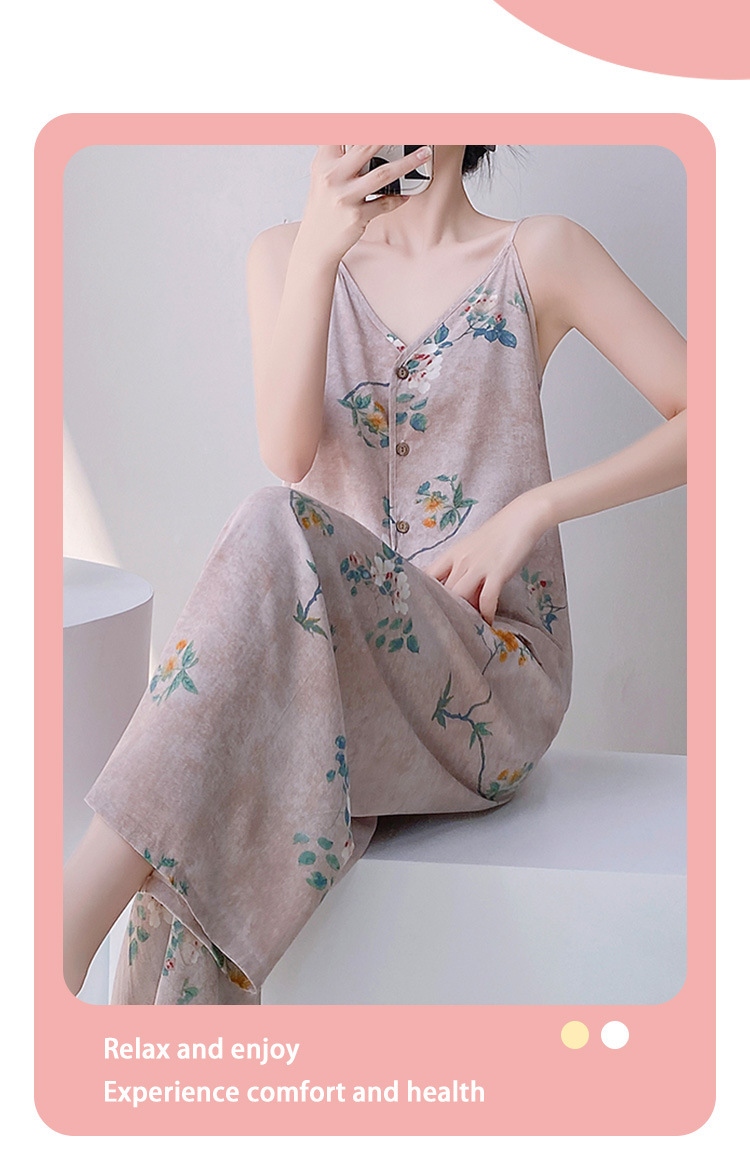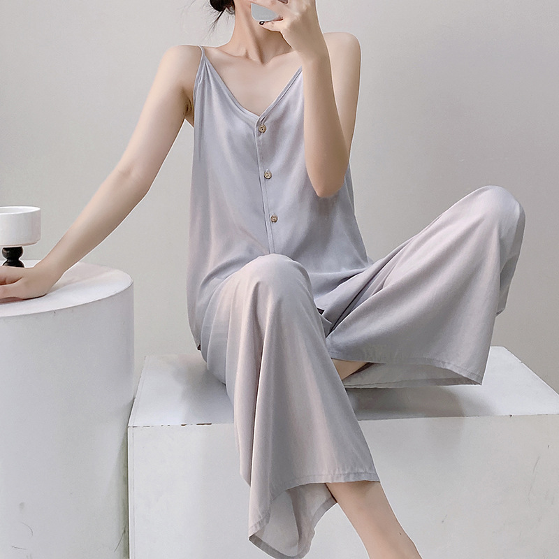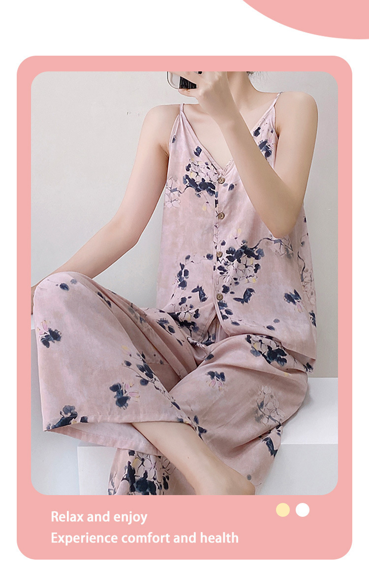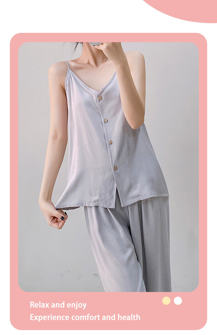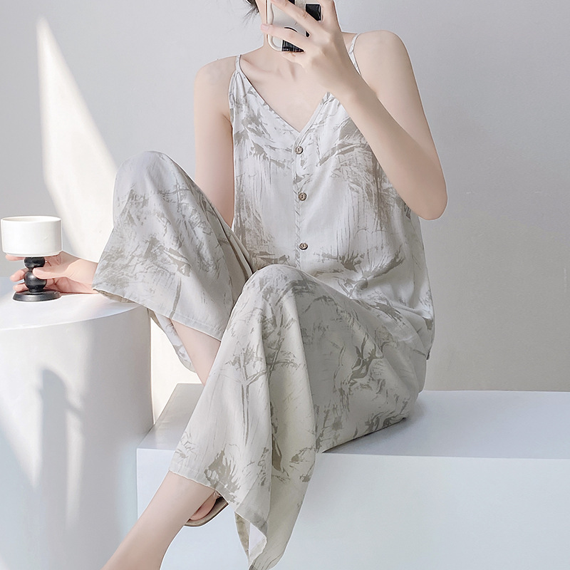 가벼운 럭셔리 코튼 실크 잠옷 여성의 봄 가을과 여름 투피스 슬링 홈 옷 느슨한 간단한 단색 카디건 세트