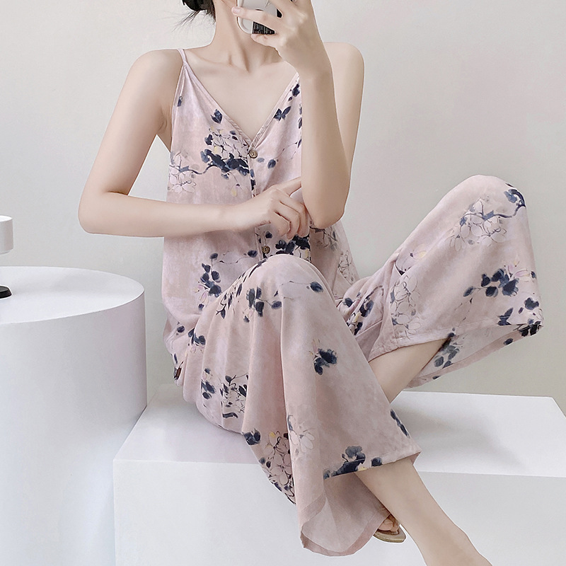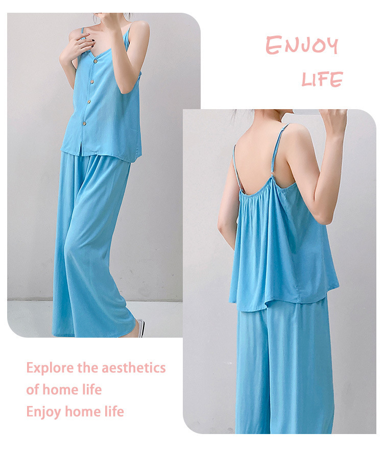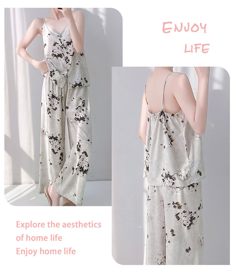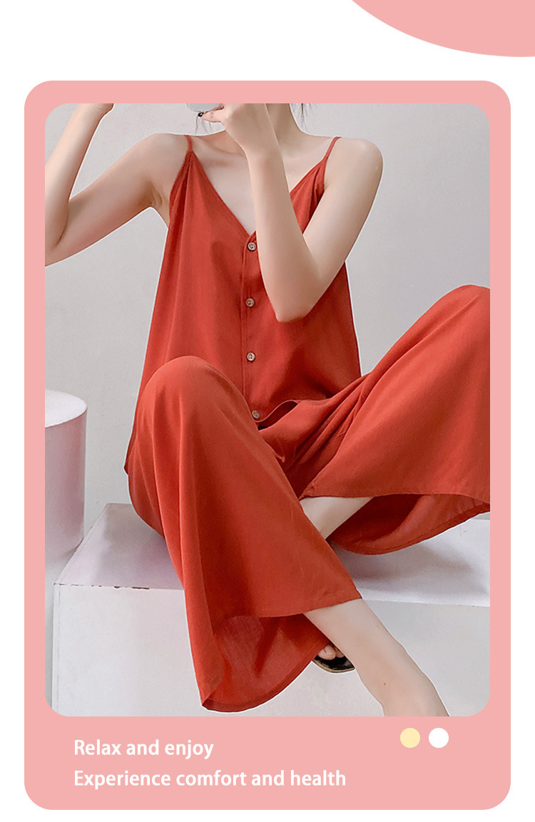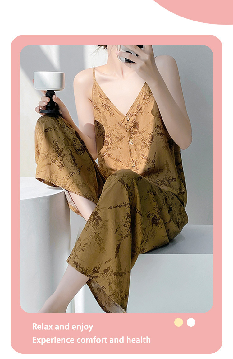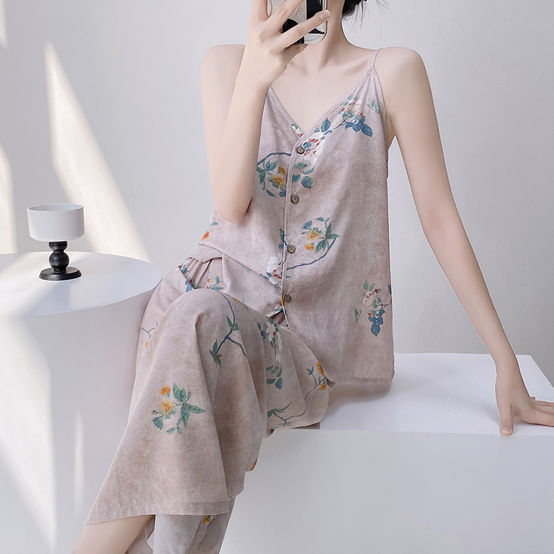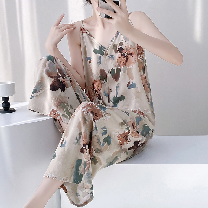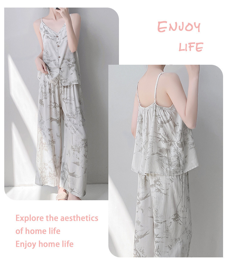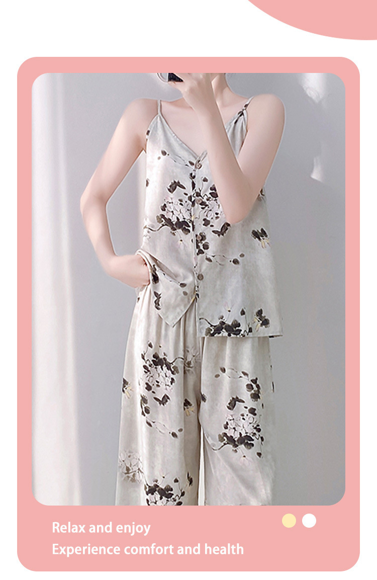 가벼운 럭셔리 코튼 실크 잠옷 여성의 봄 가을과 여름 투피스 슬링 홈 옷 느슨한 간단한 단색 카디건 세트
