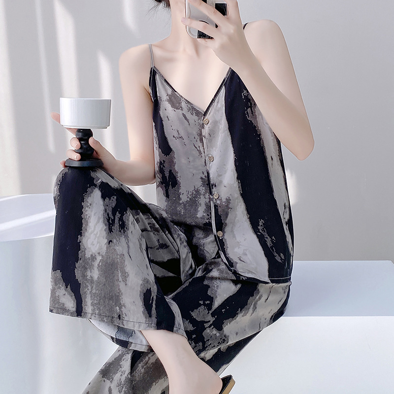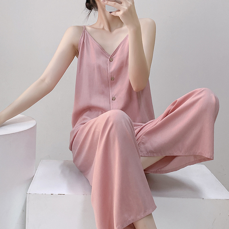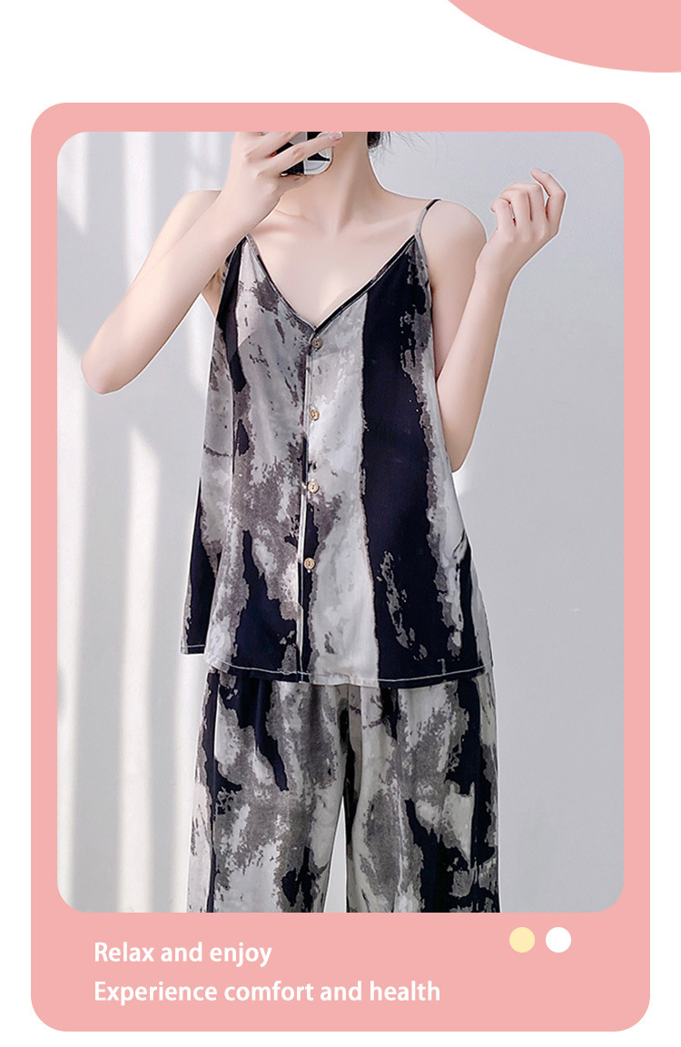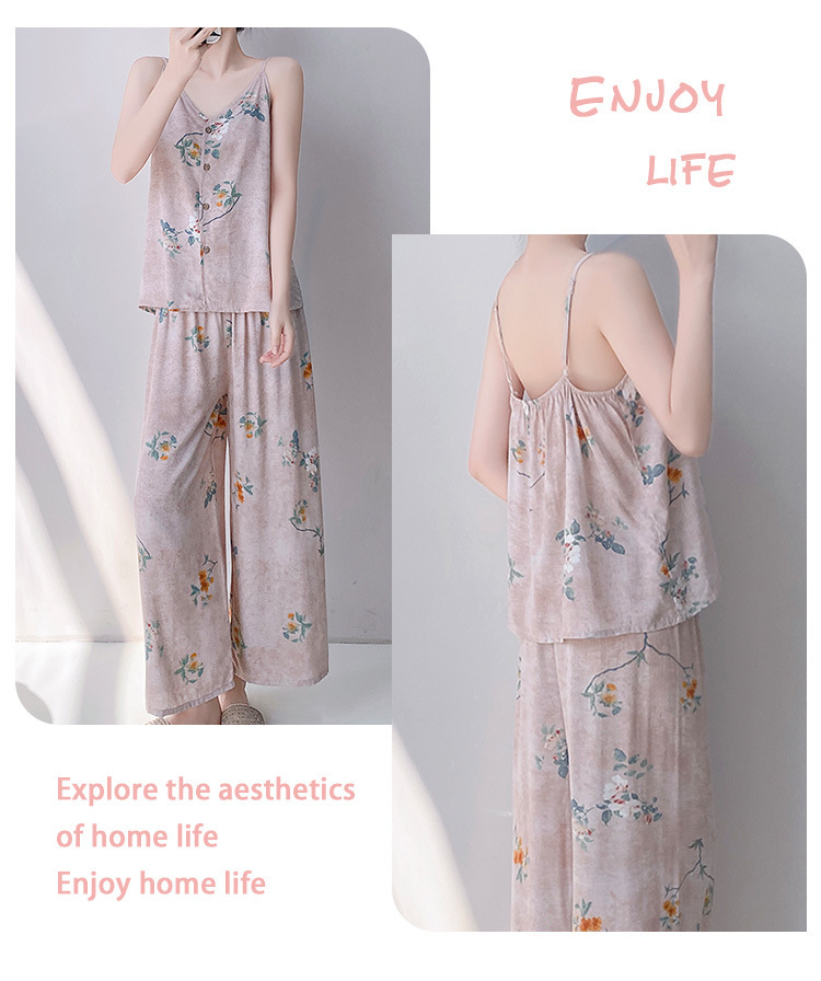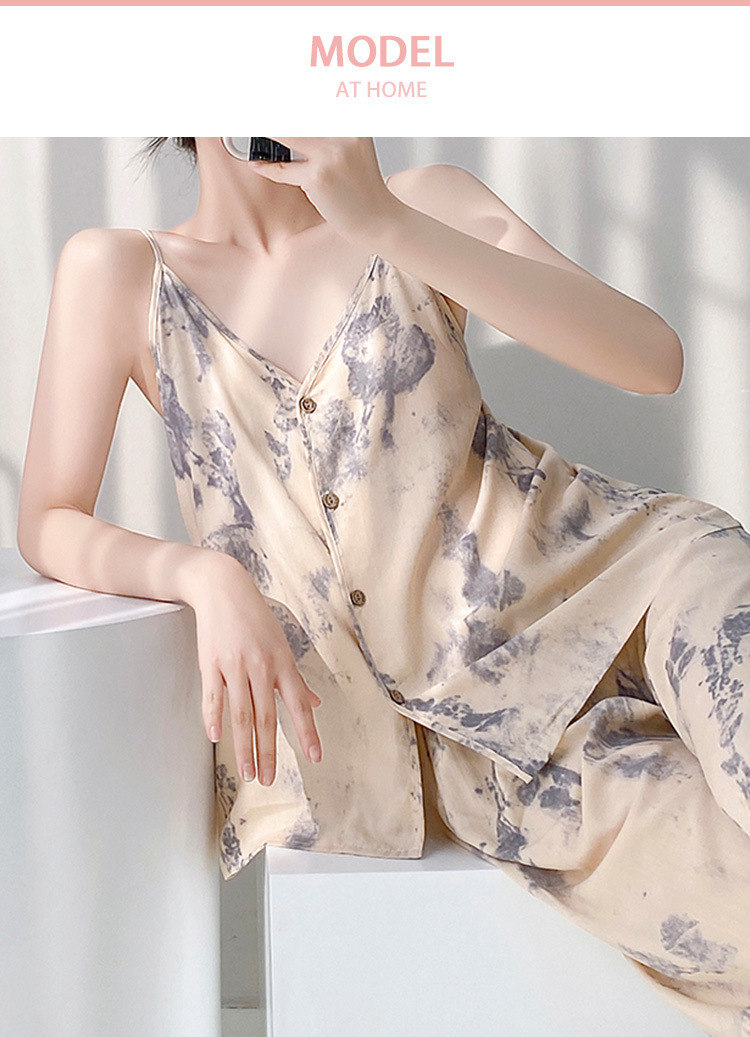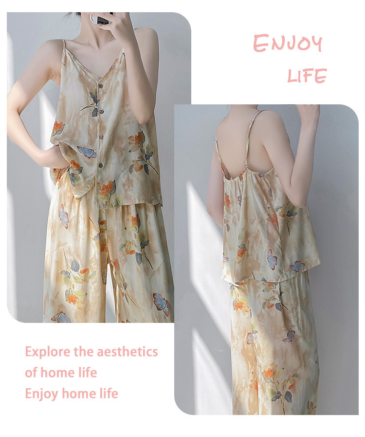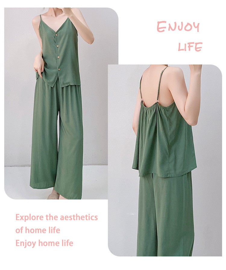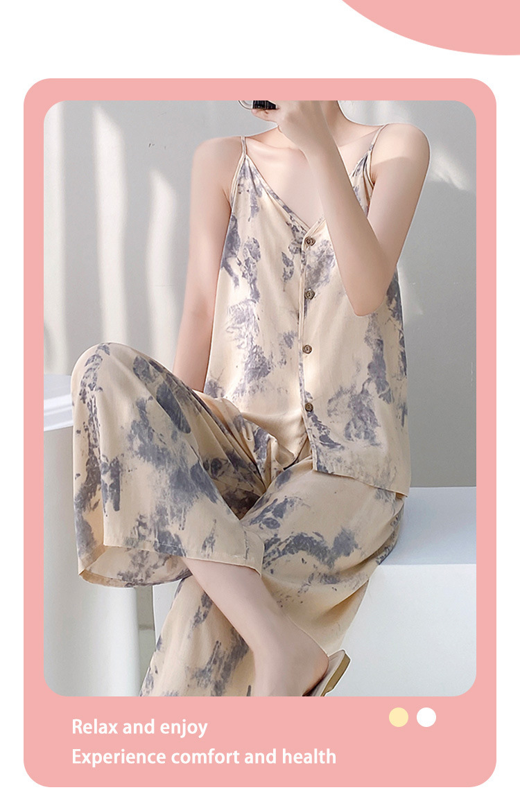 가벼운 럭셔리 코튼 실크 잠옷 여성의 봄 가을과 여름 투피스 슬링 홈 옷 느슨한 간단한 단색 카디건 세트