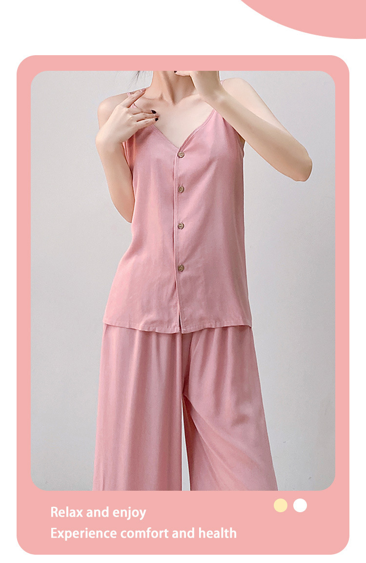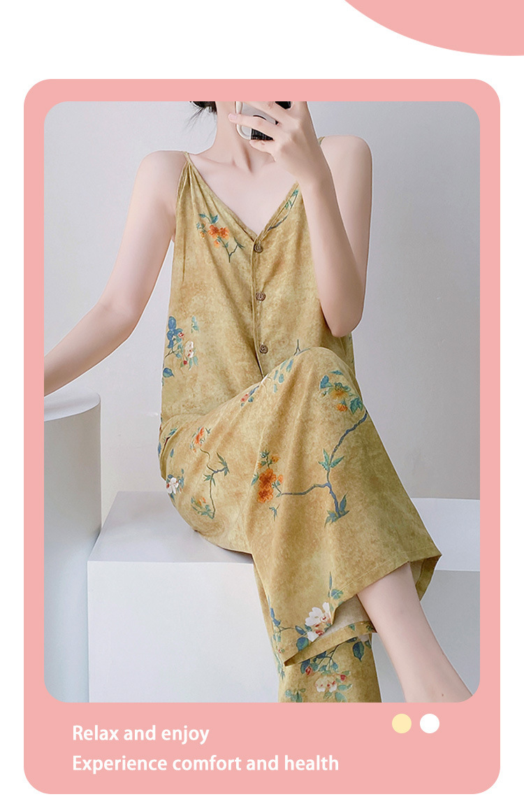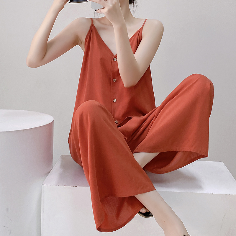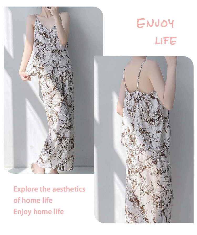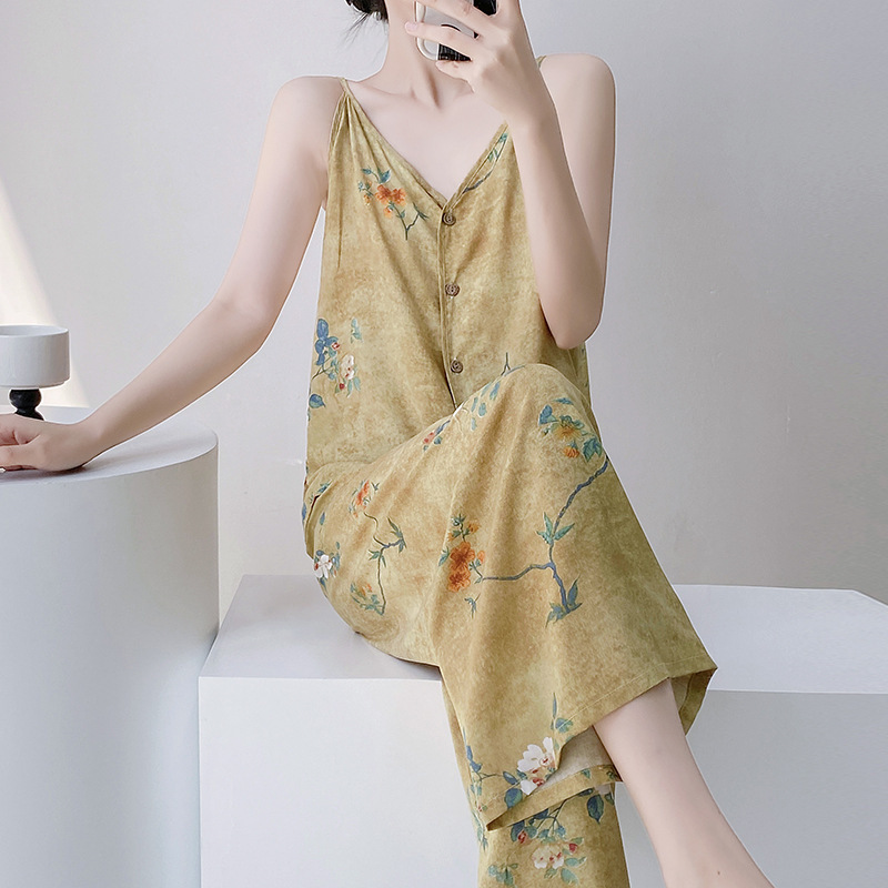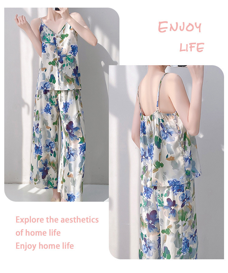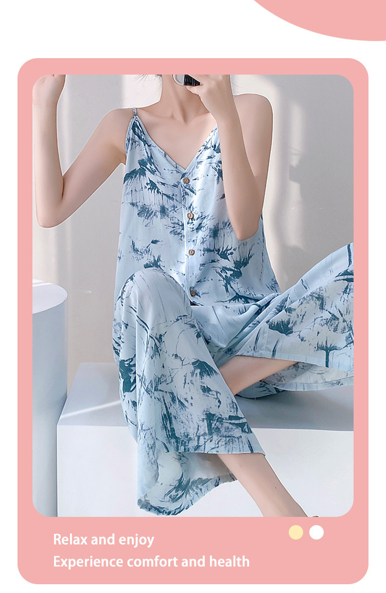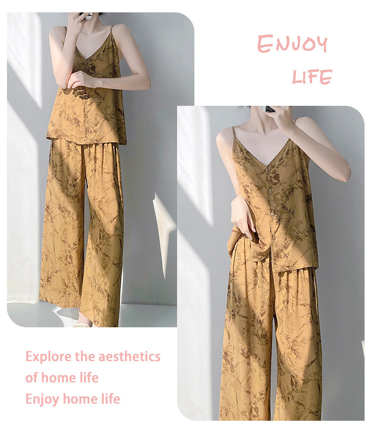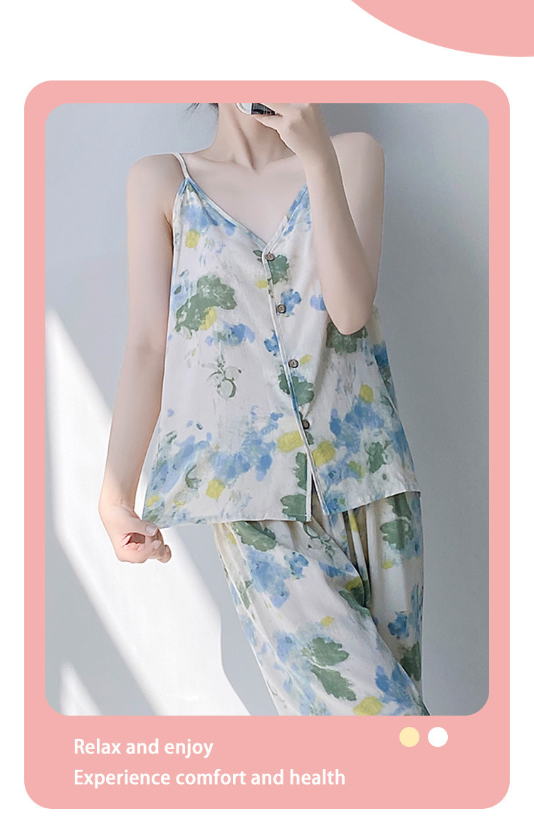 가벼운 럭셔리 코튼 실크 잠옷 여성의 봄 가을과 여름 투피스 슬링 홈 옷 느슨한 간단한 단색 카디건 세트